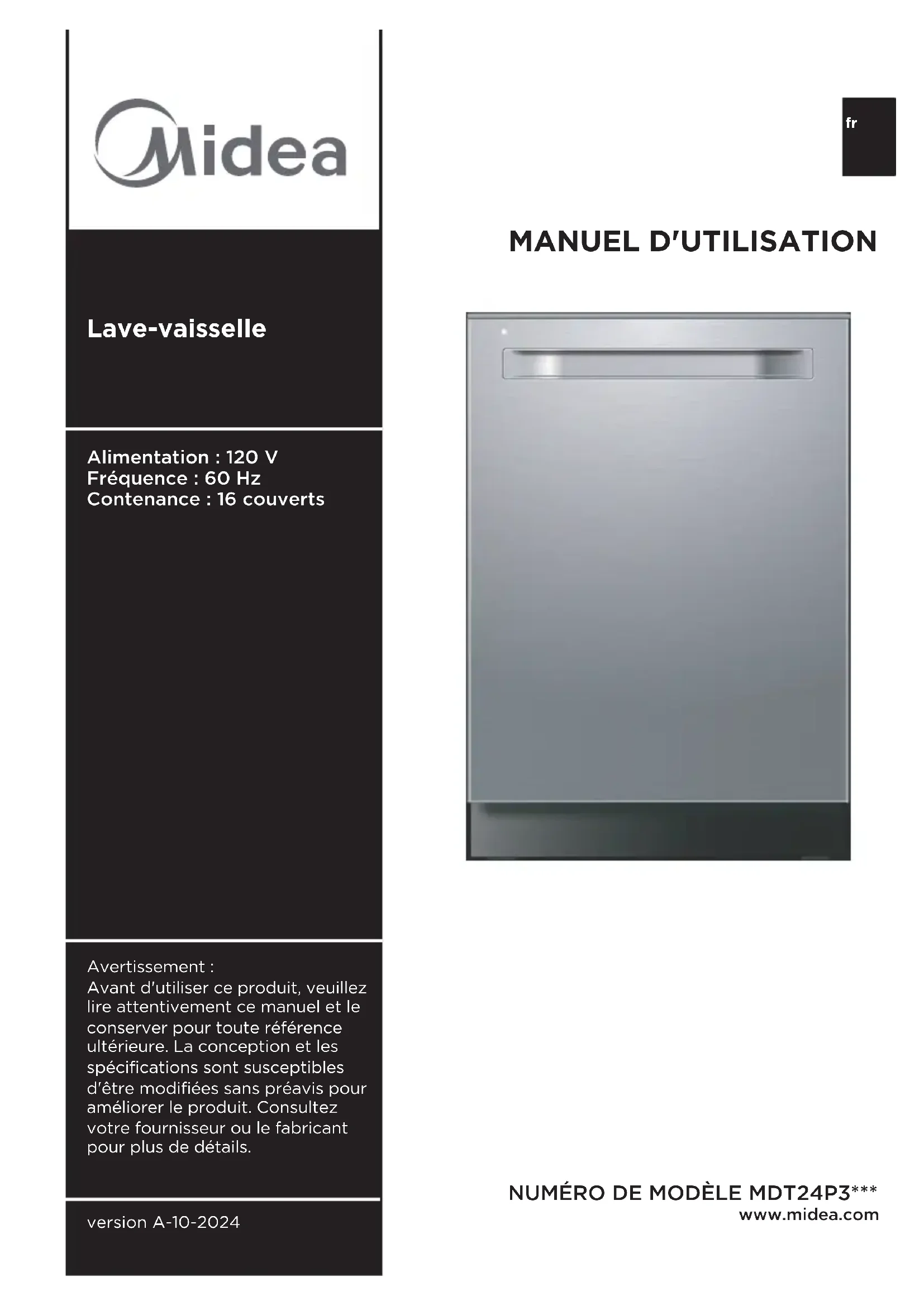 Cher(e) utilisateur(trice), MERCI et FÉLICITATIONS pour l’achat de ce produit Midea de haute qualité. Votre lave-vaisselle Midea représente l'état de l'art et est conçu pour vous offrir des performances à la fois fiables et sans problème. Veuillez prendre un moment pour enregistrer votre nouveau lave-vaisselle. Enregistrez votre nouveau lave-vaisselle à https://us.midea.com/support dans l'onglet Support (Assistance). Pour toute référence future, notez les numéros de modèle et de série de votre produit sur le cadre intérieur du lave-vaisselle. Numéro de modèle Numéro de série Chargement des suggestions............................................................. 18 Instructions de fonctionnement3 Précautions de sécuritéExigences de fonctionnementPièces et fonctionnalitésGuide de démarrageCommandesConfiguration et fonctionnement de l'applicationUtilisation du lave-vaisselleEntretien du lave-vaisselleDépannagePrécautions de sécuritéExigences de fonctionnementPièces et fonctionnalitésGuide de démarrageInstructions de fonctionnementConfiguration et fonctionnement de l'applicationUtilisation du lave-vaisselleEntretien du lave-vaisselleDépannage