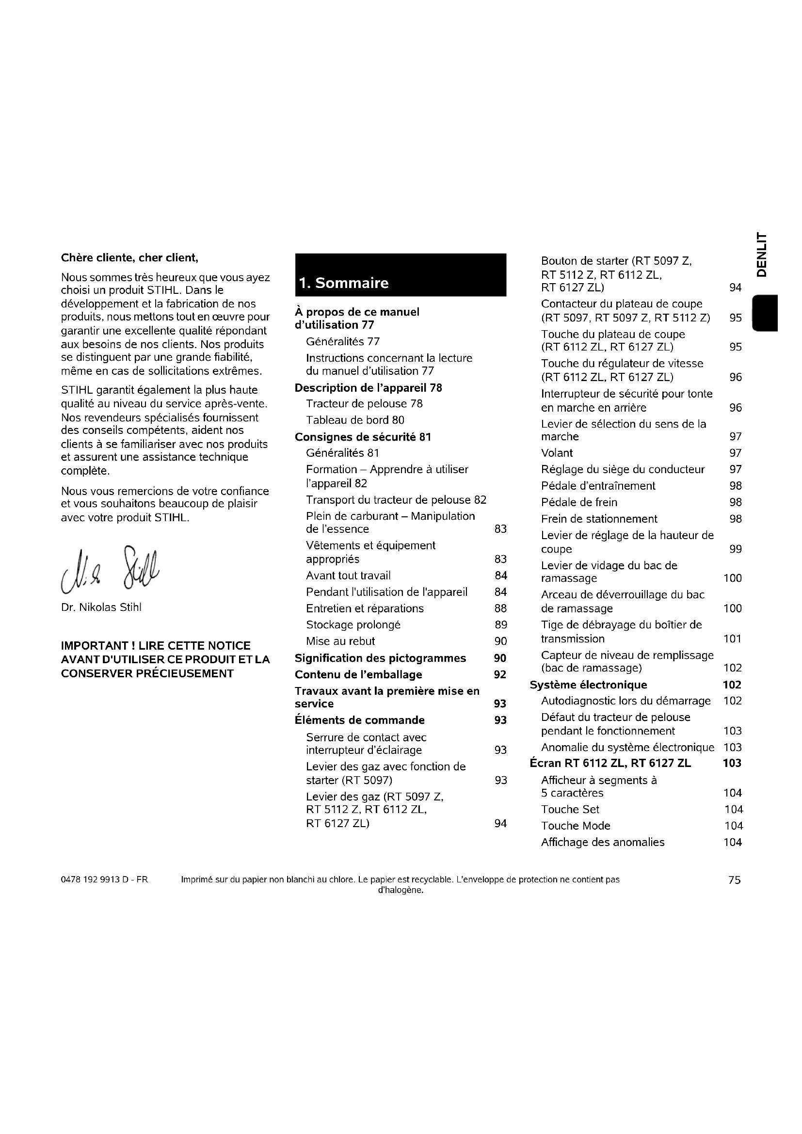 DENLIT FR 0478 192 9913 D - FR Chère cliente, cher client, Nous sommes très heureux que vous ayez choisi un produit STIHL. Dans le développement et la fabrication de nos produits, nous mettons tout en œuvre pour garantir une excellente qualité répondant aux besoins de nos clients. Nos produits se distinguent par une grande fiabilité, même en cas de sollicitations extrêmes. STIHL garantit également la plus haute qualité au niveau du service après-vente. Nos revendeurs spécialisés fournissent des conseils compétents, aident nos clients à se familiariser avec nos produits et assurent une assistance technique complète. Nous vous remercions de votre confiance et vous souhaitons beaucoup de plaisir avec votre produit STIHL. Dr. Nikolas Stihl