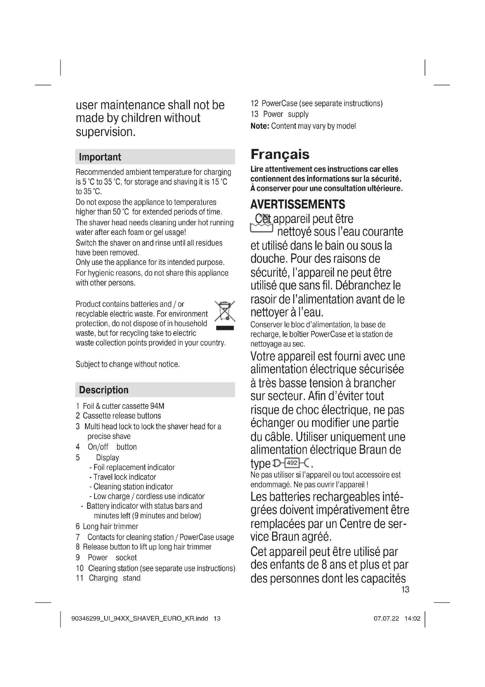 Ne pas utiliser si l’appareil ou tout accessoire est endommagé. Ne pas ouvrir l’appareil ! Les batteries rechargeables inté- grées doivent impérativement être remplacées par un Centre de ser- vice Braun agréé. Cet appareil peut être utilisé par des enfants de 8 ans et plus et par des personnes dont les capacités 90346299_UI_94XX_SHAVER_EURO_KR.indd 1390346299_UI_94XX_SHAVER_EURO_KR.indd 13 07.07.22 14:0207.07.22 14:0214 physiques, sensorielles ou men- tales sont réduites, ou des per- sonnes dénuées d’expérience ou de connaissances, si elles ont pu bénéficier, par l’intermédiaire d’une personne responsable de leur sécurité, d’une surveillance ou d’instructions préalables concernant l’utilisation de l’appa- reil en toute sécurité et les dan- gers encourus. Si l’appareil est fourni avec un accessoire tondeuse à cheveux, il peut être utilisé par des enfants âgés de 3ans et plus sous surveillance. Les enfants ne doivent pas jouer avec cet appareil. Les opérations de nettoyage et de maintenance ne doivent pas être effectuées par des enfants à moins qu’ils ne soient sous surveillance. Important La température ambiante recommandée pour la charge est comprise entre 5 à 35°C. Pour le range- ment et le rasage, entre 15 à 35°C. Ne pas soumettre l’appareil à une température supérieure à 50 °C pendant une durée prolongée. La tête de rasage doit être nettoyée à l’eau cou- rante chaude après chaque utilisation avec du gel ou de la mousse à raser ! Allumer le rasoir et rincer jusqu’à ce que tous les résidus soient éliminés. Utilisez l’appareil conformément à son usage prévu. Pour des raisons d’hygiène, ne pas partager l’appareil avec d’autres personnes. Ce produit contient des piles et / ou des déchets électriques recyclables. Pour la protection de l’environnement, ne pas jeter avec les ordures ménagères, mais les porter dans les points de recyclage de déchets électriques disponibles dans votre pays. Sujet à des modifications sans préavis. Description 1 Cassette de rasage94M 2 Boutons d’éjection de la cassette de rasage 3 Interrupteur Multi Head Lock pour verrouiller la tête du rasoir et obtenir un rasage précis 4 Bouton marche/arrêt 5 Affichage - Indicateur de changement de la grille - Indicateur de verrouillage pour les déplacements - Indicateur de station de nettoyage - Indicateur de faible charge / utilisation sans fil - Indicateur de batterie avec barres d’état et minutes restantes (9minutes et moins) 6 Tondeuse poils longs 7 Contacts pour station de nettoyage / Utilisation du boîtier PowerCase 8 Bouton d’ouverture pour soulever la tondeuse pour poils longs 9 Prise d’alimentation 10 Station de nettoyage (voir les instructions d’utilisation séparées) 11 Base de recharge 12 Boîtier PowerCase (voir instructions séparées) 13 Bloc d’alimentation Remarque : Le contenu peut varier selon le modèle Español Lea estas instrucciones completamente, ya que contienen información necesaria para su seguridad. Guárdelas para futuras consultas. 90346299_UI_94XX_SHAVER_EURO_KR.indd 1490346299_UI_94XX_SHAVER_EURO_KR.indd 14 07.07.22 14:0207.07.22 14:0215 ADVERTENCIAS Este aparato puede lavarse con agua y es apto para usarlo en la bañera o en la ducha. Por motivos de seguridad, solo puede utilizarse sin cable. No olvide desconectar la afeita- dora de la fuente de alimentación antes de usarla con agua. Mantener la fuente de alimentación, la base de carga, la PowerCase y la estación de limpieza secas. Este aparato está provisto de un cable de alimentación con trans- formador integrado SELV (Extra- bajo Voltaje de Seguridad). No reemplazar ni manipular nin- guno de sus componentes; de lo contrario podría correrse riesgo de descarga eléctrica. Utilizar únicamente fuentes de alimen- tación Braun del tipo