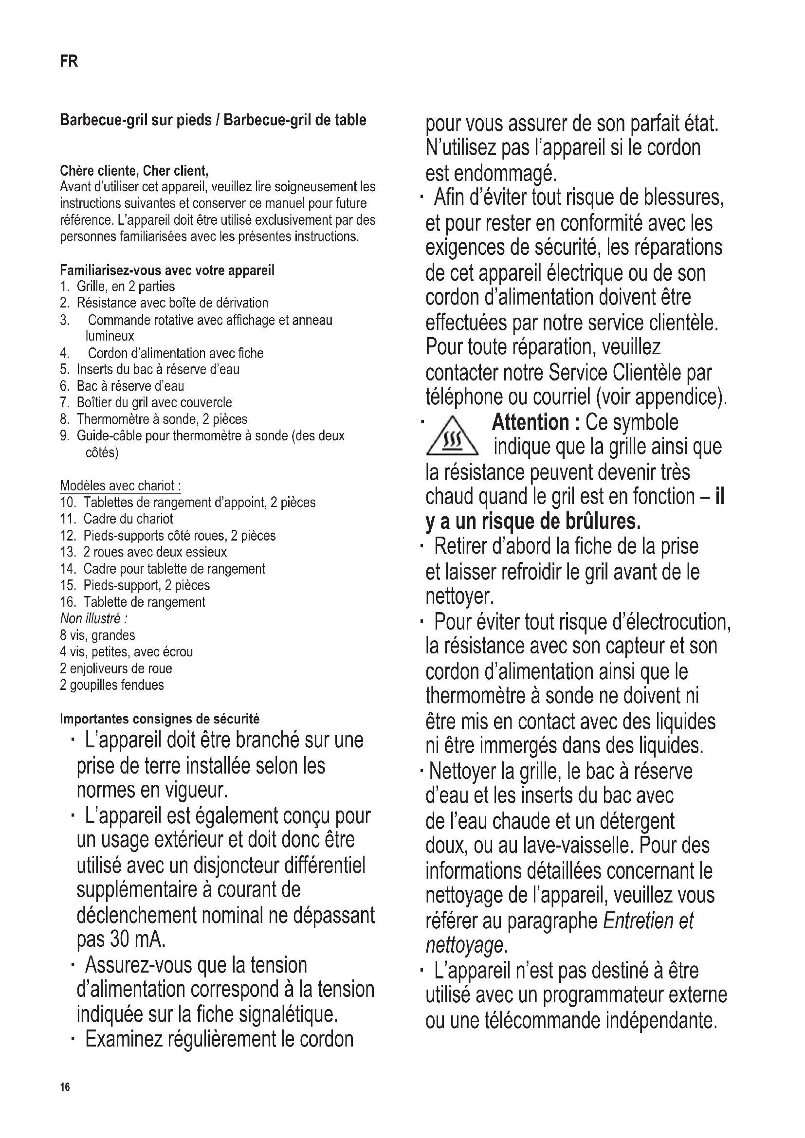 Non illustré : 8 vis, grandes 4 vis, petites, avec écrou 2 enjoliveurs de roue 2 goupilles fendues Importantes consignes de sécurité ∙ L’appareil doit être branché sur une prise de terre installée selon les normes en vigueur. ∙ L’appareil est également conçu pour un usage extérieur et doit donc être utilisé avec un disjoncteur différentiel supplémentaire à courant de déclenchement nominal ne dépassant pas 30 mA. ∙ Assurez-vous que la tension d’alimentation correspond à la tension indiquéesurlachesignalétique. ∙ Examinez régulièrement le cordon pour vous assurer de son parfait état. N’utilisez pas l’appareil si le cordon est endommagé. ∙ And’évitertoutrisquedeblessures, et pour rester en conformité avec les exigences de sécurité, les réparations de cet appareil électrique ou de son cordon d’alimentation doivent être effectuées par notre service clientèle. Pour toute réparation, veuillez contacter notre Service Clientèle par téléphone ou courriel (voir appendice).