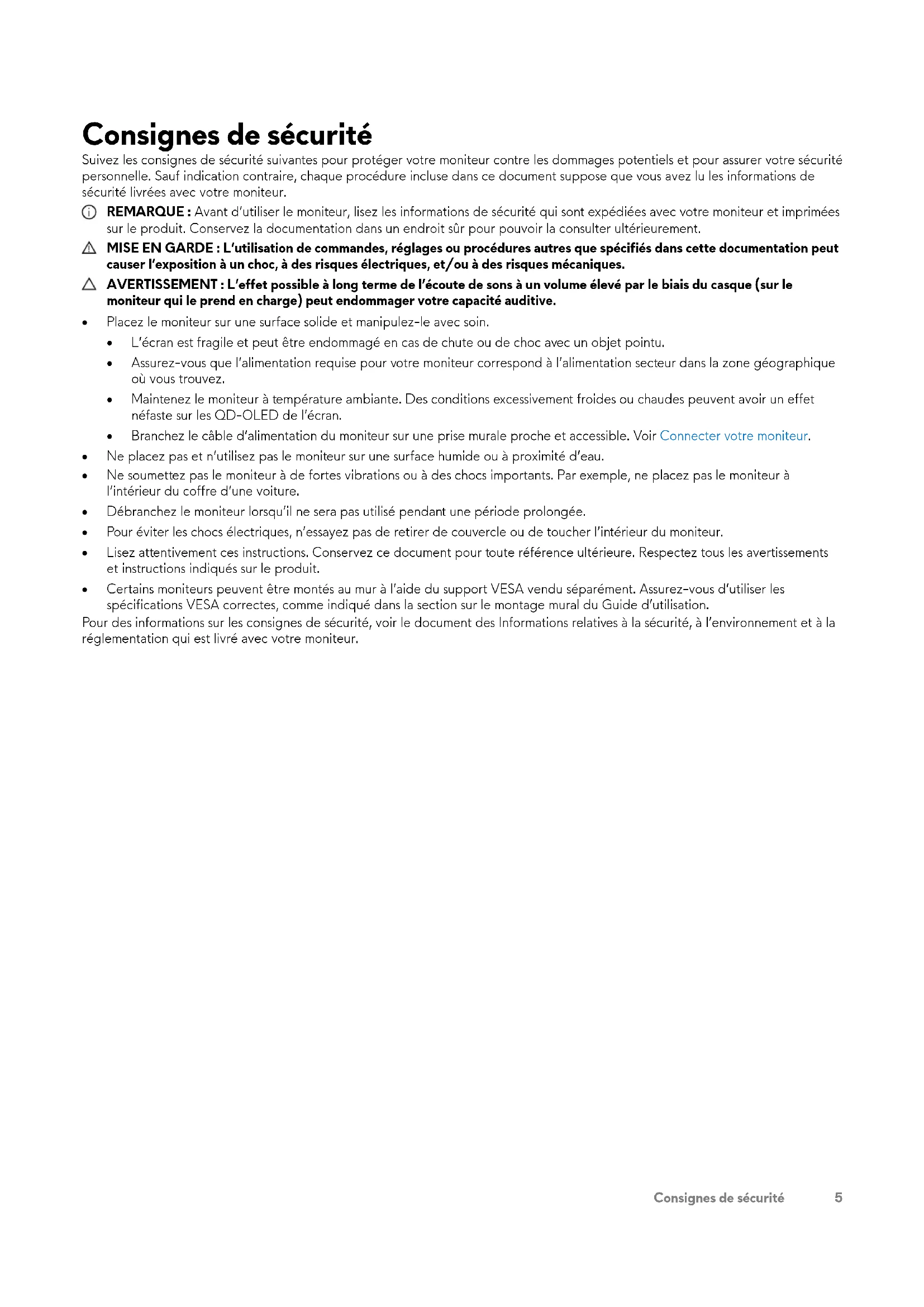 - Contacter Dell Consignes de sécurité Consignes de sécurité Suivez les consignes de sécurité suivantes pour protéger votre moniteur contre les dommages potentiels et pour assurer votre sécurité personnelle. Sauf indication contraire, chaque procédure incluse dans ce document suppose que vous avez lu les informations de sécurité livrées avec votre moniteur. REMARQUE : Avant d’utiliser le moniteur, lisez les informations de sécurité qui sont expédiées avec votre moniteur et imprimées sur le produit. Conservez la documentation dans un endroit sûr pour pouvoir la consulter ultérieurement. MISE EN GARDE : L’utilisation de commandes, réglages ou procédures autres que spécifiés dans cette documentation peut causer l’exposition à un choc, à des risques électriques, et/ou à des risques mécaniques. p. 835