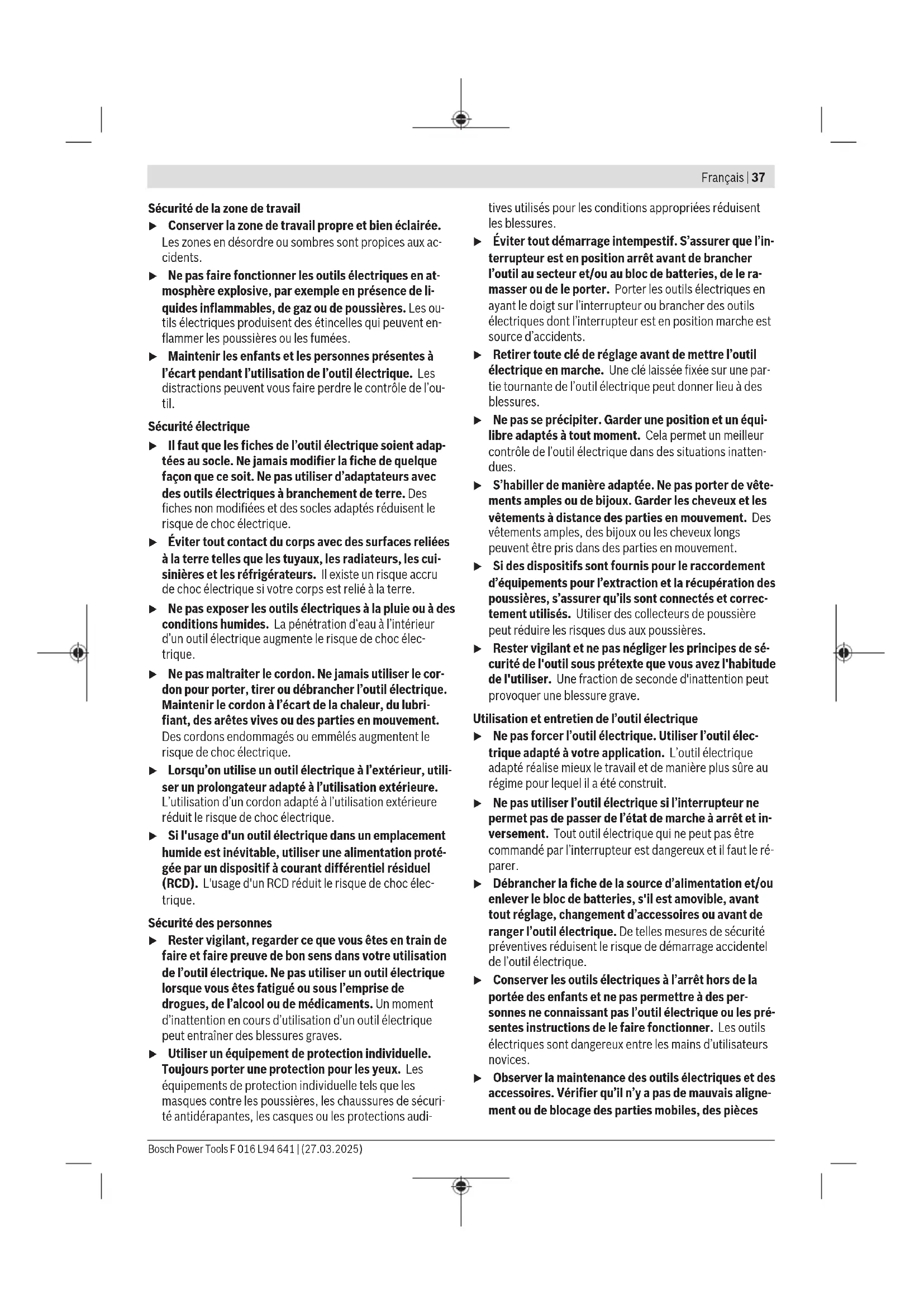 avant toute opération d’entretien. Avertissements de sécurité généraux pour l’outil électrique AVERTISSE- MENT Lire tous les avertissements de sé- curité, les instructions, les illustra- tions et les spécifications fournis avec cet outil électrique. Ne pas suivre les instructions énumérées ci-dessous peut provoquer un choc électrique, un incendie et/ou une blessure sérieuse. Conserver tous les avertissements et toutes les instruc- tions pour pouvoir s'y reporter ultérieurement. Le terme "outil électrique" dans les avertissements fait réfé- rence à votre outil électrique alimenté par le secteur (avec cordon d’alimentation) ou votre outil électrique fonctionnant sur batterie (sans cordon d’alimentation). F 016 L94 641 | (27.03.2025) Bosch Power ToolsFrançais | 37 Sécurité de la zone de travail u Conserver la zone de travail propre et bien éclairée. Les zones en désordre ou sombres sont propices aux ac- cidents. u Ne pas faire fonctionner les outils électriques en at- mosphère explosive, par exemple en présence de li- quides inflammables, de gaz ou de poussières. Les ou- tils électriques produisent des étincelles qui peuvent en- flammer les poussières ou les fumées. u Maintenir les enfants et les personnes présentes à l’écart pendant l’utilisation de l’outil électrique. Les distractions peuvent vous faire perdre le contrôle de l’ou- til. Sécurité électrique u Il faut que les fiches de l’outil électrique soient adap- tées au socle. Ne jamais modifier la fiche de quelque façon que ce soit. Ne pas utiliser d’adaptateurs avec des outils électriques à branchement de terre. Des fiches non modifiées et des socles adaptés réduisent le risque de choc électrique. u Éviter tout contact du corps avec des surfaces reliées à la terre telles que les tuyaux, les radiateurs, les cui- sinières et les réfrigérateurs. Il existe un risque accru de choc électrique si votre corps est relié à la terre. u Ne pas exposer les outils électriques à la pluie ou à des conditions humides. La pénétration d‘eau à l’intérieur d’un outil électrique augmente le risque de choc élec- trique. u Ne pas maltraiter le cordon. Ne jamais utiliser le cor- don pour porter, tirer ou débrancher l’outil électrique. Maintenir le cordon à l’écart de la chaleur, du lubri- fiant, des arêtes vives ou des parties en mouvement. Des cordons endommagés ou emmêlés augmentent le risque de choc électrique. u Lorsqu’on utilise un outil électrique à l’extérieur, utili- ser un prolongateur adapté à l’utilisation extérieure. L’utilisation d’un cordon adapté à l’utilisation extérieure réduit le risque de choc électrique. u Si l'usage d'un outil électrique dans un emplacement humide est inévitable, utiliser une alimentation proté- gée par un dispositif à courant différentiel résiduel (RCD). L'usage d'un RCD réduit le risque de choc élec- trique. Sécurité des personnes u Rester vigilant, regarder ce que vous êtes en train de faire et faire preuve de bon sens dans votre utilisation de l’outil électrique. Ne pas utiliser un outil électrique lorsque vous êtes fatigué ou sous l’emprise de drogues, de l’alcool ou de médicaments. Un moment d’inattention en cours d’utilisation d’un outil électrique peut entraîner des blessures graves. u Utiliser un équipement de protection individuelle. Toujours porter une protection pour les yeux. Les équipements de protection individuelle tels que les masques contre les poussières, les chaussures de sécuri- té antidérapantes, les casques ou les protections audi- tives utilisés pour les conditions appropriées réduisent les blessures. u Éviter tout démarrage intempestif. S’assurer que l’in- terrupteur est en position arrêt avant de brancher l’outil au secteur et/ou au bloc de batteries, de le ra- masser ou de le porter. Porter les outils électriques en ayant le doigt sur l’interrupteur ou brancher des outils électriques dont l’interrupteur est en position marche est source d’accidents. u Retirer toute clé de réglage avant de mettre l’outil électrique en marche. Une clé laissée fixée sur une par- tie tournante de l’outil électrique peut donner lieu à des blessures. u Ne pas se précipiter. Garder une position et un équi- libre adaptés à tout moment. Cela permet un meilleur contrôle de l’outil électrique dans des situations inatten- dues. u S’habiller de manière adaptée. Ne pas porter de vête- ments amples ou de bijoux. Garder les cheveux et les vêtements à distance des parties en mouvement. Des vêtements amples, des bijoux ou les cheveux longs peuvent être pris dans des parties en mouvement. u Si des dispositifs sont fournis pour le raccordement d’équipements pour l’extraction et la récupération des poussières, s’assurer qu’ils sont connectés et correc- tement utilisés. Utiliser des collecteurs de poussière peut réduire les risques dus aux poussières. u Rester vigilant et ne pas négliger les principes de sé- curité de l'outil sous prétexte que vous avez l'habitude de l'utiliser. Une fraction de seconde d'inattention peut provoquer une blessure grave. Utilisation et entretien de l’outil électrique u Ne pas forcer l’outil électrique. Utiliser l’outil élec- trique adapté à votre application. L’outil électrique adapté réalise mieux le travail et de manière plus sûre au régime pour lequel il a été construit. u Ne pas utiliser l’outil électrique si l’interrupteur ne permet pas de passer de l’état de marche à arrêt et in- versement. Tout outil électrique qui ne peut pas être commandé par l’interrupteur est dangereux et il faut le ré- parer. u Débrancher la fiche de la source d’alimentation et/ou enlever le bloc de batteries, s'il est amovible, avant tout réglage, changement d’accessoires ou avant de ranger l’outil électrique. De telles mesures de sécurité p