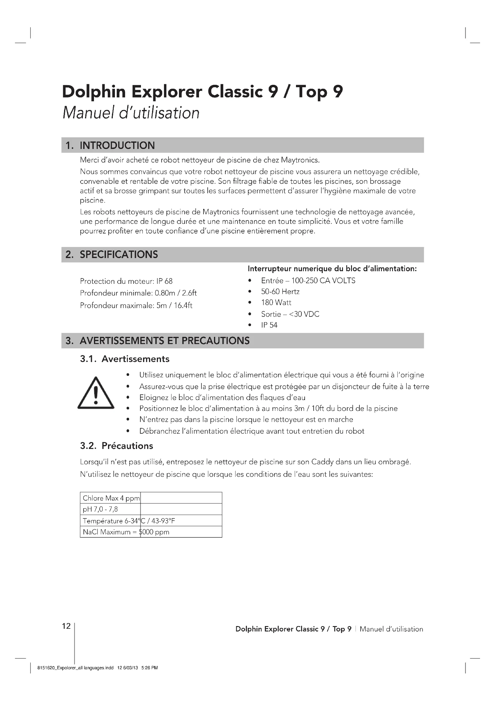 - Utilisez uniquement le bloc d’alimentation électrique qui vous a été fourni à l’origine• Assurez-vous que la prise électrique est protégée par un disjoncteur de fuite à la terre• Eloignez le bloc d’alimentation des flaques d’eau• Positionnez le bloc d’alimentation à au moins 3m / 10ft du bord de la piscine• N’entrez pas dans la piscine lorsque le nettoyeur est en marche• Débranchez l’alimentation électrique avant tout entretien du robot 3.2. Précautions Lorsqu’il n’est pas utilisé, entreposez le nettoyeur de piscine sur son Caddy dans un lieu ombragé.N’utilisez le nettoyeur de piscine que lorsque les conditions de l’eau sont les suivantes:Chlore Max 4 ppmpH 7,0 - 7,8Température 6-34°C / 43-93°FNaCl Maximum = 5000 ppm CAUTION Interrupteur numerique du bloc d’alimentation: • Entrée – 100-250 CA VOLTS• 50-60 Hertz• 180 Watt• Sortie – <30 VDC • IP 548151620_Expolorer_all languages.indd 12 6/03/13 5:26 PM13 Dolphin Explorer Classic 9 / Top 9 | Manuel d’utilisation