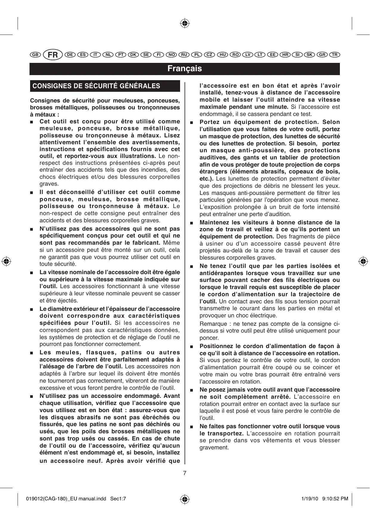 Remarque: si l'outil ne peut pas etre utiliser comme meuleuse ou tronconneuse a metaux, ne tenez pas compte des consignes ci-apres.
