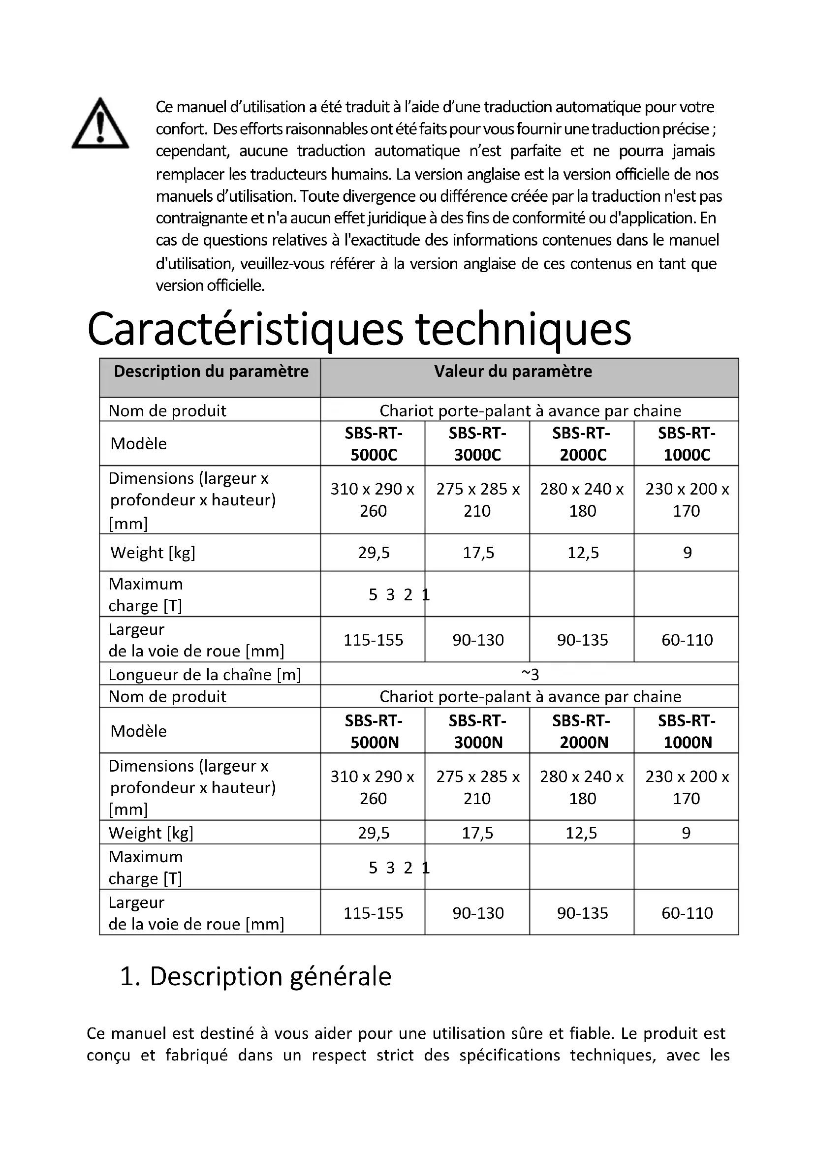 - Vérifiez l'état technique de l'appareil. Faites attention à tout dommage, fissure ou pièce détachée. Seul un appareil entièrement opérationnel peut être utilisé. - Mesurez la largeur du rail sur lequel l'appareil fonctionnera. - Espacer uniformément les plaques latérales, en remplissant les espaces libres sur l'arbre avec des entretoises. La largeur du rail doit être (au maximum) 6 mm plus grande que la largeur du rail sur lequel l'appareil va fonctionner. IMPORTANT : il doit y avoir au moins une entretoise de chaque côté de la plaque. - Serrez fermement les deux écrous hexagonaux. - Assurez-vous que l'unité est bien près du rail, que chaque roue roule librement et maintient un bon contact avec la surface du rail, et que les plaques latérales sont parallèles. - La partie inférieure de la chaîne doit se trouver à une hauteur de 100-500 mm du sol (uniquement pour les modèles avec leur propre entraînement par chaîne : SBS- RT-5000C, SBS-RT-3000C, SBS-RT-2000C, SBS-RT-1000C). NOTE : Avant la première utilisation, après avoir assemblé l'unité, vérifiez son fonctionnement en suspendant une charge légère et en faisant rouler l'unité le long du rail. 3.3. Nettoyage et entretien a) Attendez que les pièces en rotation s'arrêtent. b) Pour nettoyer la surface, n’utilisez que des produits libres de substances caustiques. c) Après chaque nettoyage, séchez tous les composants avant de réutiliser l’appareil. d) Conservez l’appareil dans un endroit sec et frais, à l’abri de l’humidité et des rayons directs du soleil. e) Il est interdit de tremper l’appareil avec un jet d’eau ou de l’immerger dans l’eau. f) Effectuez des inspections régulières de l'unité, en vérifiant son aptitude technique et ses éventuels dommages. g) La surface des roulements et des chenilles (ainsi que la boîte de vitesses sur les SBS-RT-5000C / SBS-RT-3000C / SBS-RT-2000C / SBS-RT-1000C) doit être périodiquement lubrifiée avec de la graisse. h) Veillez à ce que l'appareil reste propre et à ce que ses pièces mobiles soient lubrifiées.Dati tecnici Descrizione del parametro Valore del parametro Nome del prodotto Carrello portaparanco Modello SBS-RT- 5000C SBS-RT- 3000C SBS-RT- 2000C SBS-RT- 1000C Dimensioni (larghezza x profondità x altezza) [ mm] 310 x 290 x