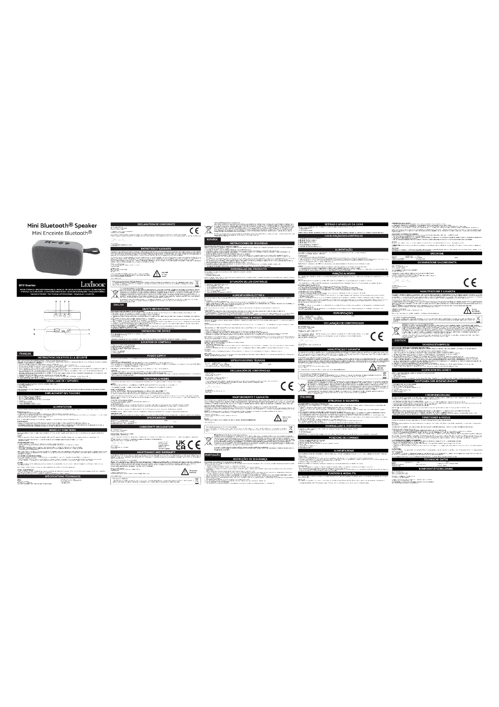 Nous, Lexibook® S.A.Bât 11., 6 avenue des Andes91940 Les Ulis – FranceDésignation : Mini Enceinte Bluetooth®Référence : BT018series Le soussigné, Lexibook Limited, déclare que l’équipement radioélectrique du type BT018series est conforme à la directive 2014/53/UE. Le texte complet de la déclaration UE de conformité est disponible à l’adresse internet suivante: internet address: http://www.lexibook.com/doc/bt018/bt018_3.pdf Yiu Wai ManDirecteur du développement du produitHong Kong Assurez-vous d’éteindre l’appareil et de débrancher le câble d’alimentation avant de le nettoyer. Essuyez cet appareil avec un chiffon sec et souple. Si les surfaces sont extrêmement sales, nettoyez les avec un chiffon qui a été trempé dans une solution eau et savon puis essoré fermement. Essuyez une nouvelle fois avec un chiffon sec. N’utilisez jamais d’alcool, d’essence, de dissolvant, liquides nettoyants ou autres produits chimiques. Et n’utilisez pas d’air comprimé pour enlever la poussière. Chargez le haut-parleur Bluetooth® au moins une fois tous les trois mois pour prolonger la durée de vie de la batterie. Ce produit est couvert par notre garantie de 2 ans. Pour toute mise en oeuvre de la garantie ou de service après-vente, vous devez vous adresser à votre revendeur muni de votre preuve d’achat. Notre garantie couvre les vices de matériel ou de montage imputables au constructeur à l’exclusion de toute détérioration provenant du non-respect de la notice d’utilisation ou de toute intervention intempestive sur l’article (telle que démontage, exposition à la chaleur ou à l’humidité…). NOTE : Veuillez garder ce mode d’emploi, il contient d’importantes informations. Le contenu de ce mode d’emploi peut changer sans préavis. Aucune partie de ce mode d’emploi ne doit être reproduite sans le consentement écrit du fabricant.Référence : BT018seriesConçu et développé en Europe – Fabriqué en Chine©LEXIBOOK®Lexibook S.A. Bât 11., 6 avenue des Andes 91940 Les Ulis France La valeur du débit d’absorption spécifique est en dessous de 20mW.Pour vos demandes concernant un problème SAV ou une réclamation,écrivez à savcomfr@lexibook.com www.lexibook.com