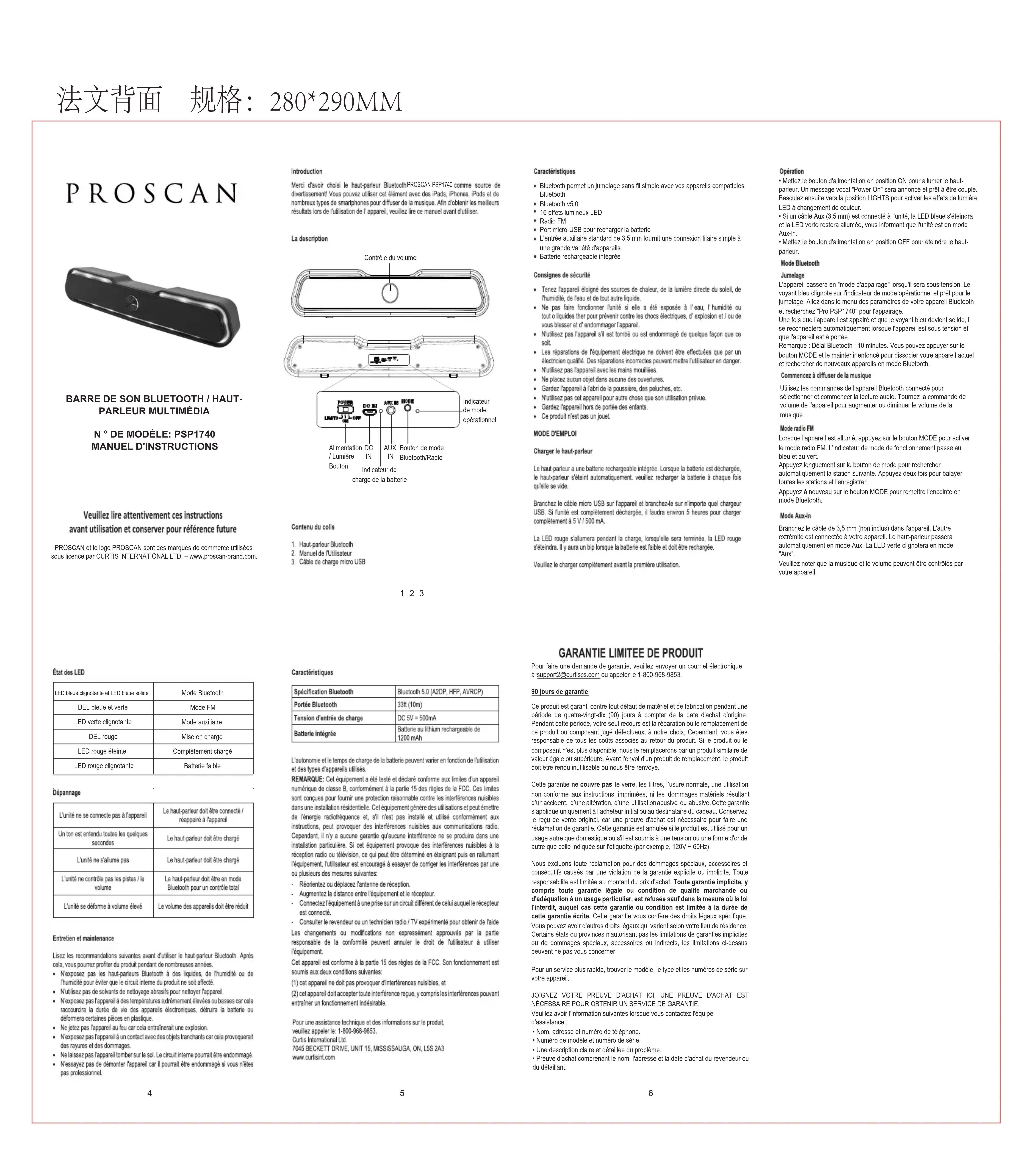 MANUEL D'INSTRUCTIONS PROSCAN et le logo PROSCAN sont des marques de commerce utilisées sous licence par CURTIS INTERNATIONAL LTD. – www.proscan-brand.com. PROSCAN PSP1740 Pour faire une demande de garantie, veuillez envoyer un courriel électronique à support2@curtiscs.com ou appeler le 1-800-968-9853. 90 jours de garantie Ce produit est garanti contre tout défaut de matériel et de fabrication pendant une période de quatre-vingt-dix (90) jours à compter de la date d'achat d'origine. Pendant cette période, votre seul recours est la réparation ou le remplacement de ce produit ou composant jugé défectueux, à notre choix; Cependant, vous êtes responsable de tous les coûts associés au retour du produit. Si le produit ou le composant n'est plus disponible, nous le remplacerons par un produit similaire de valeur égale ou supérieure. Avant l'envoi d'un produit de remplacement, le produit doit être rendu inutilisable ou nous être renvoyé. Cette garantie ne couvre pas le verre, les filtres, l’usure normale, une utilisation non conforme aux instructions imprimées,
