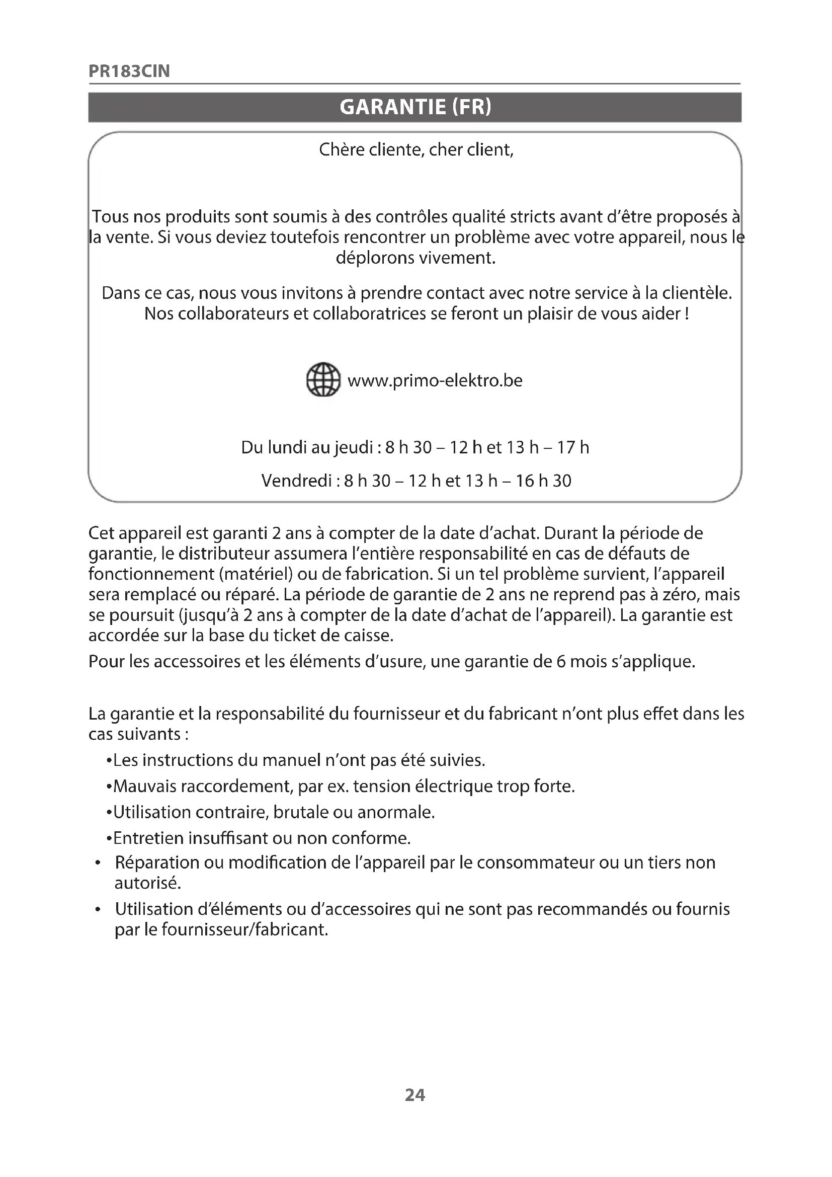 GARANTIE (FR) Chère cliente, cher client, Tous nos produits sont soumis à des contrôles qualité stricts avant d’être proposés à la vente. Si vous deviez toutefois rencontrer un problème avec votre appareil, nous le déplorons vivement. Dans ce cas, nous vous invitons à prendre contact avec notre service à la clientèle. Nos collaborateurs et collaboratrices se feront un plaisir de vous aider ! www.primo-elektro.be Du lundi au jeudi : 8 h 30 – 12 h et 13 h – 17 h Vendredi : 8 h 30 – 12 h et 13 h – 16 h 30 Cet appareil est garanti 2 ans à compter de la date d’achat. Durant la période de garantie, le distributeur assumera l’entière responsabilité en cas de défauts de fonctionnement (matériel) ou de fabrication. Si un tel problème survient, l’appareil sera remplacé ou réparé. La période de garantie de 2 ans ne reprend pas à zéro, mais se poursuit (jusqu’à 2 ans à compter de la date d’achat de l’appareil). La garantie est accordée sur la base du ticket de caisse. Pour les accessoires et les éléments d’usure, une garantie de 6 mois s’applique. La garantie et la responsabilité du fournisseur et du fabricant n’ont plus eet dans les cas suivants :