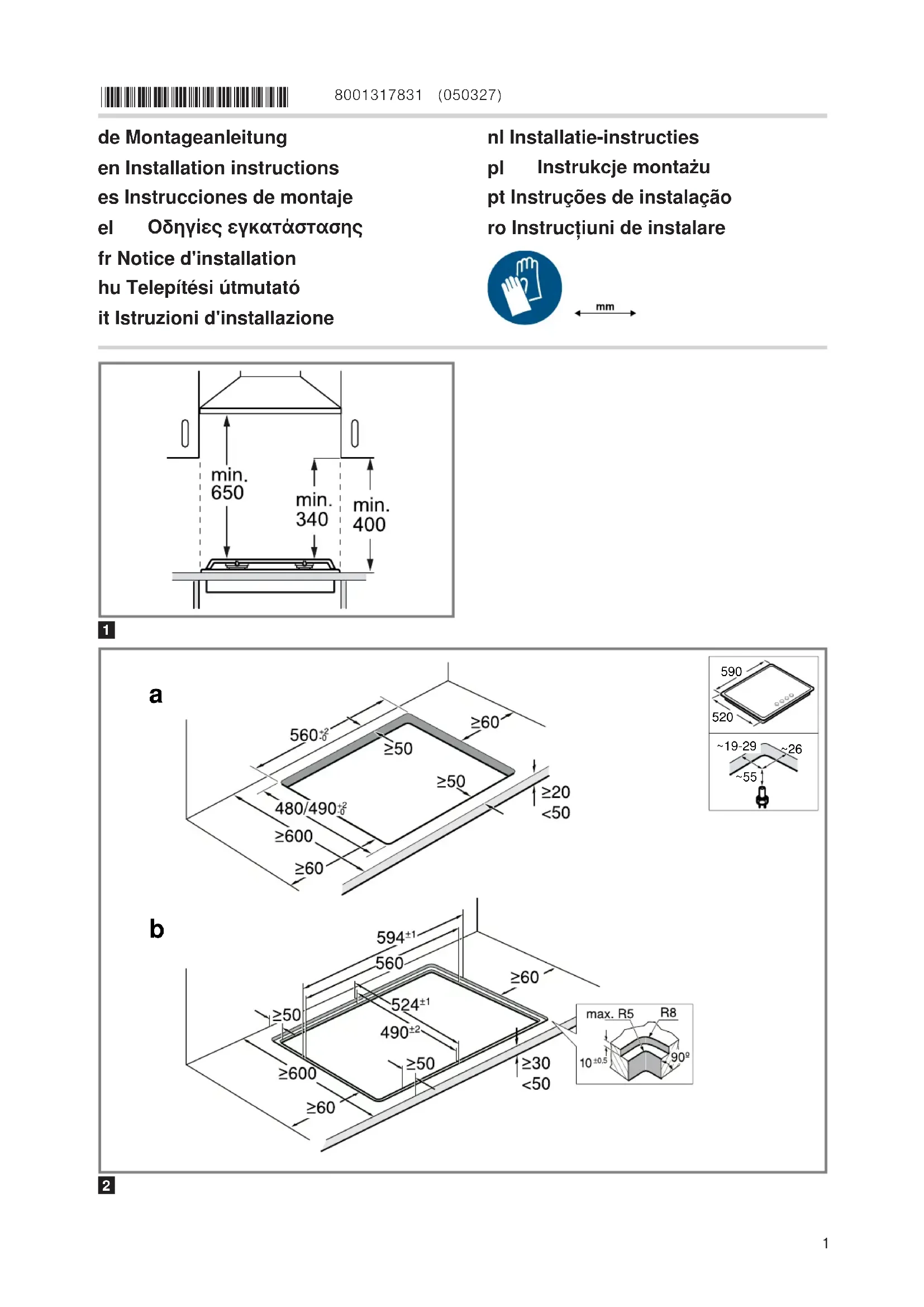 Tous les travaux d'installation, de raccordement, de régulation et de conversion à un autre type de gaz doivent être réalisés par un spécialiste agréé et en conformité avec les réglementations et les exigences légales applicables ainsi qu'avec les ré- glementations des fournisseurs locaux d'électricité et de gaz. Une attention particulière doit être ac- cordée aux réglementations et directives appli- cables à la ventilation. Pour les travaux de conver- sion à un autre type de gaz, nous vous recom- mandons d'appeler le service après-vente. ¡ Veillez à une ventilation suffisante de la cuisine, notamment lorsque vous utilisez l’appareil de cuis- son au gaz. ¡ Ne raccordez pas l'appareil à un système d'éva- cuation des produits de combustion. ¡ Ne placez jamais cet appareil dans un bateau ou un véhicule. ¡ La garantie s'applique uniquement si l'appareil est utilisé conformément à sa destination. ¡ Avant d'installer l'appareil, vérifiez que les condi- tions locales du fournisseur sont compatibles avec les réglages de l'appareil indiqués sur la plaque signalétique (type et pression de gaz, puis- sance, tension). ¡ Fixez le cordon d'alimentation au boîtier pour évi- ter qu'il ne touche les parties chaudes du four ou de la table de cuisson. ¡ Avant toute intervention sur l'appareil, coupez l'ali- mentation électrique et l'arrivée de gaz. ¡ Reliez les appareils avec l'alimentation à la terre. ¡ N'effectuez aucune modification à l'intérieur de l'appareil. Si nécessaire, contactez notre service après-vente technique. Avant l'installation ¡ Cet appareil correspond à la classe 3 de la norme EN 30-1-1 pour les appareils à gaz: appareil en- castrable. ¡ Le meuble dans lequel l'appareil est installé doit être fixé de manière appropriée et stable. ¡ Les meubles situés près de l'appareil, les pan- neaux stratifiés et la colle utilisée pour les fixer doivent être constitués de matériaux incombus- tibles et résistants à la chaleur. ¡ N'installez pas cet appareil sur un réfrigérateur, un lave-linge, un lave-vaisselle ni sur tout autre appa- reil similaire. ¡ Cet appareil doit être installé uniquement sur un four à ventilation forcée. Vérifiez les dimensions du four dans le manuel d'installation du four. ¡ Si vous installez un four sous la table de cuisson, l'épaisseur du plan de travail peut différer des di- mensions indiquées dans ces instructions. Res- pectez les consignes des instructions de montage du four. ¡ Si un ventilateur d'extraction ou une hotte aspi- rante est installé(e), suivez ses instructions d'ins- tallation. Respectez toujours la distance verticale minimale par rapport à la table de cuisson.