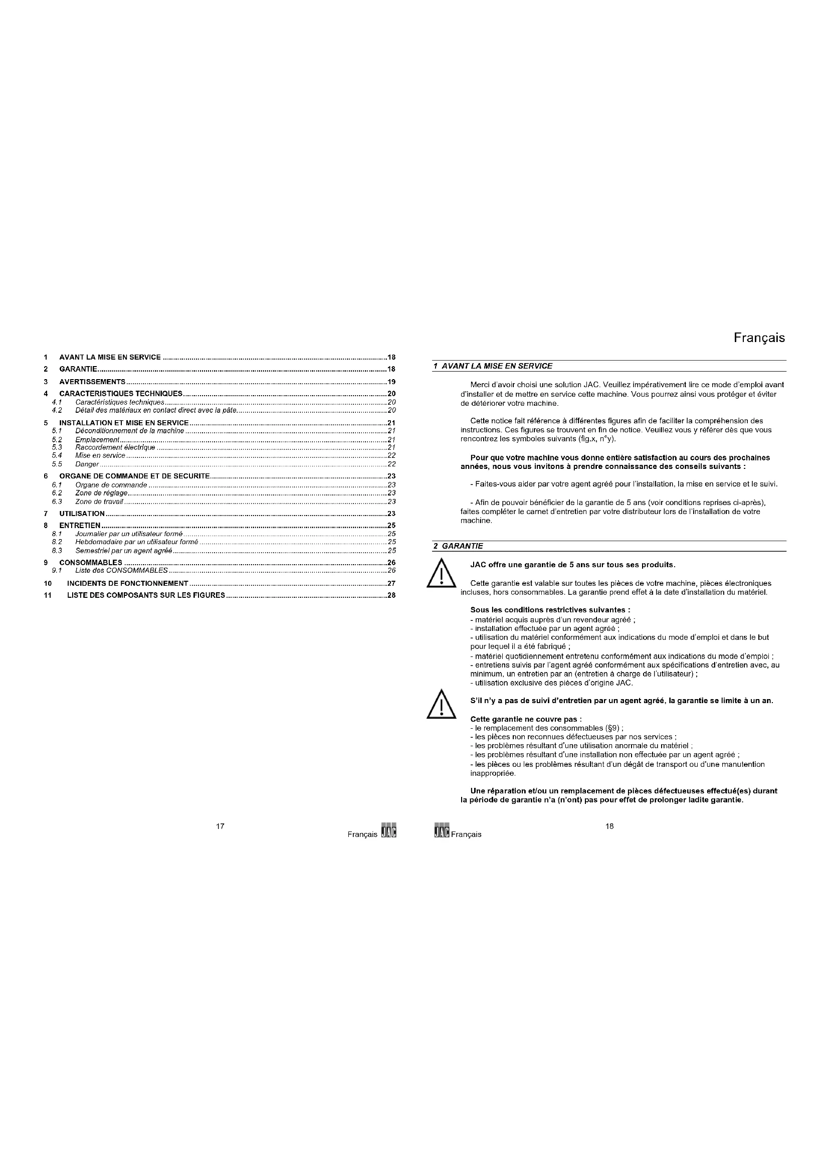 Merci d’avoir choisi une solution JAC. Veuillez impérativement lire ce mode d’emploi avant d’installer et de mettre en service cette machine. Vous pourrez ainsi vous protéger et éviter de détériorer votre machine. Cette notice fait référence à différentes figures afin de faciliter la compréhension des instructions. Ces figures se trouvent en fin de notice. Veuillez vous y référer dès que vous rencontrez les symboles suivants (fig.x, n°y). Pour que votre machine vous donne entière satisfaction au cours des prochaines années, nous vous invitons à prendre connaissance des conseils suivants : - Faites-vous aider par votre agent agréé pour l’installation, la mise en service et le suivi. - Afin de pouvoir bénéficier de la garantie de 5 ans (voir conditions reprises ci-après), faites compléter le carnet d’entretien par votre distributeur lors de l’installation de votre machine. 2 GARANTIE JAC offre une garantie de 5 ans sur tous ses produits. Cette garantie est valable sur toutes les pièces de votre machine, pièces électroniques incluses, hors consommables. La garantie prend effet à la date d’installation du matériel. Sous les conditions restrictives suivantes : - matériel acquis auprès d’un revendeur agréé ; - installation effectuée par un agent agréé ; - utilisation du matériel conformément aux indications du mode d’emploi et dans le but pour lequel il a été fabriqué ; - matériel quotidiennement entretenu conformément aux indications du mode d’emploi ; - entretiens suivis par l’agent agréé conformément aux spécifications d’entretien avec, au minimum, un entretien par an (entretien à charge de l’utilisateur) ; - utilisation exclusive des pièces d’origine JAC. S’il n’y a pas de suivi d’entretien par un agent agréé, la garantie se limite à un an. Cette garantie ne couvre pas : - le remplacement des consommables (§9) ; - les pièces non reconnues défectueuses par nos services ; - les problèmes résultant d’une utilisation anormale du matériel ; - les problèmes résultant d’une installation non effectuée par un agent agréé ; - les pièces ou les problèmes résultant d’un dégât de transport ou d’une manutention inappropriée. Une réparation et/ou un remplacement de pièces défectueuses effectué(es) durant la période de garantie n’a (n’ont) pas pour effet de prolonger ladite garantie.Français