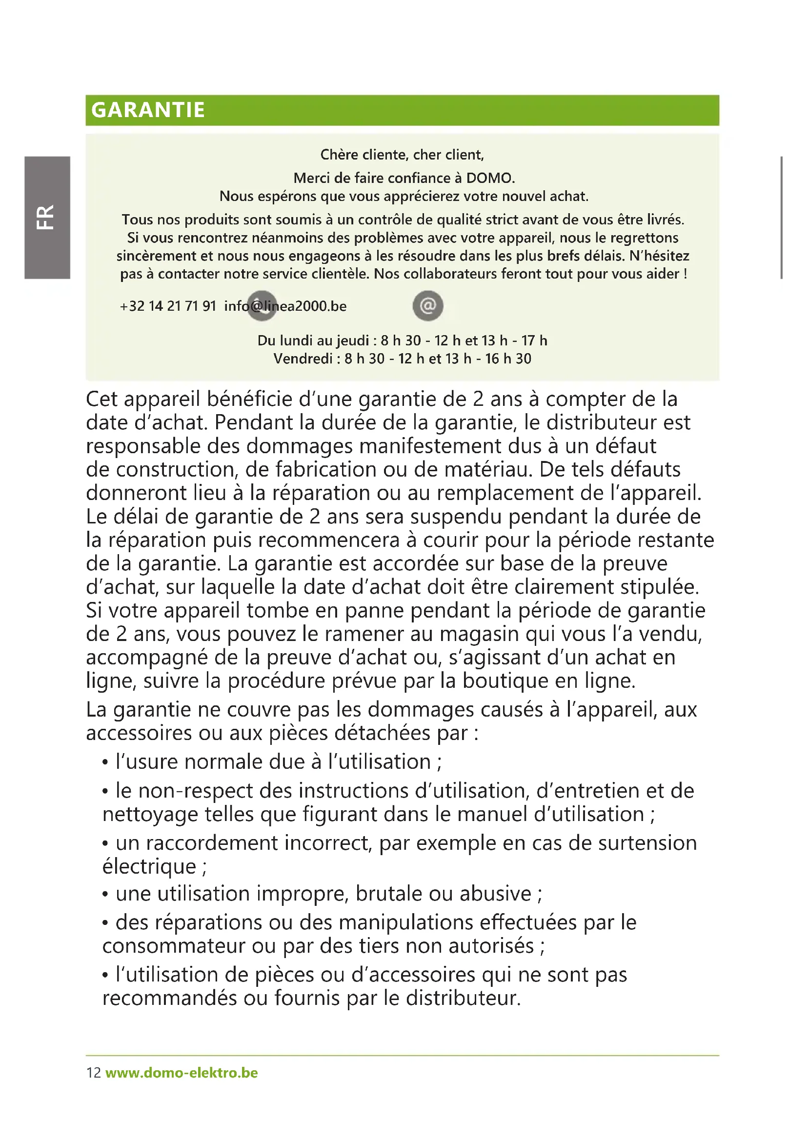 GARANTIE Chère cliente, cher client, Merci de faire conance à DOMO. Nous espérons que vous apprécierez votre nouvel achat. Tous nos produits sont soumis à un contrôle de qualité strict avant de vous être livrés. Si vous rencontrez néanmoins des problèmes avec votre appareil, nous le regrettons sincèrement et nous nous engageons à les résoudre dans les plus brefs délais. N’hésitez pas à contacter notre service clientèle. Nos collaborateurs feront tout pour vous aider ! +32 14 21 71 91 info@linea2000.be Du lundi au jeudi : 8 h 30 - 12 h et 13 h - 17 h Vendredi : 8 h 30 - 12 h et 13 h - 16 h 30 Cet appareil bénécie d’une garantie de 2 ans à compter de la date d’achat. Pendant la durée de la garantie, le distributeur est responsable des dommages manifestement dus à un défaut de construction, de fabrication ou de matériau. De tels défauts donneront lieu à la réparation ou au remplacement de l’appareil. Le délai de garantie de 2 ans sera suspendu pendant la durée de la réparation puis recommencera à courir pour la période restante de la garantie. La garantie est accordée sur base de la preuve d’achat, sur laquelle la date d’achat doit être clairement stipulée. Si votre appareil tombe en panne pendant la période de garantie de 2 ans, vous pouvez le ramener au magasin qui vous l’a vendu, accompagné de la preuve d’achat ou, s’agissant d’un achat en ligne, suivre la procédure prévue par la boutique en ligne. La garantie ne couvre pas les dommages causés à l’appareil, aux accessoires ou aux pièces détachées par :