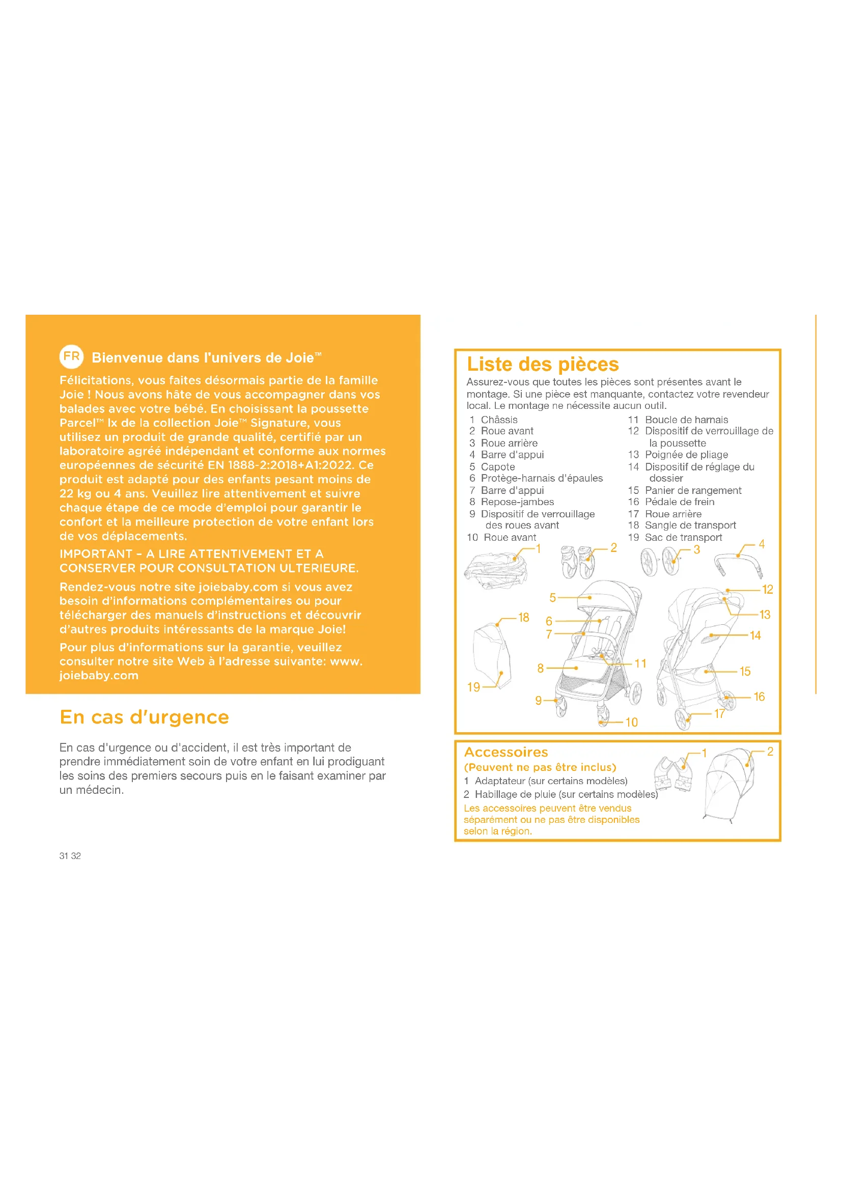 Félicitations, vous faites désormais partie de la famille Joie ! Nous avons hâte de vous accompagner dans vos balades avec votre bébé. En choisissant la poussette Parcel™ lx de la collection Joie™ Signature, vous utilisez un produit de grande qualité, certifié par un laboratoire agréé indépendant et conforme aux normes européennes de sécurité EN 1888-2:2018+A1:2022. Ce produit est adapté pour des enfants pesant moins de 22 kg ou 4 ans. Veuillez lire attentivement et suivre chaque étape de ce mode d’emploi pour garantir le confort et la meilleure protection de votre enfant lors de vos déplacements.