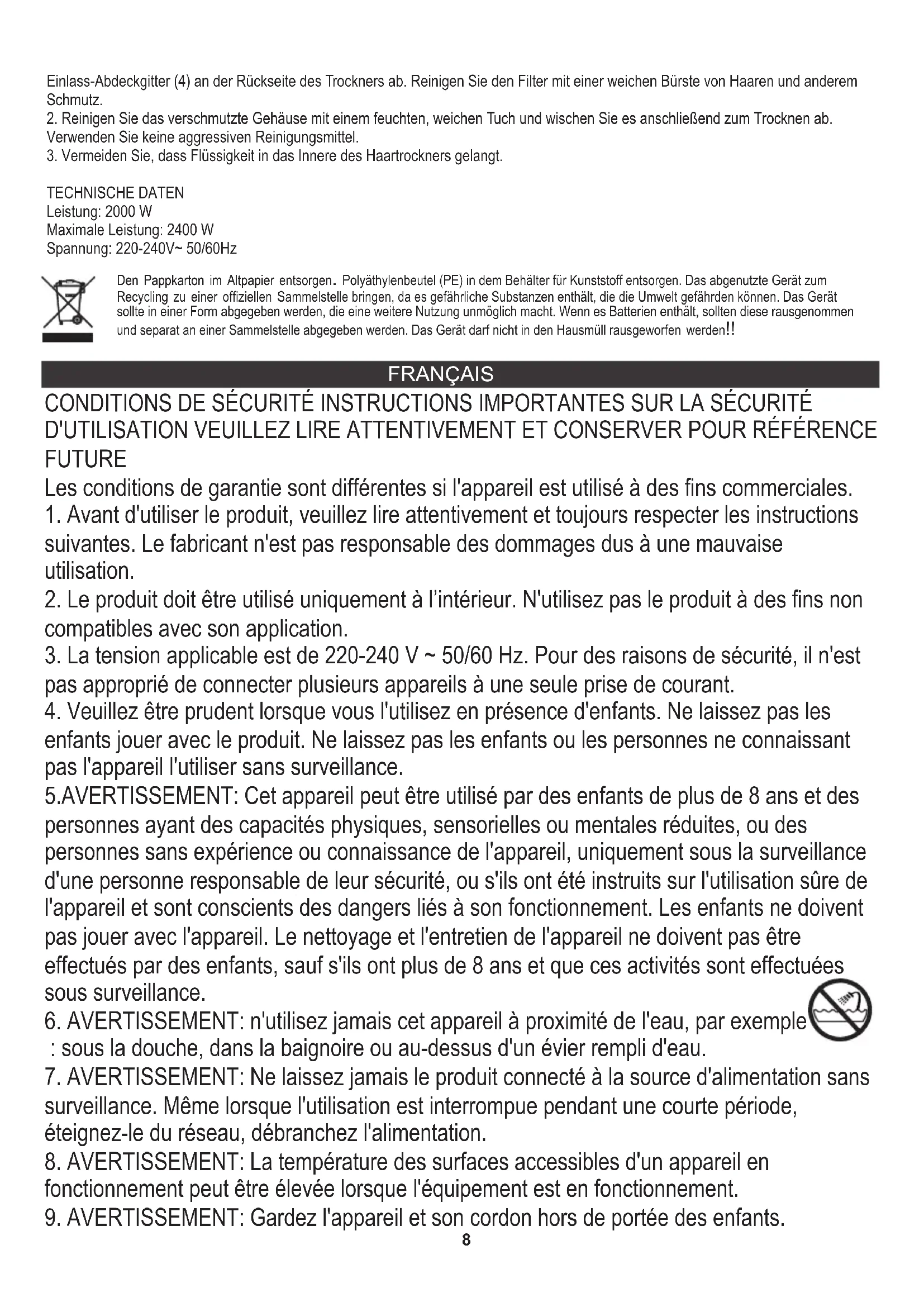 6. AVERTISSEMENT: n'utilisez jamais cet appareil à proximité de l'eau, par exemple