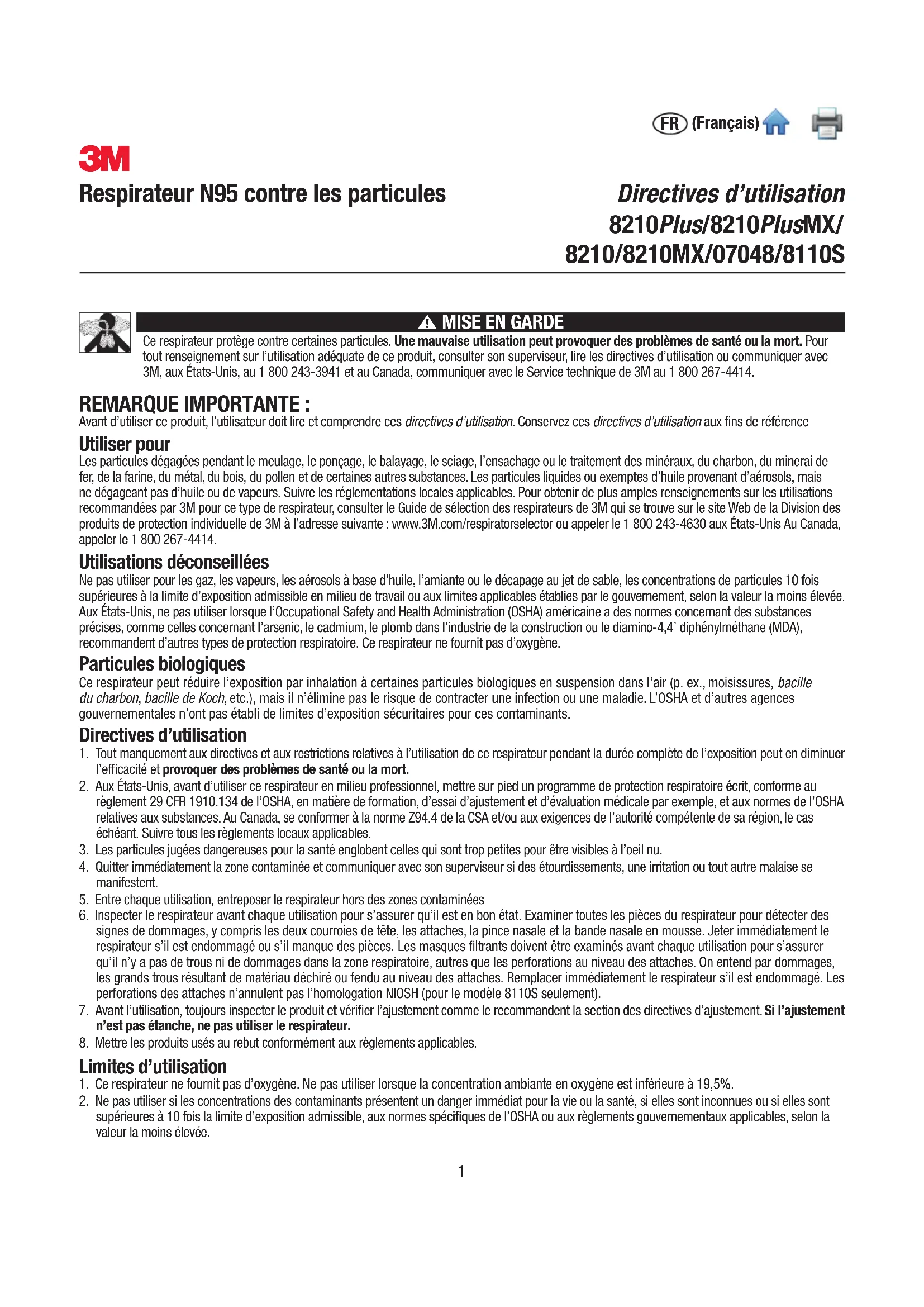 St. Paul, Minnesota, USA1-800-243-46308210 Série Respirateurs A - Ne pas utiliser dans les endroits où le taux d’oxygène est inférieur à 19,5%. B - Ne pas utiliser lorsque l’atmosphère présente un danger immédiat pour la vie ou pour la santé. C - Do not exceed maximum use concentrations established by regulatory standards. J - L’utilisation et l’entretien inadéquats de ce respirateur peuvent provoquer des blessures ou la mort. M - Tous les respirateurs approuvés doivent être choisis, ajustés, portés et entretenus conformément aux normes de la MSHA, de l’OSHA de tout autre règlement en vigueur. N - Ne jamais substituer ou modifier ce respirateur, ni lui ajouter ou lui enlever des pièces. N’utiliser que des pièces de rechange exactes déterminées par le fabricant. O - Consulter les directives d'utilisation et/ou les manuels d’entretien pour obtenir des renseignements sur l’utilisation et l’entretien de ces respirateurs. P - Le NIOSH n’évalue pas les respirateurs utilisés comme masques chirurgicaux. N95 - Filtre contre les particules N95 (niveau d'efficacité du filtre de 95%) efficace contre les aérosols exempts d'huile mais contenant des particules. Des restrictions quant à la durée d'utilisation peuvent s'appliquer. POUR OBTENIR DE PLUS AMPLES RENSEIGNEMENTS/FOR MORE INFORMATION Au Canada, communiquer avec/In Canada, contact : Internet : www.3M.ca/Safety Assistance technique/Technical Assistance : 1 800 267-4414 Centre communication-client/Customer Care Center : 1 800 364-3577