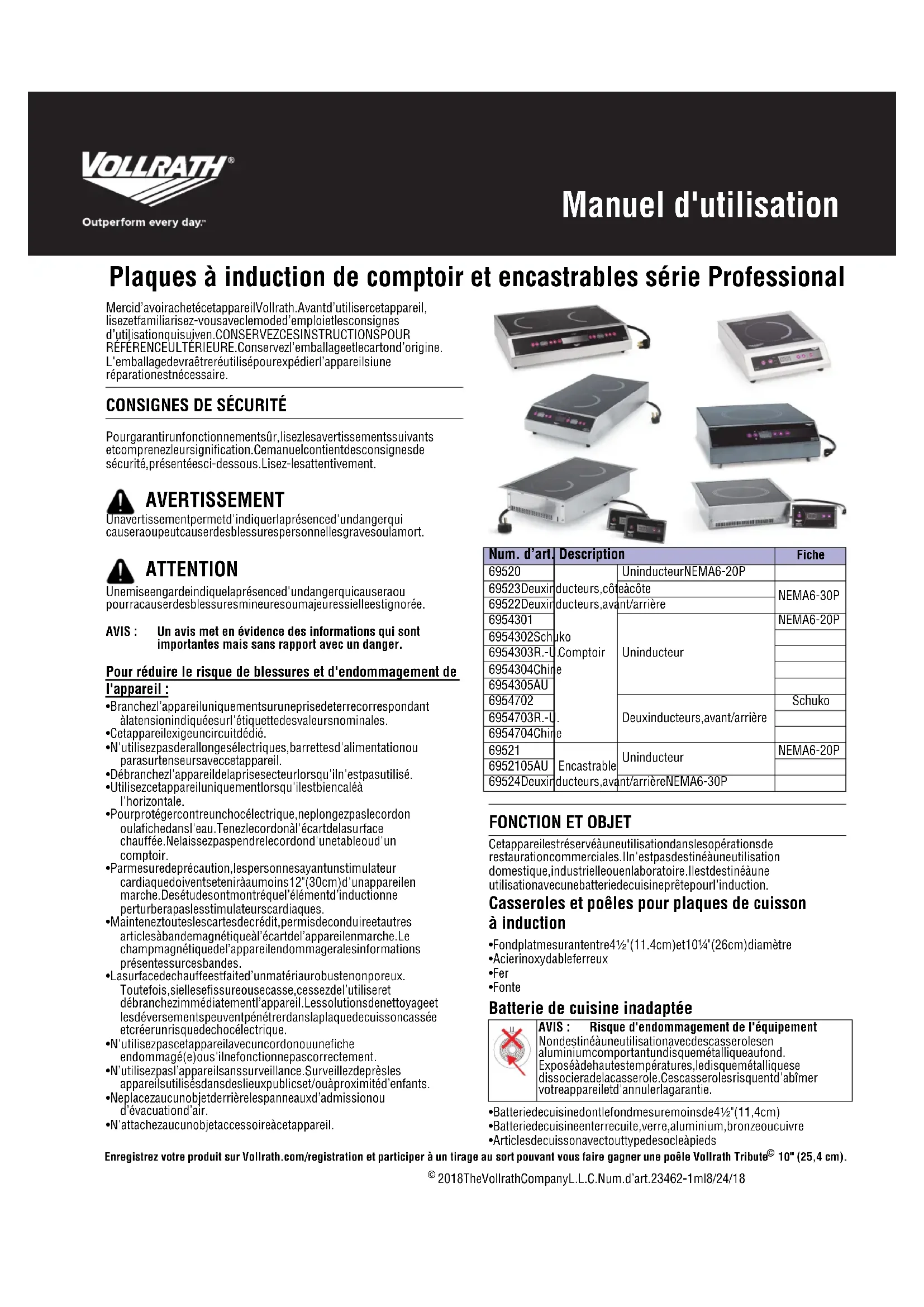 - Batterie de cuisine dont le fond mesure moins de 4¹⁄₂" (11,4 cm)• Batterie de cuisine en terre cuite, verre, aluminium, bronze ou cuivre• Articles de cuisson avec tout type de socle à pieds AVERTISSEMENT ATTENTION Num. d’art. Description Fiche69520ComptoirUn inducteur NEMA 6-20P69523 Deux inducteurs, côte à côteNEMA 6-30P69522 Deux inducteurs, avant/arrière6954301Un inducteurNEMA 6-20P6954302 Schuko6954303 R.-U.6954304 Chine6954305 AU6954702Deux inducteurs, avant/arrièreSchuko6954703 R.-U.6954704 Chine69521EncastrableUn inducteurNEMA 6-20P6952105 AU69524 Deux inducteurs, avant/arrière NEMA 6-30P AVIS : Risque d'endommagement de l'équipement Non destiné à une utilisation avec des casseroles enaluminium comportant un disque métallique au fond.Exposé à de hautes températures, le disque métallique sedissociera de la casserole. Ces casseroles risquent d'abîmervotre appareil et d'annuler la garantie.2 Plaques à induction de comptoir et encastrables série Professional Manuel d'utilisation