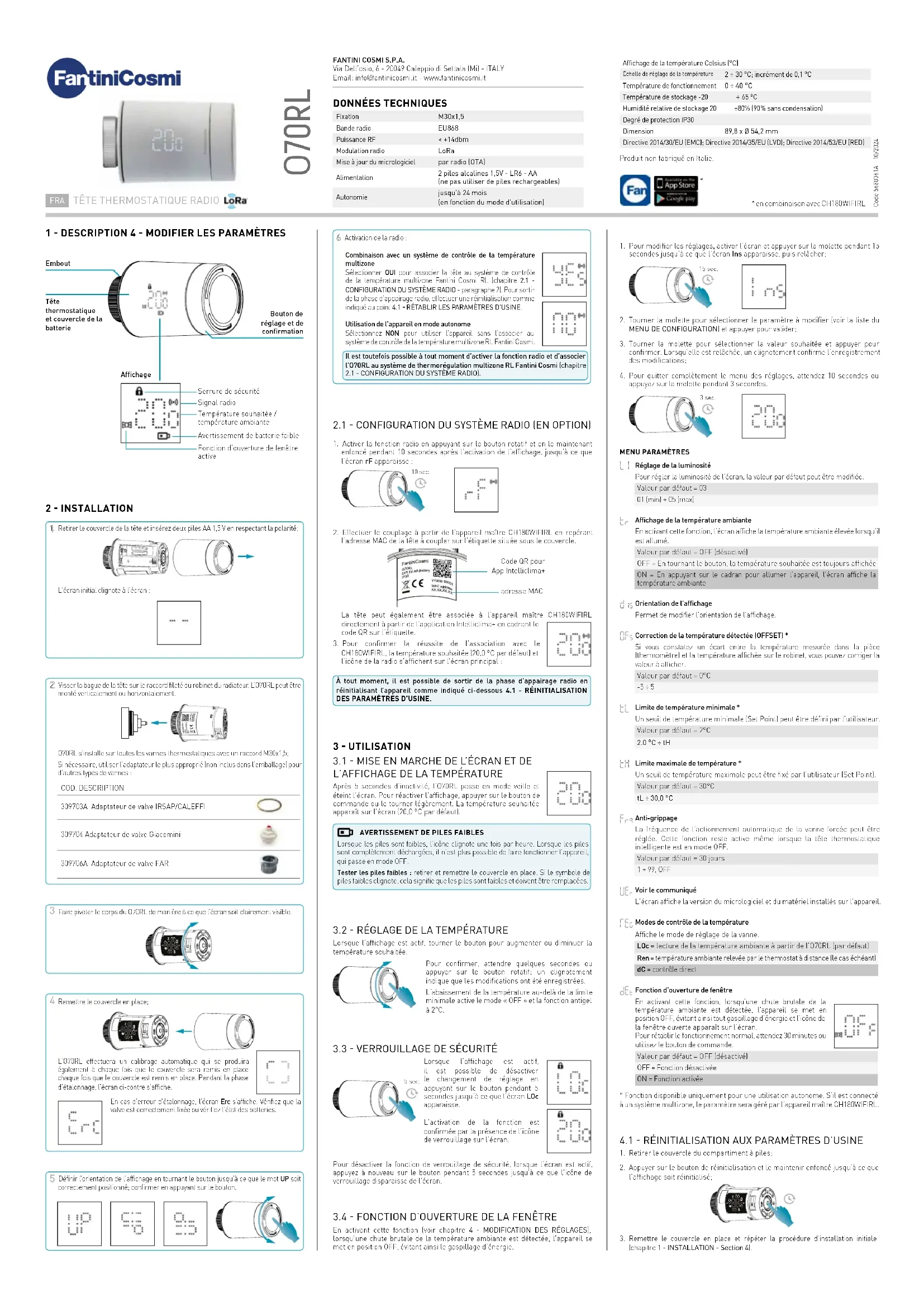 Limite maximale de température * Un seuil de température maximale peut être fixé par l’utilisateur (Set Point). Valeur par défaut = 30°C tL ÷ 30,0 °C Anti-grippage La fréquence de l’actionnement automatique de la vanne forcée peut être réglée. Cette fonction reste active même lorsque la tête thermostatique intelligente est en mode OFF. Valeur par défaut = 30 jours 1 ÷ 99, OFF Voir le communiqué L’écran affiche la version du micrologiciel et du matériel installés sur l’appareil. Modes de contrôle de la température Affiche le mode de réglage de la vanne. LOc = lecture de la température ambiante à partir de l’O70RL (par défaut) Ren = température ambiante relevée par le thermostat à distance (le cas échéant) dC = contrôle direct Fonction d’ouverture de fenêtre En activant cette fonction, lorsqu’une chute brutale de la température ambiante est détectée, l’appareil se met en position OFF, évitant ainsi tout gaspillage d’énergie et l’icône de la fenêtre ouverte apparaît sur l’écran. Pour rétablir le fonctionnement normal, attendez 30 minutes ou utilisez le bouton de commande. Valeur par défaut = OFF (désactivé) OFF = Fonction désactivée ON = Fonction activée