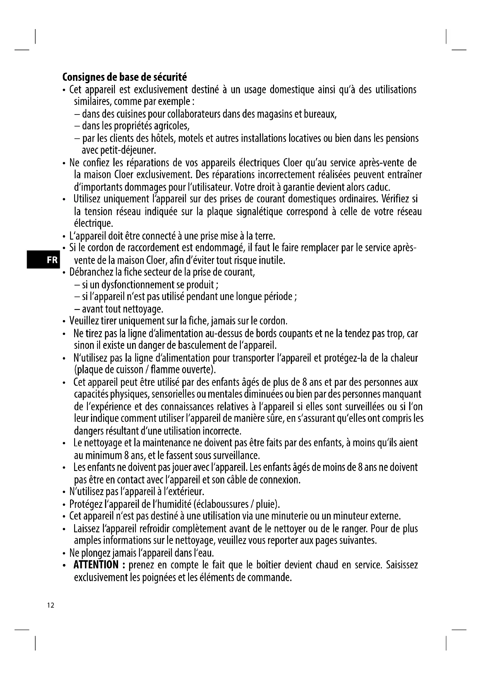 mations à propos du traitement de déchets auprès de votre commune. Informations sur les règles de tri Garantie Les appareils électriques correspondent aux direc- tives actuelles et aux prescriptions en matière de sécurité de l‘UE. Si votre appareil Cloer présente un dysfonctionnement, ou qu‘il ne fonctionne pas cor