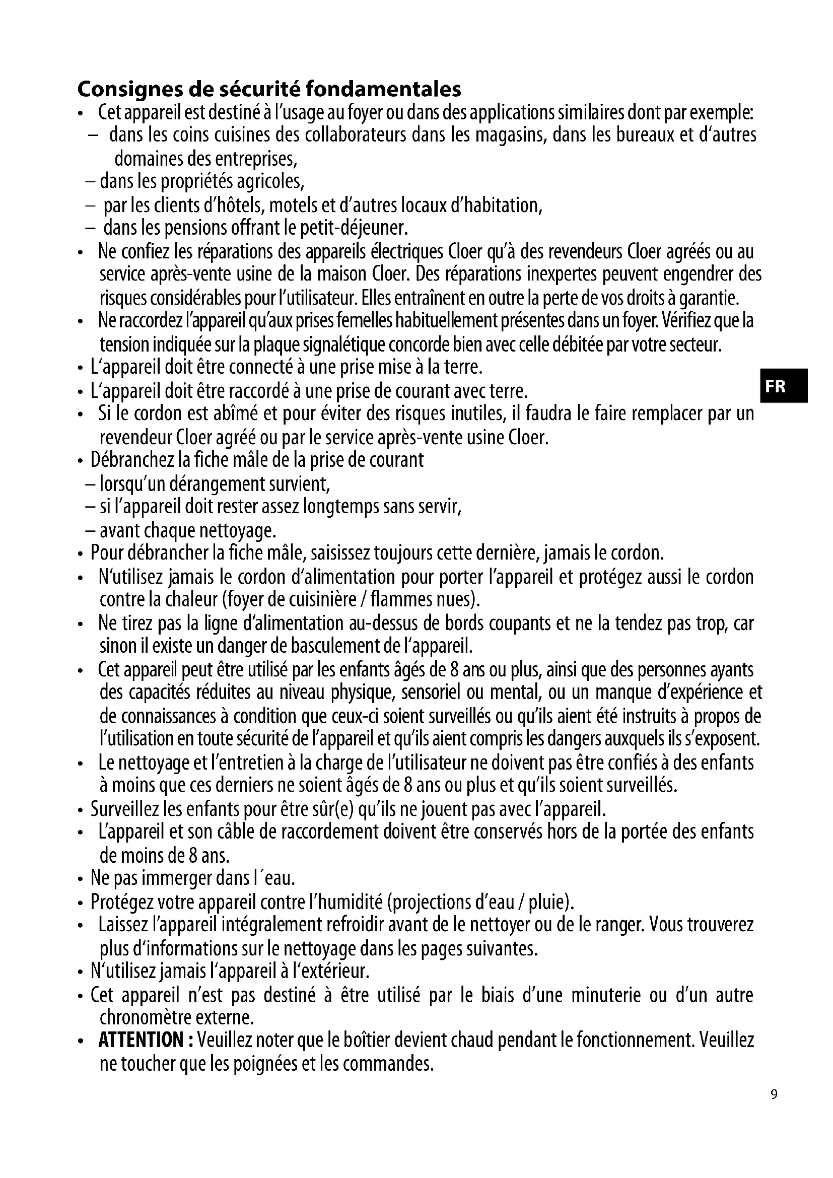 - Ne confiez les réparations des appareils électriques Cloer qu’à des revendeurs Cloer agréés ou au service après-vente usine de la maison Cloer. Des réparations inexpertes peuvent engendrer des risques considérables pour l’utilisateur. Elles entraînent en outre la perte de vos droits à garantie.