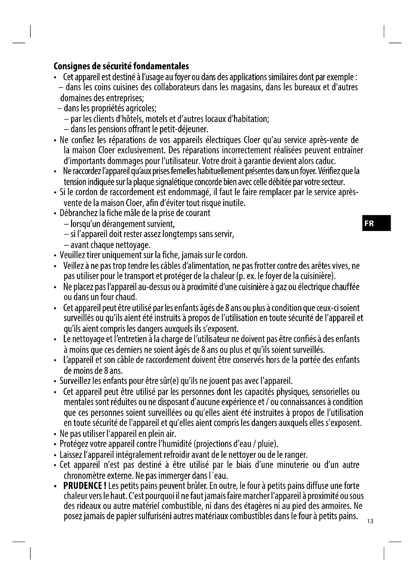 triques en fin de vie à votre déchetterie locale ou un centre de recyclage agréé. Vous pouvez obtenir toutes les informations à propos du traitement de déchets auprès de votre commune. Garantie Les appareils électriques correspondent aux directi- ves actuelles et aux prescriptions en matière de sé- curité de l‘UE. Si votre appareil Cloer présente un dysfonctionne