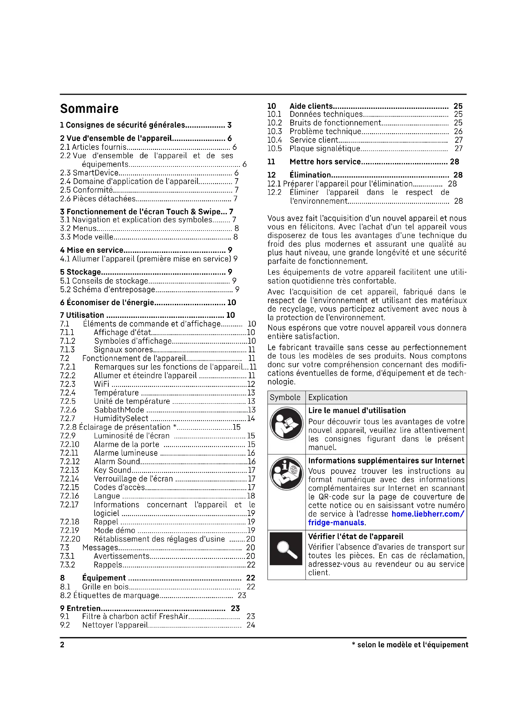 l'environnement................................................... 28 Vous avez fait l’acquisition d’un nouvel appareil et nous vous en félicitons. Avec l’achat d’un tel appareil vous disposerez de tous les avantages d’une technique du froid des plus modernes et assurant une qualité au plus haut niveau, une grande longévité et une sécurité parfaite de fonctionnement. Les équipements de votre appareil facilitent une utili‐ sation quotidienne très confortable. Avec l’acquisition de cet appareil, fabriqué dans le respect de l’environnement et utilisant des matériaux de recyclage, vous participez activement avec nous à la protection de l’environnement. Nous espérons que votre nouvel appareil vous donnera entière satisfaction. Le fabricant travaille sans cesse au perfectionnement de tous les modèles de ses produits. Nous comptons donc sur votre compréhension concernant des modifi‐ cations éventuelles de forme, d’équipement et de tech‐ nologie. Symbole Explication Lire le manuel d’utilisation Pour découvrir tous les avantages de votre nouvel appareil, veuillez lire attentivement les consignes figurant dans le présent manuel. Informations supplémentaires sur Internet Vous pouvez trouver les instructions au format numérique avec des informations complémentaires sur Internet en scannant le QR-code sur la page de couverture de cette notice ou en saisissant votre numéro de service à l’adresse home.liebherr.com/ fridge-manuals. Vérifier l'état de l’appareil Vérifier l’absence d’avaries de transport sur toutes les pièces. En cas de réclamation, adressez-vous au revendeur ou au service client. 2 * selon le modèle et l‘équipementSymbole Explication Divergences Le manuel d’utilisation est valable pour plusieurs modèles. Des divergences sont donc possibles. Les paragraphes concer‐ nant uniquement un certain type d'appa‐ reils sont indiqués par un astérisque (*). Instructions et résultats Les instructions sont indiquées par