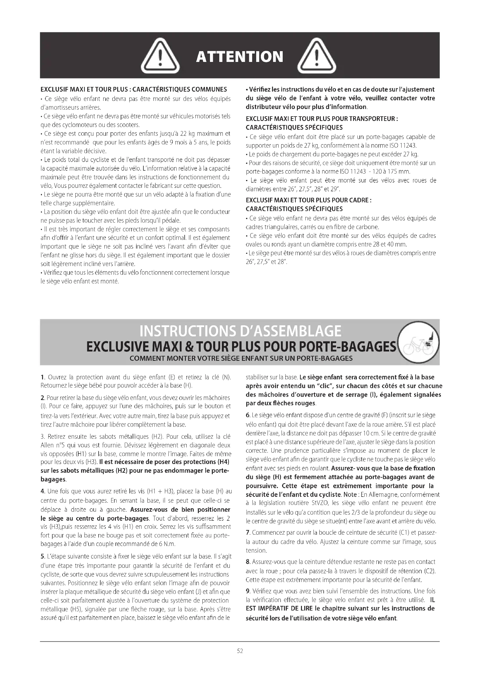 - Vérifiez les instructions du vélo et en cas de doute sur l’ajustement du siège vélo de l’enfant à votre vélo, veuillez contacter votre distributeur vélo pour plus d’information. EXCLUSIF MAXI ET TOUR PLUS POUR TRANSPORTEUR :