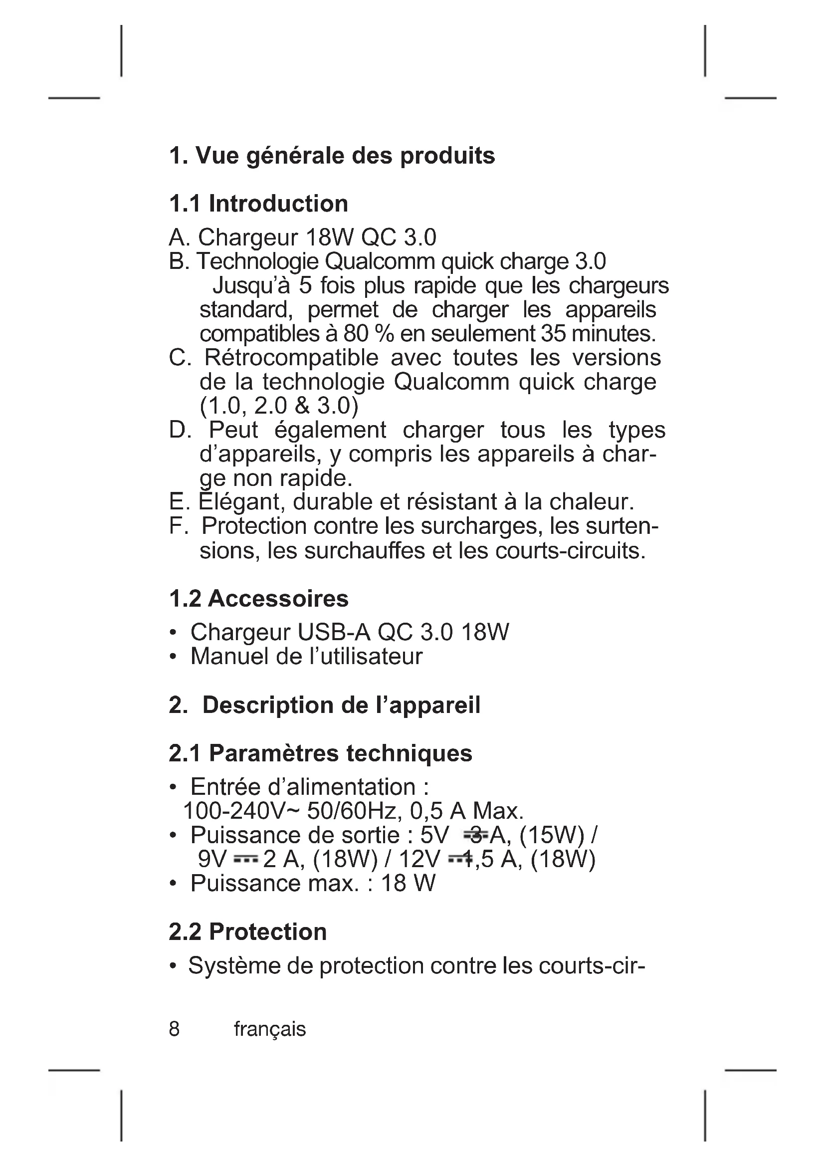 A. Chargeur 18W QC 3.0 B. Technologie Qualcomm quick charge 3.0 Jusqu’à 5 fois plus rapide que les chargeurs standard, permet de charger les appareils compatibles à 80 % en seulement 35 minutes. C. Rétrocompatible avec toutes les versions de la technologie Qualcomm quick charge (1.0, 2.0 & 3.0) D. Peut également charger tous les types d’appareils, y compris les appareils à char- ge non rapide. E. Élégant, durable et résistant à la chaleur. F. Protection contre les surcharges, les surten- sions, les surchaues et les courts-circuits.
