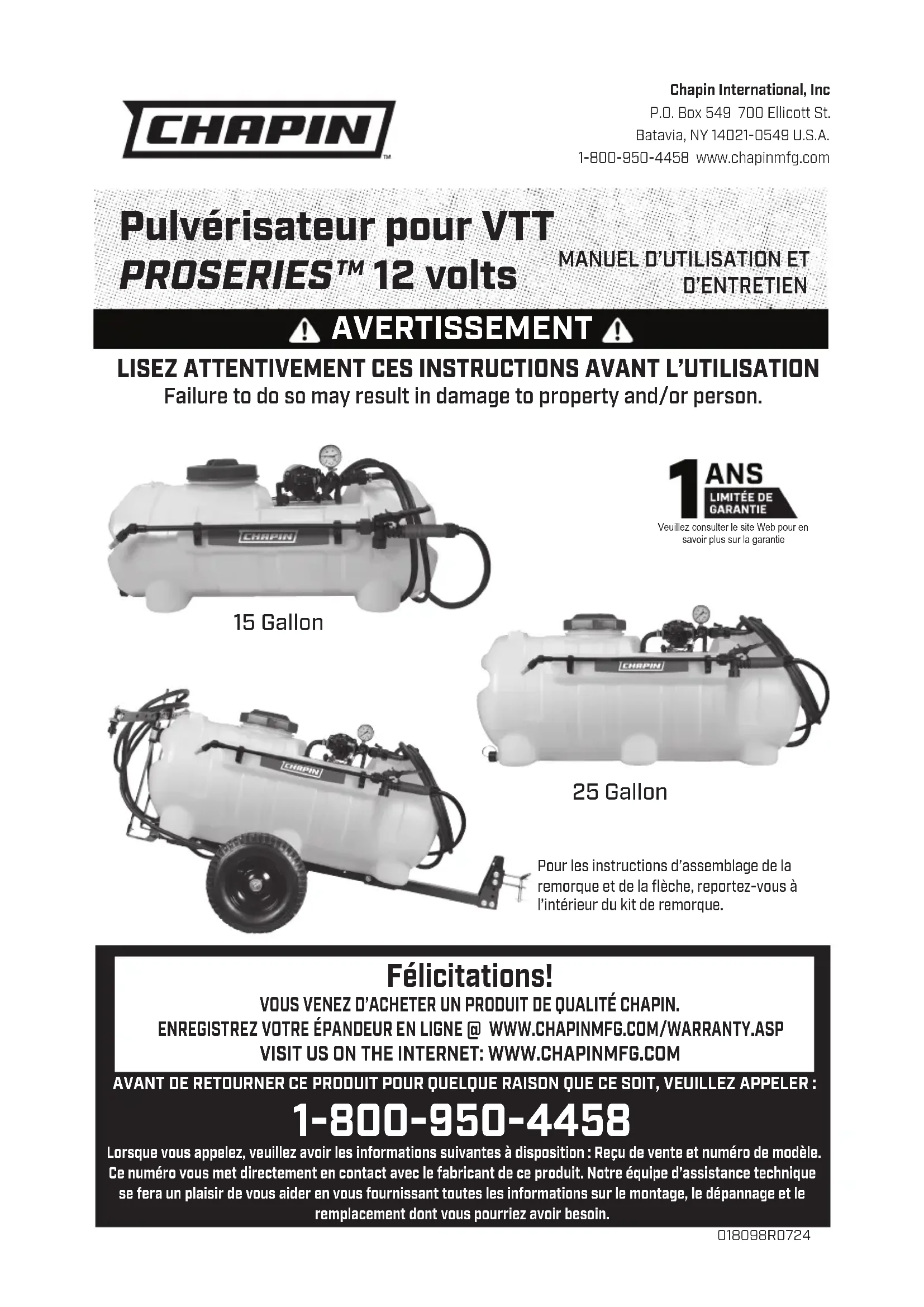 D’ENTRETIEN 018098R0724Chapin International, IncP.O. Box 549 700 Ellicott St. Batavia, NY 14021-0549 U.S.A. 1-800-950-4458 www.chapinmfg.com LISEZ ATTENTIVEMENT CES INSTRUCTIONS AVANT L’UTILISATION Failure to do so may result in damage to property and/or person. AVANT DE RETOURNER CE PRODUIT POUR QUELQUE RAISON QUE CE SOIT, VEUILLEZ APPELER : 1-800-950-4458 Lorsque vous appelez, veuillez avoir les informations suivantes à disposition : Reçu de vente et numéro de modèle. Ce numéro vous met directement en contact avec le fabricant de ce produit. Notre équipe d’assistance technique se fera un plaisir de vous aider en vous fournissant toutes les informations sur le montage, le dépannage et le remplacement dont vous pourriez avoir besoin. Félicitations! VOUS VENEZ D’ACHETER UN PRODUIT DE QUALITÉ CHAPIN. ENREGISTREZ VOTRE ÉPANDEUR EN LIGNE @ WWW.CHAPINMFG.COM/WARRANTY.ASP VISIT US ON THE INTERNET: WWW.CHAPINMFG.COM AVERTISSEMENT Pulvérisateur pour VTT PROSERIES™ 12 volts1F Manuel d’ulisaon du pulvérisateur ponctuel Chapin- Français AVERTISSEMENT UNE MAUVAISE UTILISATION OU LE NON-RESPECT DES DIRECTIVES PEUT ENTRAÎNER UNE EXPLOSION POUVANT CAUSER DE GRAVES BLESSURES AUX YEUX OU AUTRES. POUR UNE UTILISATION SÉCURITAIRE DE CE PRODUIT, LIRE ET SUIVRE TOUTES LES DIRECTIVES. NE PAS LAISSER LE PULVÉRISATEUR AU SOLEIL. LA CHALEUR PEUT PRODUIRE UNE ACCUMULATION DE PRESSION ET UNE EXPLOSION. NE PAS RANGER NI LAISSER LA SOLUTION DANS LE RÉSERVOIR APRÈS L’UTILISATION. TOUJOURS PORTER DES LUNETTES DE SÉCURITÉ, DES GANTS, UNE CHEMISE À MANCHES LONGUES, UN PANTALON LONG ET DES CHAUSSURES PROTECTRICES À PIED COMPLET LORSQUE VOUS PULVÉRISEZ. NE PAS ESSAYER DE MODIFIER CE PULVÉRISATEUR. NE REMPLACER LES PIÈCES QU’AVEC DES PIÈCES D’ORIGINE DU FABRICANT. NE JAMAIS PULVÉRISER DE PRODUITS INFLAMMABLES, CAUSTIQUES OU ACIDES, DE CHLORE, À BASE DE PÉTROLE, D’EAU DE JAVEL OU D’AUTRES SOLUTIONS CORROSIVES, NI DE PRODUITS CHIMIQUES PRODUISANT DE LA CHALEUR, DE LA PRESSION OU DES GAZ. TOUJOURS LIRE ET SUIVRE LES DIRECTIVES DU FABRICANT SUR LES PRODUITS CHIMIQUES AVANT D’UTILISER CE PULVÉRISATEUR. CERTAINS PRODUITS CHIMIQUES PEUVENT ÊTRE DANGEREUX LORSQU’ON LES UTILISE AVEC CE PULVÉRISATEUR. ASSUREZ-VOUS QUE LE FILAGE NE SE COINCE PAS OU NE SOIT PAS ENDOMMAGÉ D’AUCUNE FAÇON QUE CE SOIT. LA POMPE POURRAIT EN ÊTRE ENDOMMAGÉE OU CAUSER UNE SURCHAUFFE AU FILAGE, PROVOQUANT UNE DÉFAILLANCE OU UN INCENDIE. CERTAINS PRODUITS CHIMIQUES ENDOMMAGERONT LA POMPE ET LES SOUPAPES S’ILS DEMEURENT EN CONTACT, SANS TRAITEMENT, POUR UNE PÉRIODE PROLONGÉE. TOUJOURS RINCER LA POMPE AVEC DE L’EAU APRÈS UTILISATION. NE PAS LAISSER DE PRODUITS CHIMIQUES REPOSER DANS LA POMPE PENDANT UNE LONGUE PÉRIODE. SUIVRE LES DIRECTIVES DES FABRICANTS DE PRODUITS CHIMIQUES SUR LA FAÇON DE DISPOSER DE TOUTES LES EAUX USÉES DU PULVÉRISATEUR. CAUTION CES PULVÉRISATEURS SONT CONÇUS POUR ÊTRE FIXÉS À UNE SURFACE STABLE. « Passez toujours en revue toutes les instructions concernant tout liquide ou autre matériau avant de le placer à l’intérieur de ce produit, et respectez toujours ces instructions. Étiquetez toujours ce produit avec le nom complet de tout liquide ou autre matériau placé à l’intérieur de ce produit. Assurez-vous toujours que tous les vieux liquides ou autres matériaux sont retirés de ce produit avant de placer tout autre liquide ou autre matériau dans ce produit.