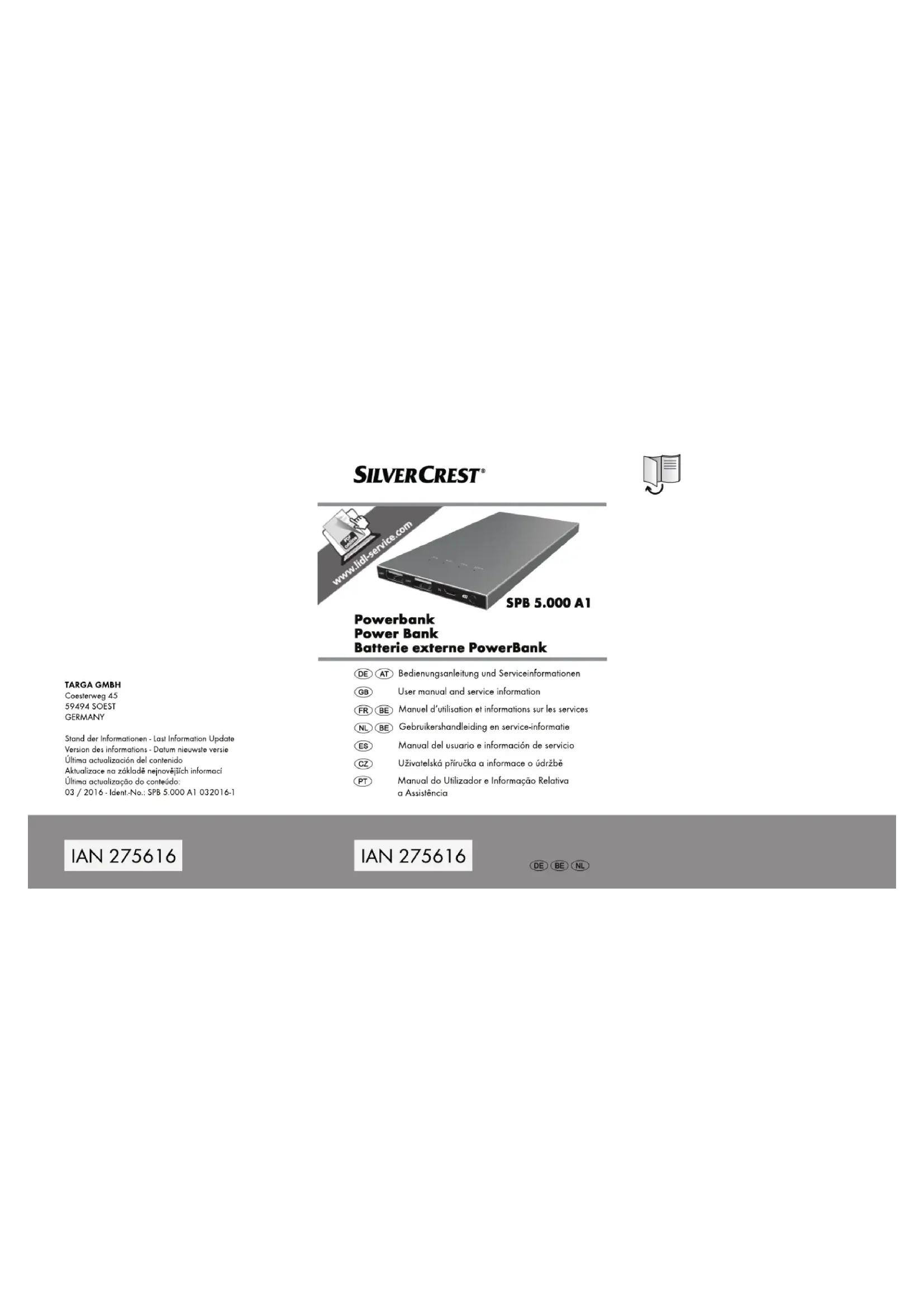 Avis de conformité Cet appareil est certifié conforme aux exigences de base et aux autres règlements de la directive CEM 2014/30/EU et de la directive RoHS 2011/65/EU. Pour recevoir la déclaration de conformité UE complète, veuillez envoyer un courrier électronique à l’adresse suivante : ce@targa.de Informations relatives à la garantie et aux services Garantie de TARGA GmbH La garantie accordée sur ce produit est de trois ans à partir de la date d'achat. Merci de conserver le ticket de caisse d’origine comme preuve d’achat. Avant de mettre votre produit en service, merci de lire la documentation jointe. Si un problème survient qui ne peut être résolu de cette manière, merci de vous adresser à notre assistance téléphonique. Pour toute demande, ayez la référence de l'article et si disponible, le numéro de série, à portée de main. S’il est impossible d’apporter une solution par téléphone, notre assistance téléphonique organisera une intervention technique en fonction de l’origine de la panne. Pendant la période de garantie, si un défaut matériel ou de fabrication est constaté, le produit sera soit réparé, soit remplacé, le choix restant à notre discrétion. LaSilverCrest SPB 5.000 A1 Français - 51 réparation ou le remplacement du produit ne prolonge pas d'autant la période de garantie. Les consommables comme les piles, les piles rechargeables et les ampoules sont exclus de la garantie. Vos droits légaux à la garantie envers le vendeur ne sont ni affectés, ni limités par la présente garantie. Indépendamment de la garantie commerciale souscrite, le vendeur reste tenu des défauts de conformité du bien et des vices rédhibitoires dans les conditions prévues aux articles L211-4 et suivants du Code de la consommation et aux articles 1641 et suivants du Code Civil. Service