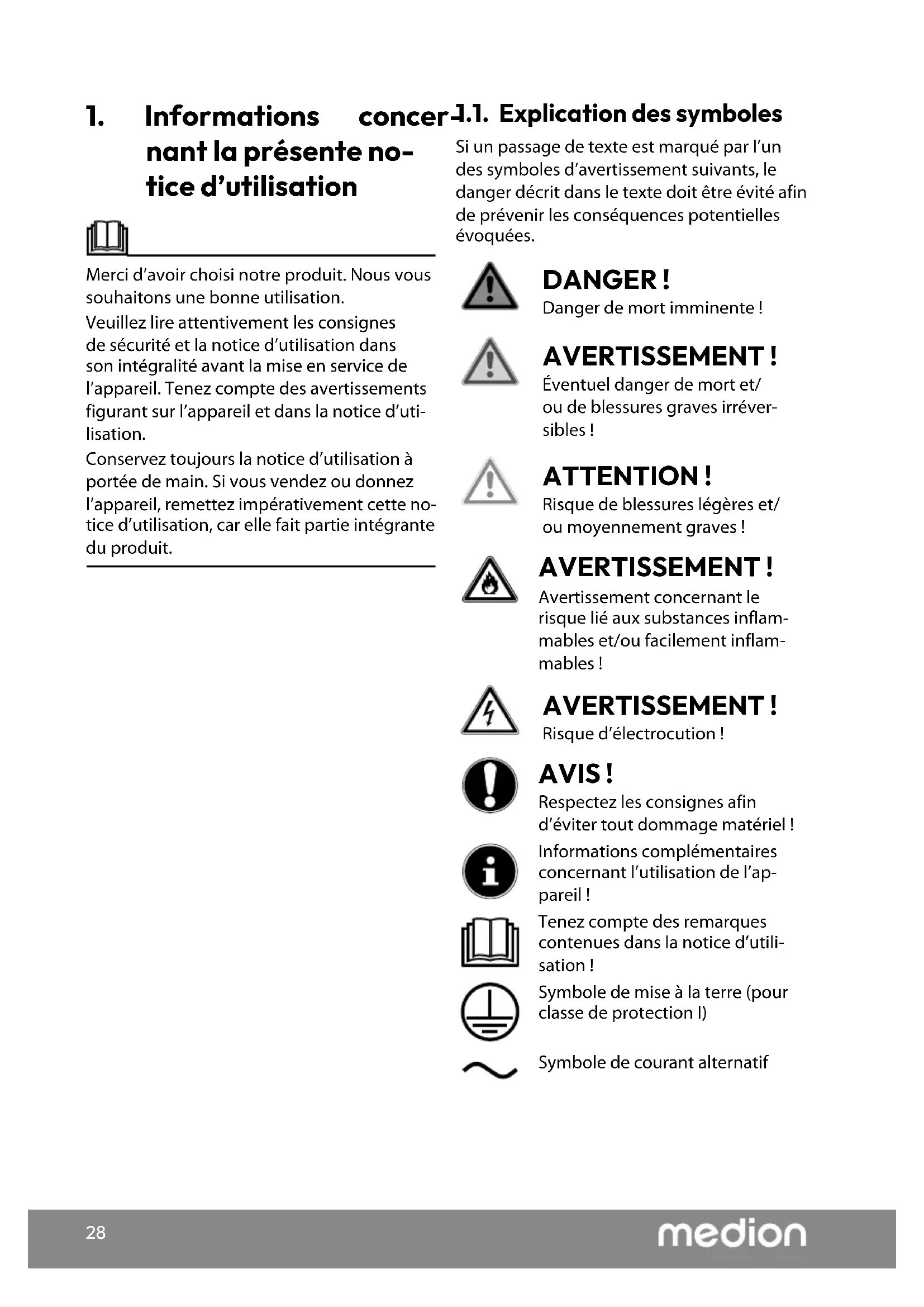 nant la présente no- tice d’utilisation Merci d’avoir choisi notre produit. Nous vous souhaitons une bonne utilisation. Veuillez lire attentivement les consignes de sécurité et la notice d’utilisation dans son intégralité avant la mise en service de l’appareil. Tenez compte des avertissements figurant sur l’appareil et dans la notice d’uti- lisation. Conservez toujours la notice d’utilisation à portée de main. Si vous vendez ou donnez l’appareil, remettez impérativement cette no- tice d’utilisation, car elle fait partie intégrante du produit. 1.1. Explication des symboles Si un passage de texte est marqué par l’un des symboles d’avertissement suivants, le danger décrit dans le texte doit être évité afin de prévenir les conséquences potentielles évoquées. DANGER! Danger de mort imminente! AVERTISSEMENT! Éventuel danger de mort et/ ou de blessures graves irréver- sibles! ATTENTION! Risque de blessures légères et/ ou moyennement graves! AVERTISSEMENT! Avertissement concernant le risque lié aux substances inflam- mables et/ou facilement inflam- mables! AVERTISSEMENT! Risque d’électrocution! AVIS! Respectez les consignes afin d’éviter tout dommage matériel! Informations complémentaires concernant l’utilisation de l’ap- pareil! Tenez compte des remarques contenues dans la notice d’utili- sation! Symbole de mise à la terre (pour classe de protectionI) Symbole de courant alternatif29
