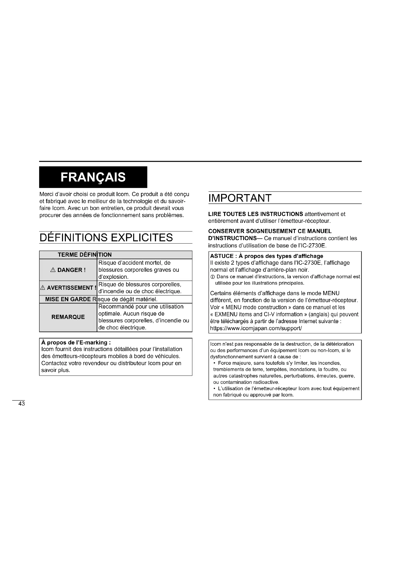 AVERTISSEMENT ! Risque de blessures corporelles, d’incendie ou de choc électrique. MISE EN GARDE Risque de dégât matériel. REMARQUE Recommandé pour une utilisation optimale. Aucun risque de blessures corporelles, d’incendie ou de choc électrique. À propos de l’E-marking : Icom fournit des instructions détaillées pour l’installation des émetteurs-récepteurs mobiles à bord de véhicules. Contactez votre revendeur ou distributeur Icom pour en savoir plus. IMPORTANT LIRE TOUTES LES INSTRUCTIONS attentivement et entièrement avant d’utiliser l’émetteur-récepteur.