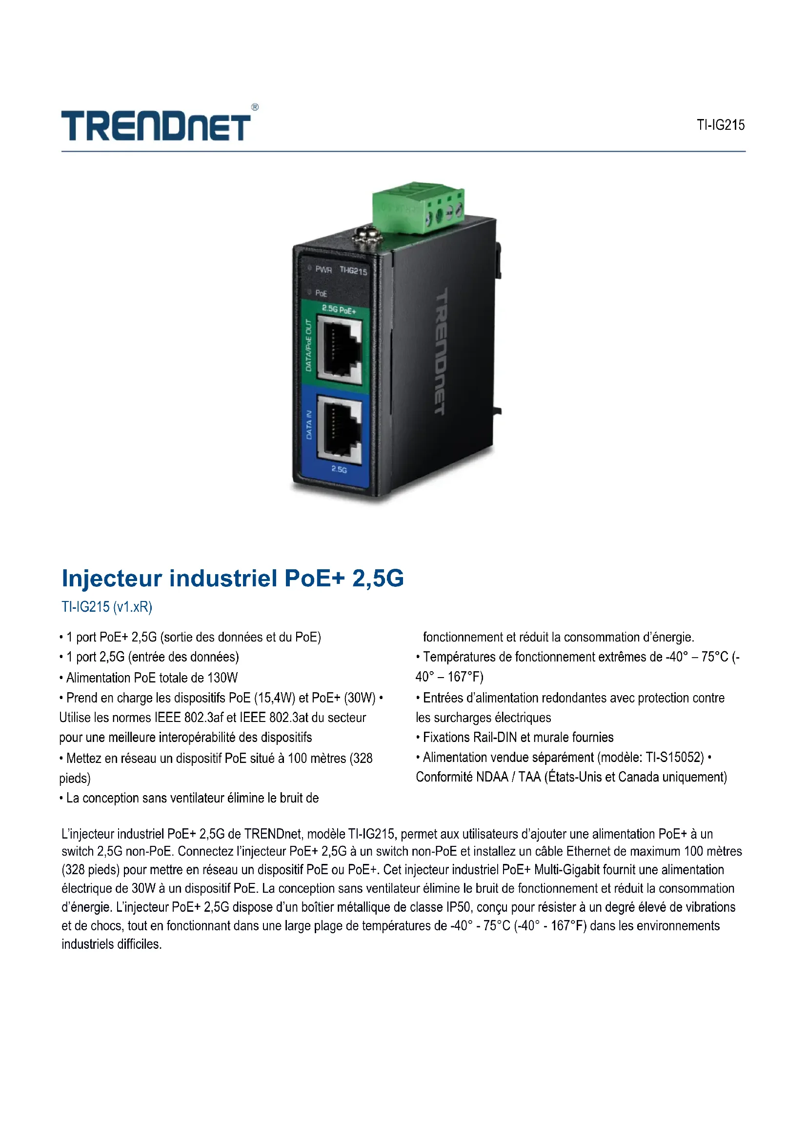 - Alimentation vendue séparément (modèle: TI-S15052) • Conformité NDAA / TAA (États-Unis et Canada uniquement) L’injecteur industriel PoE+ 2,5G de TRENDnet, modèle TI-IG215, permet aux utilisateurs d’ajouter une alimentation PoE+ à un switch 2,5G non-PoE. Connectez l’injecteur PoE+ 2,5G à un switch non-PoE et installez un câble Ethernet de maximum 100 mètres (328 pieds) pour mettre en réseau un dispositif PoE ou PoE+. Cet injecteur industriel PoE+ Multi-Gigabit fournit une alimentation électrique de 30W à un dispositif PoE. La conception sans ventilateur élimine le bruit de fonctionnement et réduit la consommation d’énergie. L’injecteur PoE+ 2,5G dispose d’un boîtier métallique de classe IP50, conçu pour résister à un degré élevé de vibrations et de chocs, tout en fonctionnant dans une large plage de températures de -40° - 75°C (-40° - 167°F) dans les environnements industriels difficiles. TI-IG215PoE+ Cet injecteur PoE+ Multi-Gigabit fournit une alimentation électrique de 30W à un dispositif PoE. Ports 2,5G Dispose d’un port 2,5G à haut débit (entrée des données) et d’un port PoE+ 2,5G à haut débit (sortie des données et du PoE). Conception industrielle Boîtier métallique de classeIP50, résistant à un degré élevé de vibrations et de chocs, tout en fonctionnant dans une large plage de températures de - 40° – 75°C (-40° – 167°F). TI-IG215 CARACTÉRISTIQUES PoE+ Cet injecteur industriel PoE 802.3at fournit 30 W d’alimentation aux dispositifs PoE (IEEE 802.3af) ou PoE+ (IEEE 802.3at). Conception industrielle Equipé d’un boîtier métallique de classeIP50, conçu pour résister à un degré élevé de vibrations et de chocs, tout en fonctionnant dans une large plage de températures de -40° – 75°C (-40° – 167°F) pour les environnements industriels. Ports 2,5G 1 port 2,5G (entrée de données) et 1 port PoE++ 2,5G (sortie de données et du PoE). Distance PoE Fournit une connexion réseau PoE à 100m (328 pieds) de l’adaptateur industriel Multi-Gigabit PoE+ 802.3at Voyants LED Les voyants LED de l’injecteur PoE industriel confirment l’alimentation et la connexion PoE