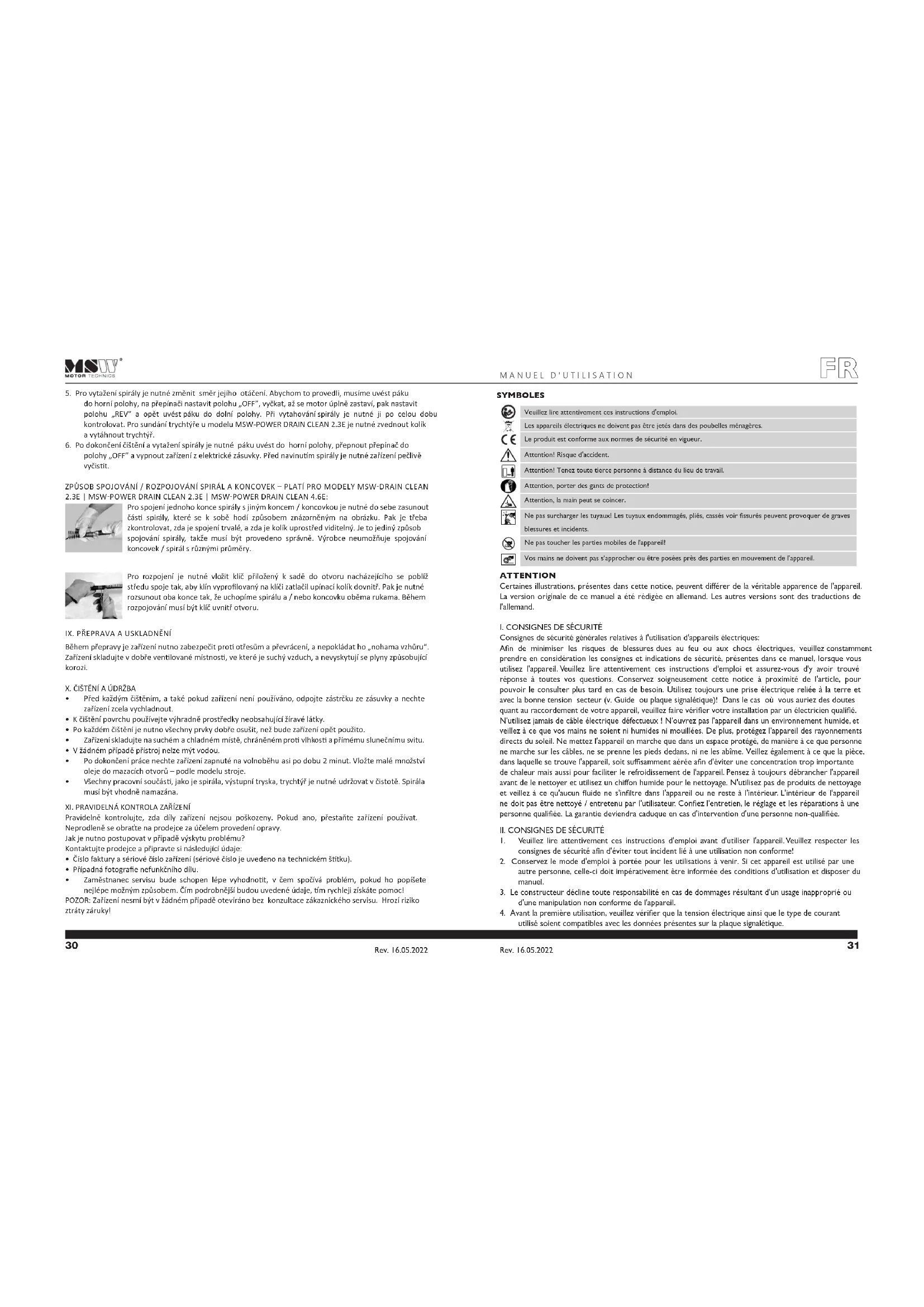 la spirale dans l'ouverture, après la mise sous tension de l'appareil, ne se tournent ainsi pas et les enroulent. Positionnez l’interrupteur moteur, placé sur le moteur, sur la position FOR. Le moteur commence alors à travailler mais la spirale ne commencera à tourner que lorsque le levier sera abaissé. Introduisez la longueur correspondante de la spirale (déjà extraite de l'appareil) dans l'ouverture de la canalisation. Utilisez des gants de protection! Si la spirale est positionnée à l'endroit correspondant, abaissez le levier. Pour introduire d'avantage de spirale dans l'ouverture, relevez le levier, ce qui interrompt le fonctionnement de la spirale, puis insérez d'avantage de longueur de la spirale pour actionner de nouveau le levier vers le bas. ATTENTION! Lorsque vous vous trouvez à proximité de la spirale, veuillez faire attention aux valeurs de couples actuelles. À tout moment, la spirale peut se déplacer toute seule et ce, même si l'appareil n'est pas en état de marche. Un entonnoir est utilisé à la place de la spirale pour le modèle MSW-POWER DRAIN CLEAN 2.3E. Il faut placer l'appareil à environ 50 cm de la canalisation à nettoyer, l’interrupteur moteur, situé sur le moteur, doit être positionné sur "FOR" et le levier, abaissé. La spirale doit être insérée dans l'ouverture de telle sorte que, une fois l'appareil en état de marche, elle ne tourne et ne se rembobine pas. Abaissez ensuite le levier pour que le processus de débouchage commence. Le modèle MSW-POWER DRAIN CLEAN 2.3E dispose d'un levier de verrouillage spécial. Pour l'actionner, abaissez le levier et bloquez-le avec la bride (située à côté du raccord de l'entonnoir) en la tournant vers la droite. Cette bride permet à la poignée d'être xe et ainsi de transporter agréablement l'appareil. Pour retirer ce blocage, actionnez le levier vers le bas et tournez la bride vers la gauche. Vous devez être prêt et capable d'arrêter l'appareil immédiatement en cas de problème. Rev. 16.05.2022