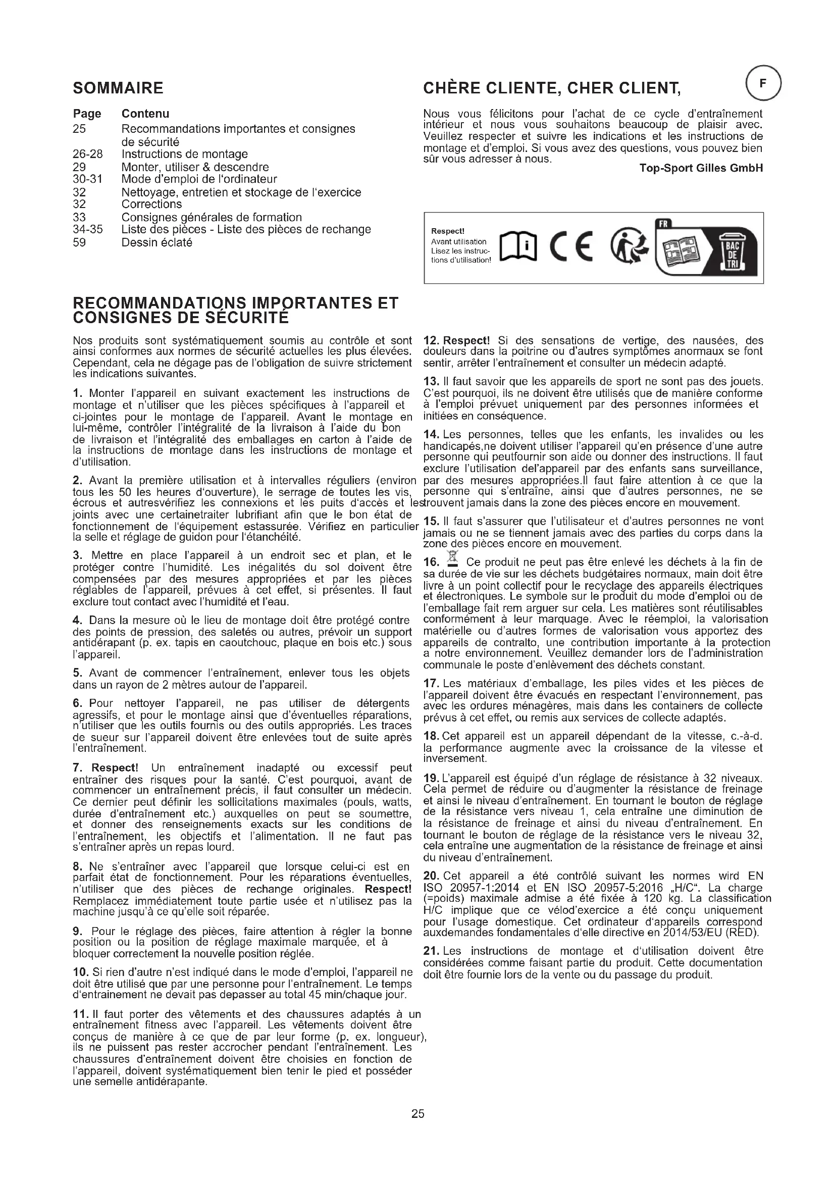 Nos produits sont systématiquement soumis au contrôle et sont ainsi conformes aux normes de sécurité actuelles les plus élevées. Cependant, cela ne dégage pas de l’obligation de suivre strictement les indications suivantes. Top-Sport Gilles GmbH Respect! Avant utilisation Lisez les instruc- tions d’utilisation! Recommandations importantes et consignes de sécurité Instructions de montage Monter, utiliser & descendre Mode d’emploi de l‘ordinateur Nettoyage, entretien et stockage de l‘exercice Corrections Consignes générales de formation Liste des pièces - Liste des pièces de rechange Dessin éclaté