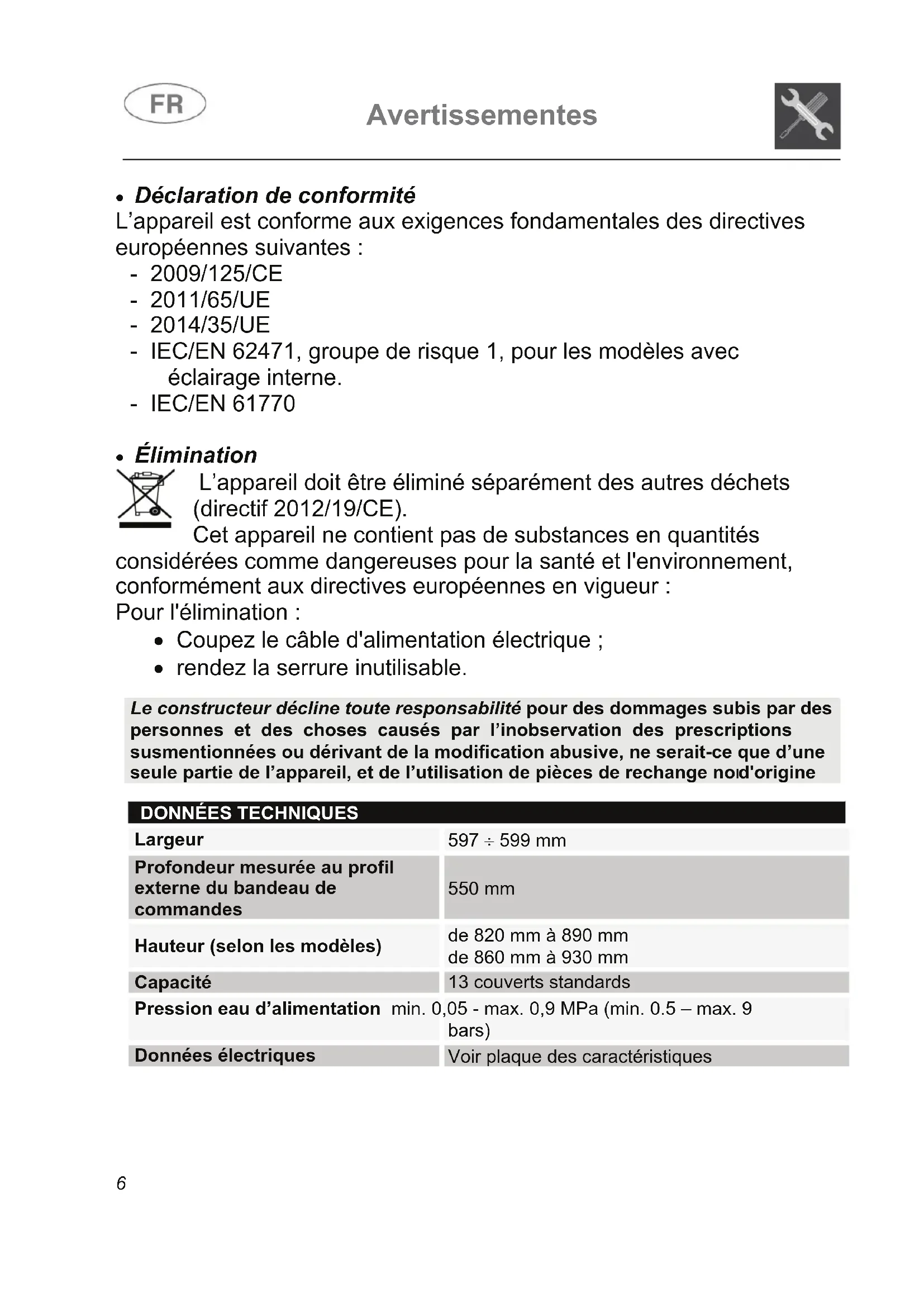 13 couverts standards Pression eau d’alimentation min. 0,05 - max. 0,9 MPa (min. 0.5 – max. 9 bars) Données électriques