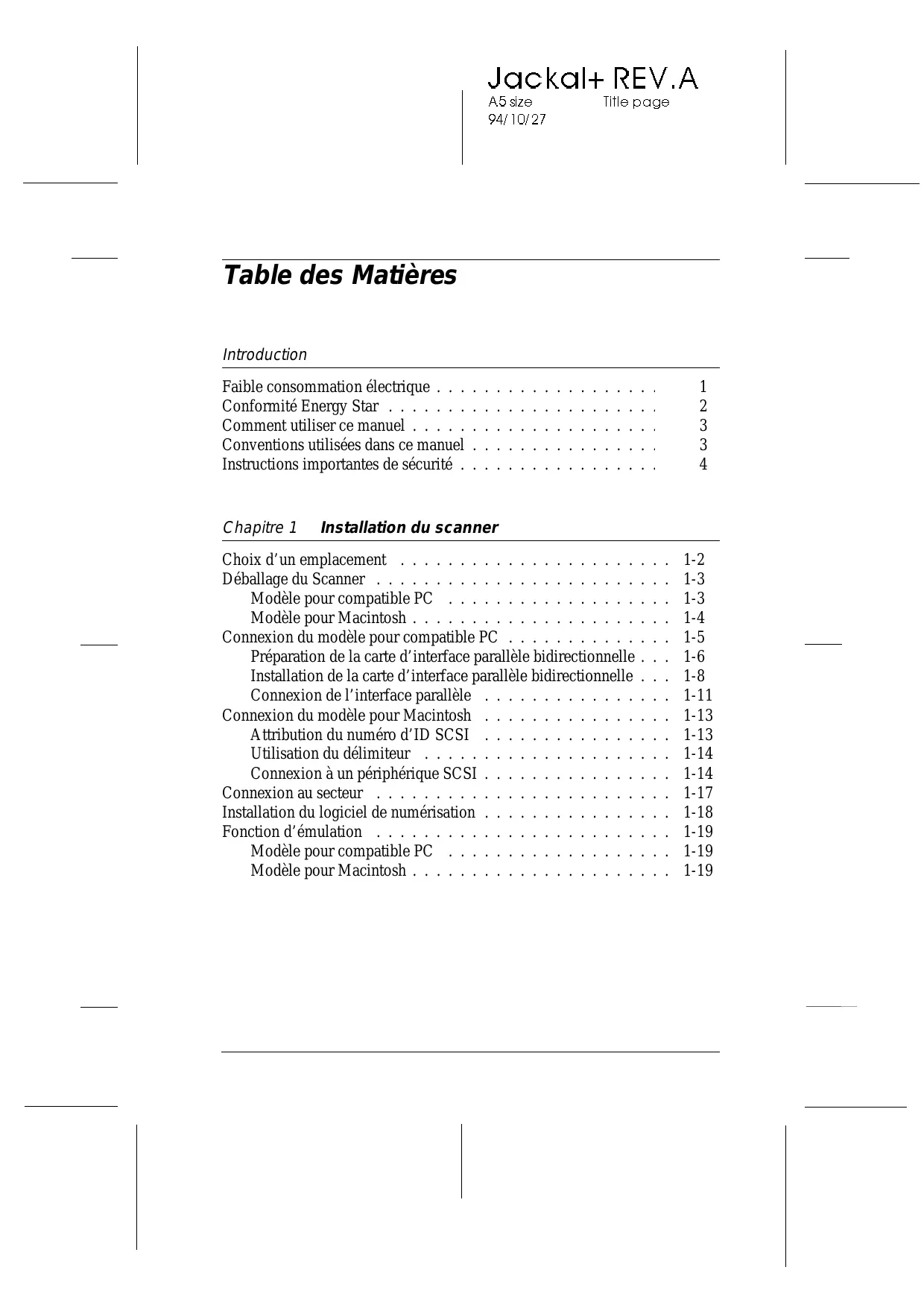 Jackal+ pre-REV.A A5 size Introduction 94/10/06 Instructions importantes de sécurité Lisez soigneusement toutes ces informations et conservez-les pour pouvoir les consulter ultérieurement. Suivez tous les avertissements et instructions qui figurent sur le scanner.