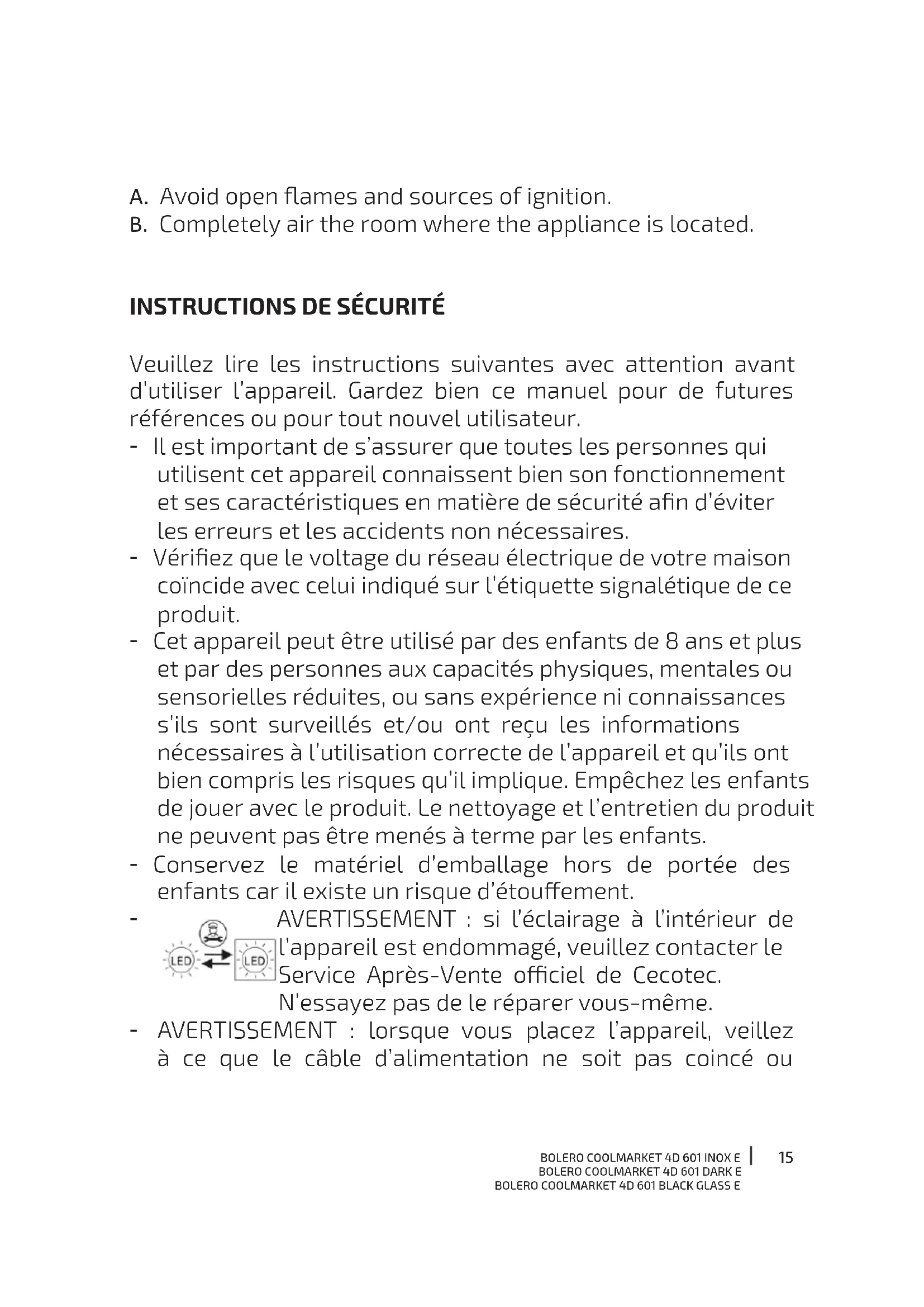 Veuillez lire les instructions suivantes avec attention avant d’utiliser l’appareil. Gardez bien ce manuel pour de futures références ou pour tout nouvel utilisateur. - Il est important de s’assurer que toutes les personnes qui utilisent cet appareil connaissent bien son fonctionnement et ses caractéristiques en matière de sécurité an d’éviter les erreurs et les accidents non nécessaires. - Vériez que le voltage du réseau électrique de votre maison coïncide avec celui indiqué sur l’étiquette signalétique de ce produit. - Cet appareil peut être utilisé par des enfants de 8 ans et plus et par des personnes aux capacités physiques, mentales ou sensorielles réduites, ou sans expérience ni connaissances s’ils sont surveillés et/ou ont reçu les informations nécessaires à l’utilisation correcte de l’appareil et qu’ils ont bien compris les risques qu’il implique. Empêchez les enfants de jouer avec le produit. Le nettoyage et l’entretien du produit ne peuvent pas être menés à terme par les enfants. - Conservez le matériel d’emballage hors de portée des enfants car il existe un risque d’étouement. - AVERTISSEMENT : si l’éclairage à l’intérieur de l’appareil est endommagé, veuillez contacter le Service Après-Vente ociel de Cecotec. N’essayez pas de le réparer vous-même. - AVERTISSEMENT : lorsque vous placez l’appareil, veillez à ce que le câble d’alimentation ne soit pas coincé ou16