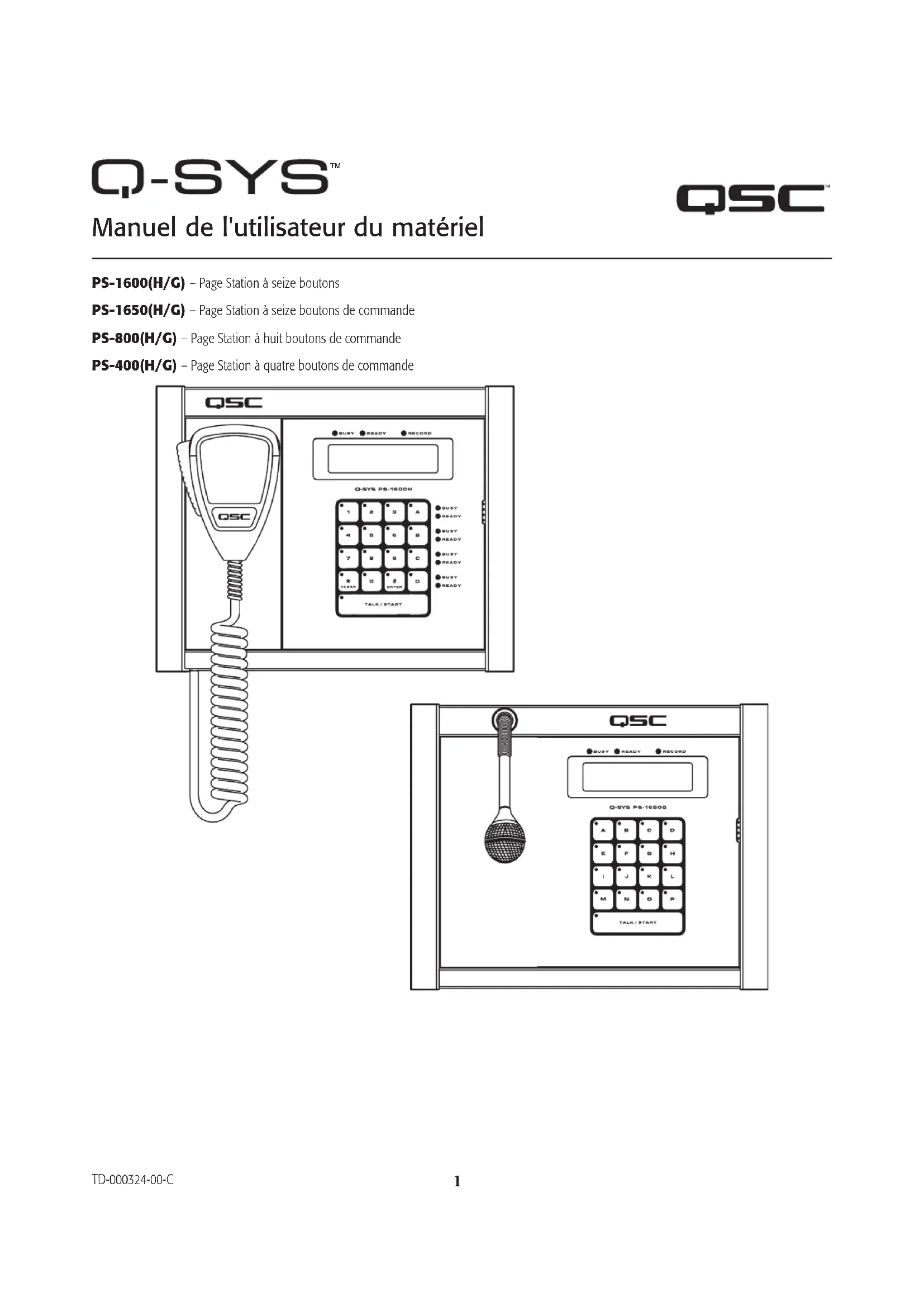 TD-000324-00-C Description de la Page Station La Page Station Q-Sys est une station d'appel en réseau qui se connecte à un système Q-Sys via Q-LAN. Tout l'audio arrivant ou partant de la Page Station utilise le réseau Q-LAN. La Page Station fournit deux interfaces réseau Q-LAN pour connexion au système Q-Sys. Ceci permet la connexion des stations d'appel à deux ports de commutation ou leur déploiement sur deux réseaux séparés pour la prise en charge de différents modes de fonctionnement redondants pour les applications critiques. La Q-SYS Page Station est proposée dans quatre modèles différents, indiqués ci-dessous. Chacun de ces modèles a un microphone portable (indiqué par un H dans le numéro de modèle), un microphone col de cygne (indiqué par un G dans le numéro de modèle). Les différences sont indiquées ci-dessous. Modèle Nombre total de boutons Boutons de commande Commandes du pavé de touches Sécurité PS-400 4 Quatre boutons Non Non PS-800 8 Huit boutons Non Non PS-1600 16 Quatre boutons Oui Oui PS-1650 16 Seize boutons Non Non