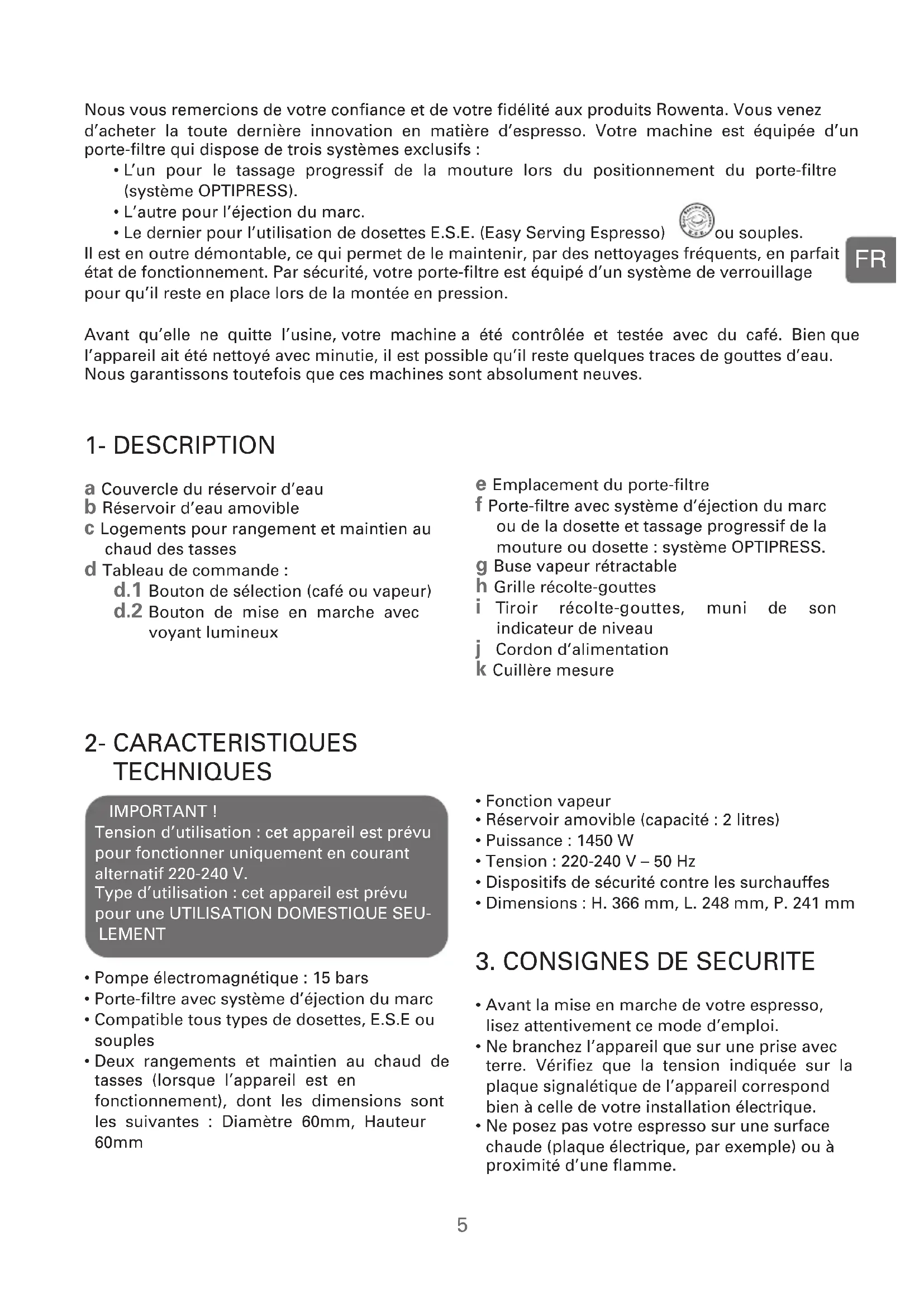 a Couvercle du réservoir d’eau b Réservoir d’eau amovible c Logements pour rangement et maintien au chaud des tasses d Tableau de commande : d.1 Bouton de sélection (café ou vapeur) d.2 Bouton de mise en marche avec voyant lumineux d.3 Bouton de sélection du volume de café d.4 Bouton 1 tasse d.5 Bouton 2 tasses e Emplacement du porte-filtre f Porte-filtre avec système d’éjection du marc ou de la dosette et tassage progressif de la mouture ou dosette : système OPTIPRESS. g Buse vapeur rétractable h Grille récolte-gouttes i Tiroir récolte-gouttes, muni de son indicateur de niveau j Cordon d’alimentation k Cuillère mesure Nous vous remercions de votre confiance et de votre fidélité aux produits Rowenta. Vous venez d’acheter la toute dernière innovation en matière d’espresso. Votre machine est équipée d’un porte-filtre qui dispose de trois systèmes exclusifs :