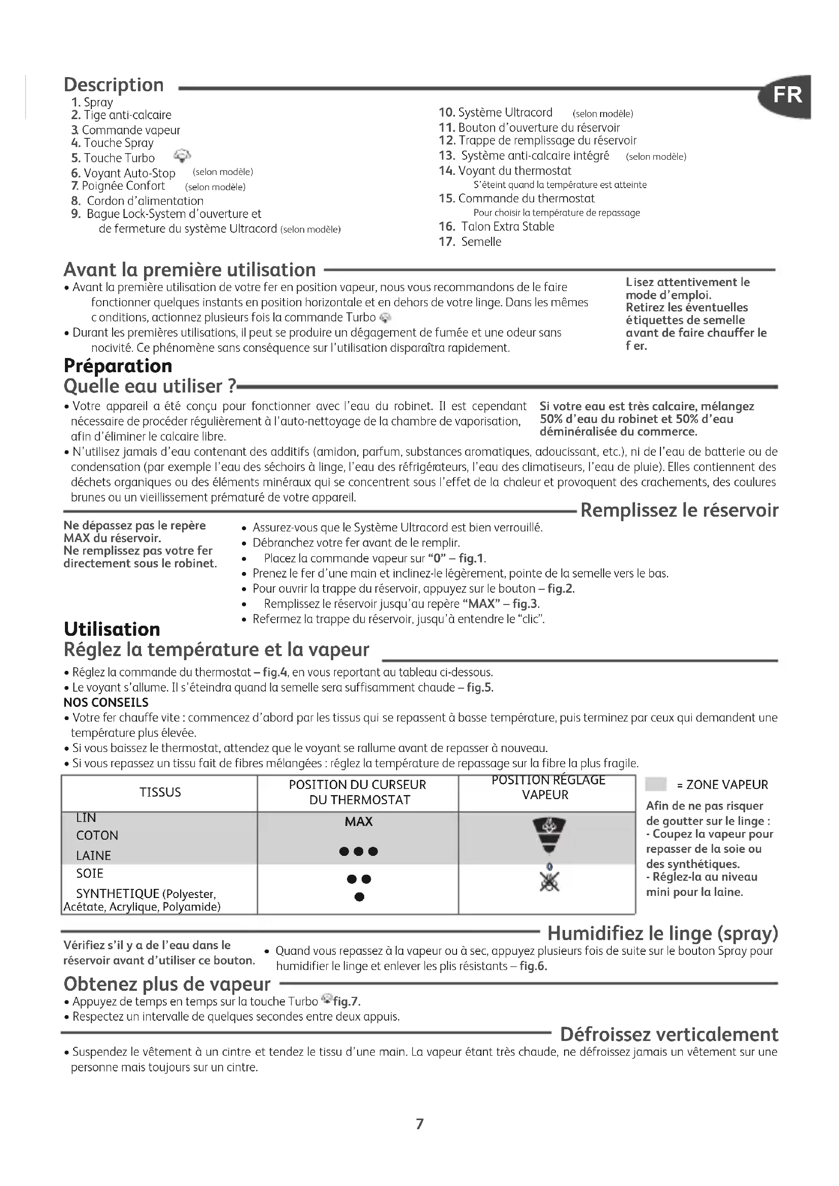 . Commande vapeur4. Touche Spray5. Touche Turbo 6. Voyant Auto-Stop (selon modèle) . Poignée Confort (selon modèle)8. Cordon d’alimentation9. Bague Lock-System d’ouverture etde fermeture du système Ultracord (selon modèle)10. Système Ultracord (selon modèle)11. Bouton d’ouverture du réservoir 2. Trappe de remplissage du réservoir13. Système anti-calcaire intégré (selon modèle)14. Voyant du thermostatS’éteint quand la température est atteinte15. Commande du thermostatPour choisir la température de repassage16. Talon Extra Stable17. Semelle Avant la première utilisation