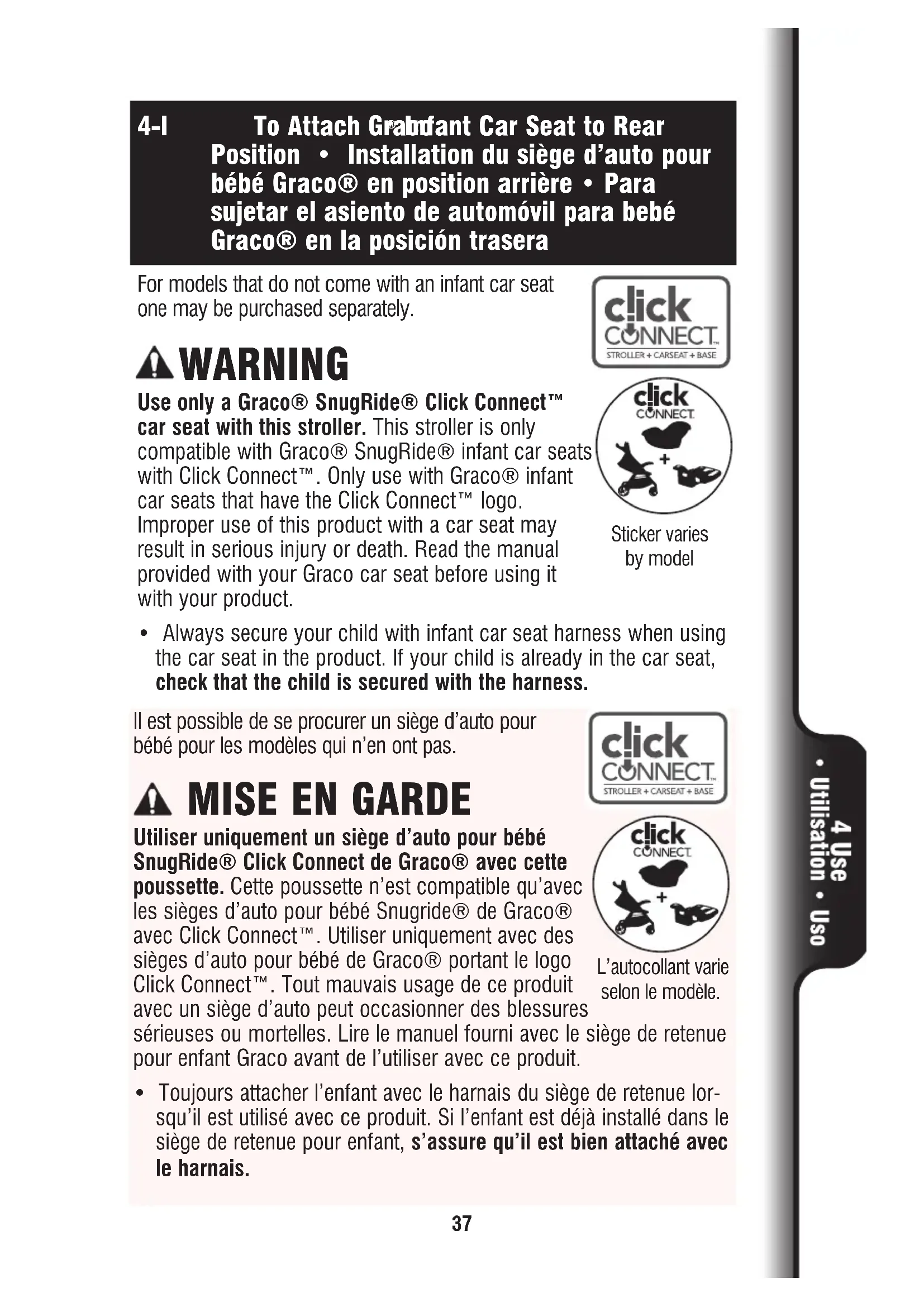 debout sur la plateforme et de tenir les poignées. SNAP! ENCLENCHEZ! ¡CRAC!37 4-I To Attach Graco