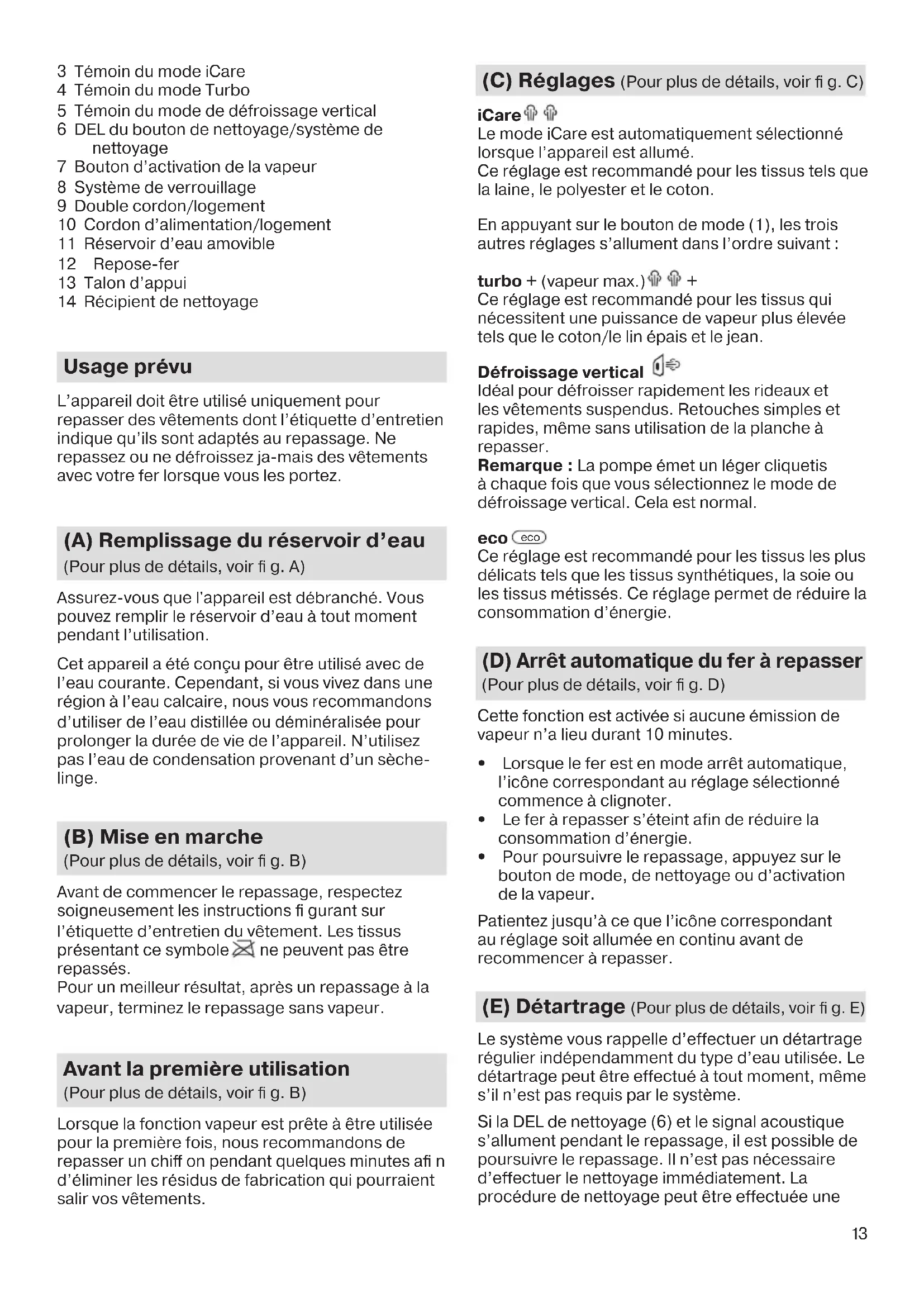 Ce réglage est recommandé pour les tissus qui nécessitent une puissance de vapeur plus élevée tels que le coton/le lin épais et le jean. Défroissage vertical Idéal pour défroisser rapidement les rideaux et les vêtements suspendus. Retouches simples et rapides, même sans utilisation de la planche à repasser. Remarque : La pompe émet un léger cliquetis à chaque fois que vous sélectionnez le mode de défroissage vertical. Cela est normal. eco eco Ce réglage est recommandé pour les tissus les plus délicats tels que les tissus synthétiques, la soie ou les tissus métissés. Ce réglage permet de réduire la consommation d’énergie. (D) Arrêt automatique du fer à repasser (Pour plus de détails, voir fi g. D) Cette fonction est activée si aucune émission de vapeur n’a lieu durant 10 minutes.