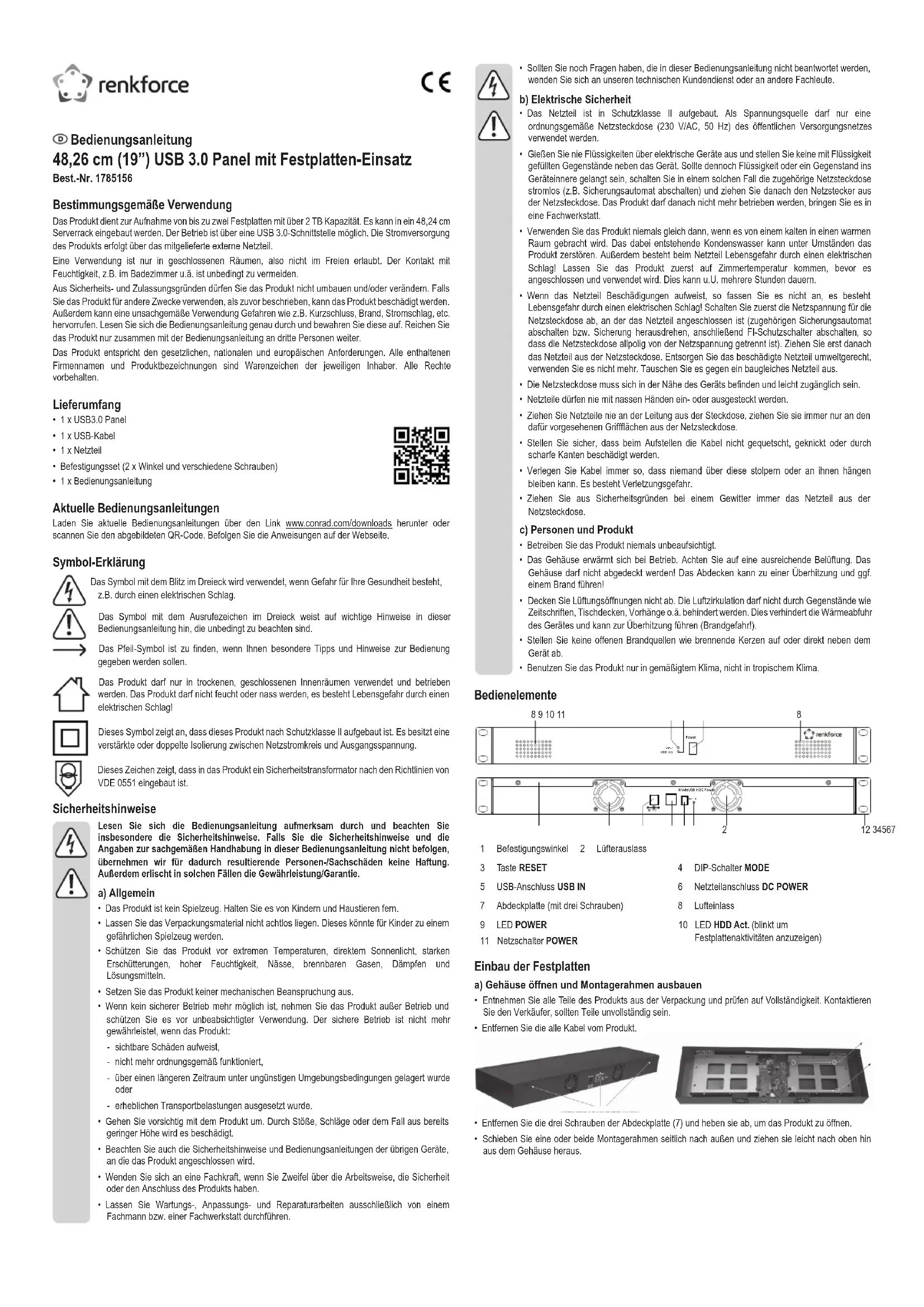 - Faites glisser un ou deux cadres de montage sur le côté vers l'extérieur et tirez légèrement vers le haut pour les sortir du boîtier. Mode d’emploi 48,26 cm (19") Panneau USB 3.0 avec insertion de disques durs Nº de commande : 1785156 Utilisation prévue Le produit peut accueillir jusqu’à deux disques durs d’une capacité supérieure à 2 To. Il peut être utilisé dans un rack de serveur rack de 48,24 cm. Utilisation possible via interface USB 3.0. L'alimentation électrique de ce produit s’effectue via le bloc d'alimentation externe fourni. L’utilisation est uniquement autorisée en intérieur, dans des locaux fermés ; l’utilisation en plein air est interdite. Évitez impérativement tout contact avec l’humidité, par ex. dans la salle de bains, etc. Pour des raisons de sécurité et d’homologation, toute transformation et/ou modication du produit est interdite. Si vous utilisez le produit à d’autres ns que celles décrites précédemment, vous risquez de l’endommager. Par ailleurs, une utilisation incorrecte peut être source de dangers tels que court-circuit, incendie, électrocution. Lisez attentivement le mode d’emploi et conservez-le. Ne donnez le produit à un tiers qu’accompagné de son mode d’emploi. Le produit est conforme aux exigences des directives européennes et nationales en vigueur. Tous les noms d’entreprises et appellations de produits contenus dans ce mode d’emploi sont des marques déposées de leurs propriétaires respectifs. Tous droits réservés. Contenu