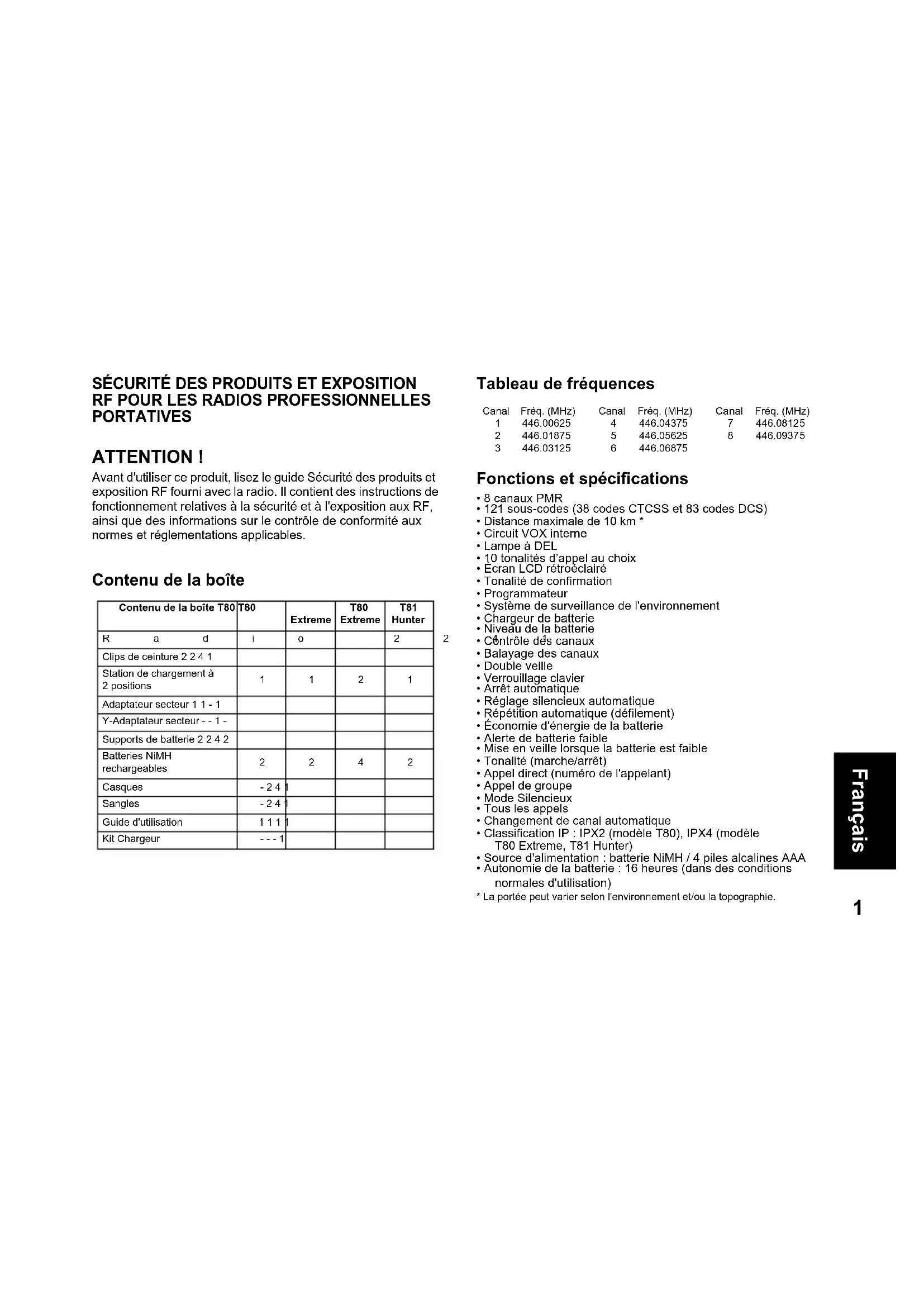 - 8 canaux PMR• 121 sous-codes (38 codes CTCSS et 83 codes DCS)• Distance maximale de 10 km *• Circuit VOX interne• Lampe à DEL• 10 tonalités d’appel au choix• Écran LCD rétroéclairé• Tonalité de confirmation• Programmateur• Système de surveillance de l'environnement• Chargeur de batterie• Niveau de la batterie• Contrôle des canaux• Balayage des canaux• Double veille• Verrouillage clavier• Arrêt automatique • Réglage silencieux automatique• Répétition automatique (défilement)• Économie d'énergie de la batterie• Alerte de batterie faible• Mise en veille lorsque la batterie est faible• Tonalité (marche/arrêt)• Appel direct (numéro de l'appelant)• Appel de groupe• Mode Silencieux• Tous les appels• Changement de canal automatique• Classification IP : IPX2 (modèle T80), IPX4 (modèle T80 Extreme, T81 Hunter)• Source d'alimentation : batterie NiMH / 4 piles alcalines AAA• Autonomie de la batterie : 16 heures (dans des conditions normales d'utilisation)* La portée peut varier selon l'environnement et/ou la topographie.Contenu de la boîte T80 T80 Extreme T80 Extreme T81 HunterRadio 2241Clips de ceinture 2 2 4 1Station de chargement à 2 positions Adaptateur secteur 1 1 - 1Y-Adaptateur secteur - - 1 -Supports de batterie 2 2 4 2Batteries NiMH rechargeables Casques - 2 4 1Sangles - 2 4 1Guide d'utilisation 1 1 1 1Kit Chargeur - - - 1 Canal Fréq. (MHz) Canal Fréq. (MHz) Canal Fréq. (MHz)