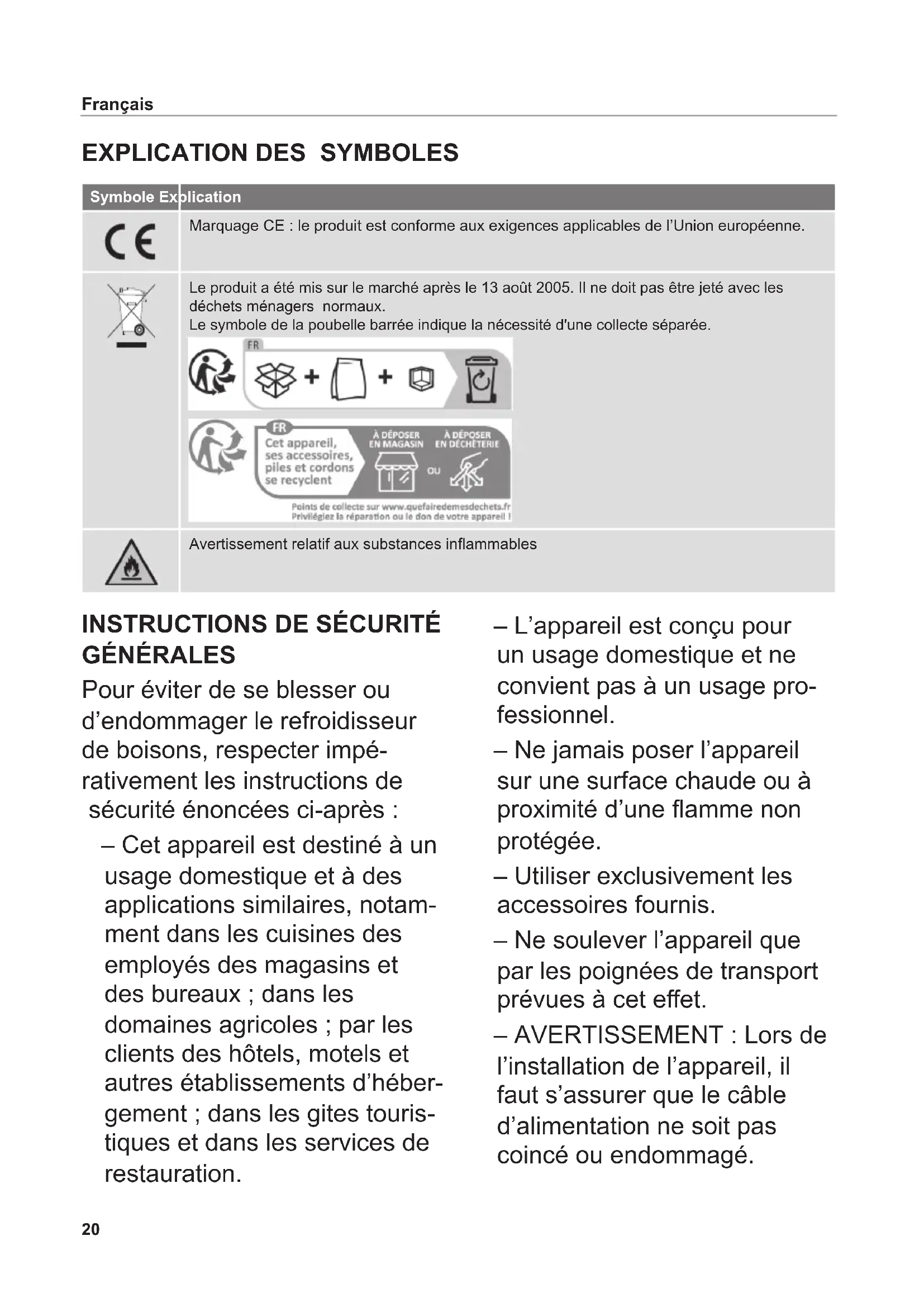D’ÉQUIPEMENTS ÉLECTRIQUES ET ÉLECTRONIQUES (DEEE) Ce symbole indique que ce produit ne doit pas être éliminé avec les déchets municipaux non triés. Il existe un système séparé (gratuit) pour la collecte et le retour des DEEE. Pour plus d’informations, s’adresser à l’administration municipale ou au magasin où le produit a été acheté. Veiller à ce que ce produit soit éliminé correctement contribue à éviter d’éventuelles conséquences négatives pour l’environnement et la santé humaine et à préserver les ressources naturelles. AVERTISSEMENT, danger d’incendie ou d’explosion : Le uide frigorigène et l’huile qu’il contient sont inam- mables ! Le uide frigorigène et l’huile qui s’échappent peuvent s’enammer si leur concentra- tion est susamment élevée et s’ils entrent en contact avec une source de chaleur externe. Les tuyauteries du circuit de réfrigérant et le compresseur ne doivent pas être endom- magés ! Le gaz d’expansion d’isolation (cyclopentane) est inammable !
