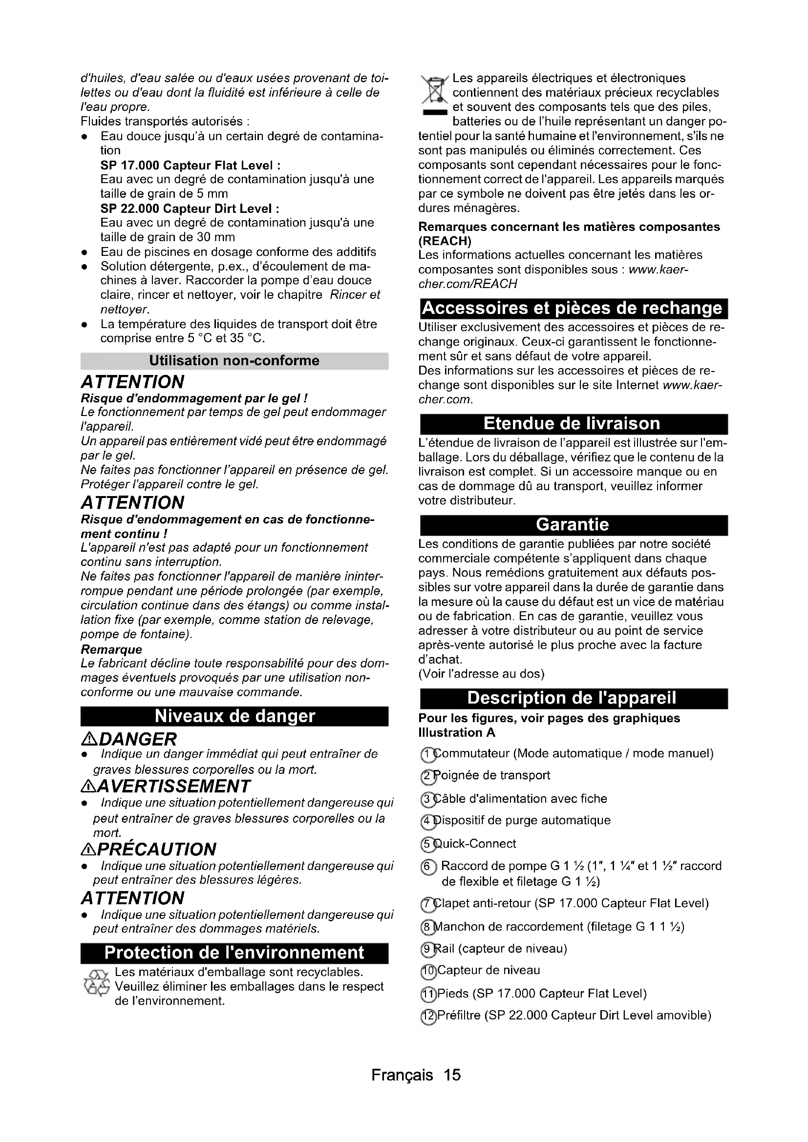 • Déclaration de conformité UE Français 15 d'huiles, d'eau salée ou d'eaux usées provenant de toi- lettes ou d'eau dont la fluidité est inférieure à celle de l'eau propre. Fluides transportés autorisés : ● Eau douce jusqu’à un certain degré de contamina- tion SP 17.000 Capteur Flat Level : Eau avec un degré de contamination jusqu'à une taille de grain de 5 mm SP 22.000 Capteur Dirt Level : Eau avec un degré de contamination jusqu'à une taille de grain de 30 mm ● Eau de piscines en dosage conforme des additifs ● Solution détergente, p.ex., d’écoulement de ma- chines à laver. Raccorder la pompe d’eau douce claire, rincer et nettoyer, voir le chapitre Rincer et nettoyer. ● La température des liquides de transport doit être comprise entre 5 °C et 35 °C. Utilisation non-conforme ATTENTION Risque d'endommagement par le gel ! Le fonctionnement par temps de gel peut endommager l'appareil. Un appareil pas entièrement vidé peut être endommagé par le gel. Ne faites pas fonctionner l’appareil en présence de gel. Protéger l'appareil contre le gel. ATTENTION Risque d'endommagement en cas de fonctionne- ment continu ! L'appareil n'est pas adapté pour un fonctionnement continu sans interruption. Ne faites pas fonctionner l'appareil de manière ininter- rompue pendant une période prolongée (par exemple, circulation continue dans des étangs) ou comme instal- lation fixe (par exemple, comme station de relevage, pompe de fontaine). Remarque Le fabricant décline toute responsabilité pour des dom- mages éventuels provoqués par une utilisation non- conforme ou une mauvaise commande. Niveaux de danger DANGER ● Indique un danger immédiat qui peut entraîner de graves blessures corporelles ou la mort. 몇 AVERTISSEMENT ● Indique une situation potentiellement dangereuse qui peut entraîner de graves blessures corporelles ou la mort. 몇 PRÉCAUTION ● Indique une situation potentiellement dangereuse qui peut entraîner des blessures légères. ATTENTION ● Indique une situation potentiellement dangereuse qui peut entraîner des dommages matériels. Protection de l'environnement Les matériaux d'emballage sont recyclables. Veuillez éliminer les emballages dans le respect de l’environnement. Les appareils électriques et électroniques contiennent des matériaux précieux recyclables et souvent des composants tels que des piles, batteries ou de l’huile représentant un danger po- tentiel pour la santé humaine et l'environnement, s'ils ne sont pas manipulés ou éliminés correctement. Ces composants sont cependant nécessaires pour le fonc- tionnement correct de l'appareil. Les appareils marqués par ce symbole ne doivent pas être jetés dans les or- dures ménagères. Remarques concernant les matières composantes (REACH) Les informations actuelles concernant les matières composantes sont disponibles sous : www.kaer- cher.com/REACH Accessoires et pièces de rechange Utiliser exclusivement des accessoires et pièces de re- change originaux. Ceux-ci garantissent le fonctionne- ment sûr et sans défaut de votre appareil. Des informations sur les accessoires et pièces de re- change sont disponibles sur le site Internet www.kaer- cher.com. Etendue de livraison L’étendue de livraison de l’appareil est illustrée sur l'em- ballage. Lors du déballage, vérifiez que le contenu de la livraison est complet. Si un accessoire manque ou en cas de dommage dû au transport, veuillez informer votre distributeur. Garantie Les conditions de garantie publiées par notre société commerciale compétente s’appliquent dans chaque pays. Nous remédions gratuitement aux défauts pos- sibles sur votre appareil dans la durée de garantie dans la mesure où la cause du défaut est un vice de matériau ou de fabrication. En cas de garantie, veuillez vous adresser à votre distributeur ou au point de service après-vente autorisé le plus proche avec la facture d’achat. (Voir l'adresse au dos) Description de l'appareil Pour les figures, voir pages des graphiques Illustration A 1 Commutateur (Mode automatique / mode manuel) 2 Poignée de transport 3 Câble d'alimentation avec fiche 4 Dispositif de purge automatique 5 Quick-Connect 6 Raccord de pompe G 1 ½ (1″, 1 ¼″ et 1 ½″ raccord de flexible et filetage G 1 ½) 7 Clapet anti-retour (SP 17.000 Capteur Flat Level) 8 Manchon de raccordement (filetage G 1 1 ½) 9 Rail (capteur de niveau) 10 Capteur de niveau 11 Pieds (SP 17.000 Capteur Flat Level) 12 Préfiltre (SP 22.000 Capteur Dirt Level amovible)16 Français Mise en service DANGER Risque d’électrocution et de blessure ! L'appareil contient des composants électriques et mé- caniques. Débranchez toujours l'appareil de l'alimentation élec- trique avant de l'assembler, de le démonter ou de le net- toyer. Remarque Plus la longueur du flexible est courte et plus le dia- mètre du flexible est grand, plus la puissance de trans- port est élevée. Pour éviter des colmatages de la pompe, utiliser un pré- filtre en cas de diamètre de flexible inférieur à 1 ¼″. ● SP 17.000 Capteur Flat Level : Accessoires ● SP 22.000 Capteur Dirt Level : intégré dans le pied Le raccord de la pompe est équipé d’un système enfi- chable (Quick-Connect). Le manchon de raccordement avec raccord de pompe G 1 ½ est fourni démonté avec l’appareil. Remarque Il est possible de raccorder, sur le raccord de pompe G 1 ½, des flexibles de diamètres 1″, 1 ¼″ et 1 ½″. Pour pouvoir atteindre la granulométrie souhaitée, il convient de choisir un diamètre du flexible suffisam- ment gros et raccourcir l'élément de raccord de pompe en conséquence au niveau des rainures. Même en cas de plus petite taille de grain, il est recommandé d'opter pour un diamètre du flexible plus grand afin d'atteindre un débit élevé. Raccordement du flexible à la pompe : 1 Visser le raccord de pompe G 1 ½ sur le manchon de raccordement. Illustration B 2 Pousser le collie