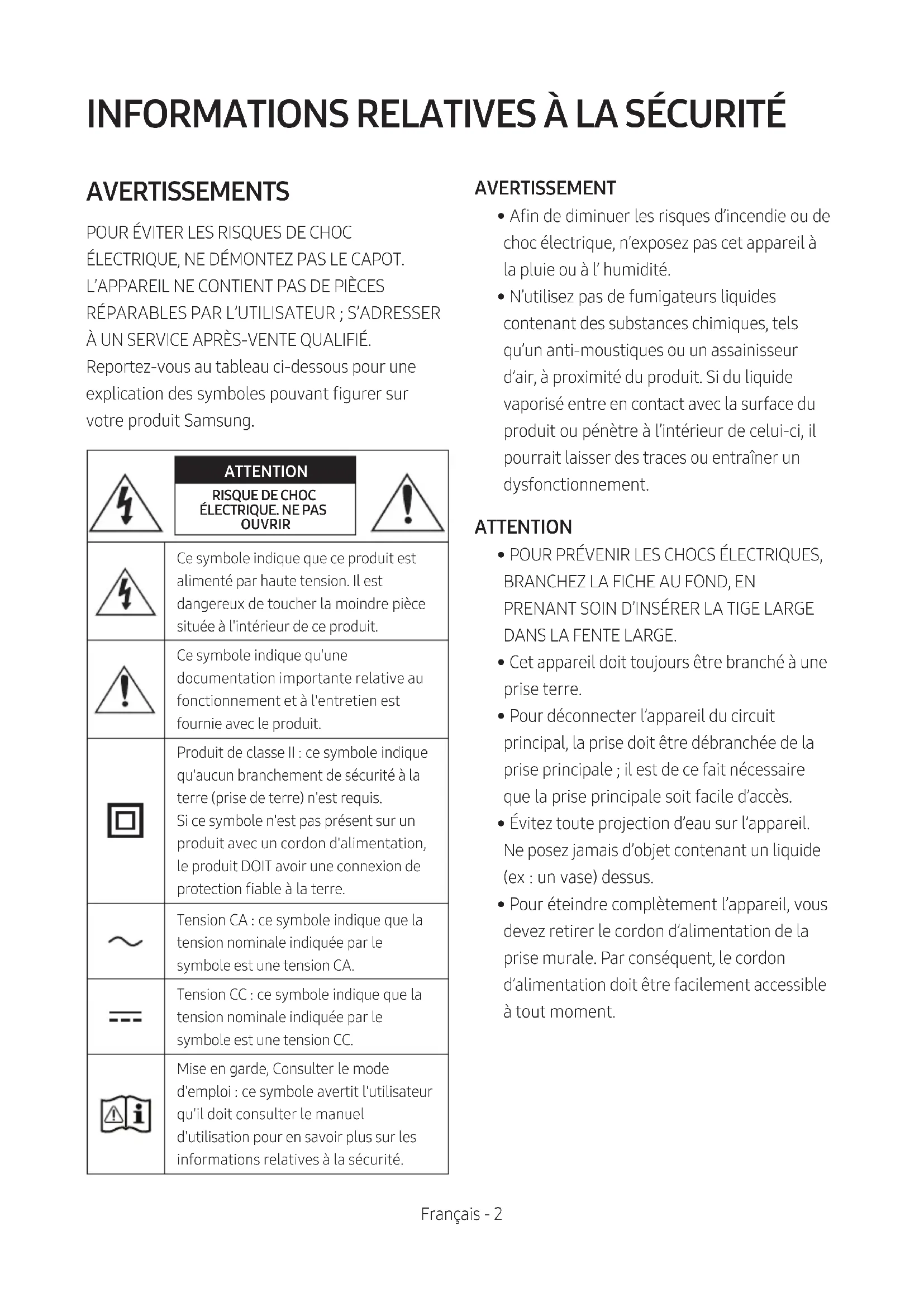 ÉLECTRIQUE, NE DÉMONTEZ PAS LE CAPOT. L’APPAREIL NE CONTIENT PAS DE PIÈCES RÉPARABLES PAR L’UTILISATEUR ; S’ADRESSER À UN SERVICE APRÈS-VENTE QUALIFIÉ. Reportez-vous au tableau ci-dessous pour une explication des symboles pouvant gurer sur votre produit Samsung. ATTENTION RISQUE DE CHOC ÉLECTRIQUE. NE PAS OUVRIRCe symbole indique que ce produit est alimenté par haute tension. Il est dangereux de toucher la moindre pièce située à l'intérieur de ce produit.Ce symbole indique qu'une documentation importante relative au fonctionnement et à l'entretien est fournie avec le produit.Produit de classeII: ce symbole indique qu'aucun branchement de sécurité à la terre (prise de terre) n'est requis. Si ce symbole n'est pas présent sur un produit avec un cordon d'alimentation, le produit DOIT avoir une connexion de protection able à la terre.Tension CA: ce symbole indique que la tension nominale indiquée par le symbole est une tension CA.Tension CC: ce symbole indique que la tension nominale indiquée par le symbole est une tension CC.Mise en garde, Consulter le mode d'emploi: ce symbole avertit l'utilisateur qu'il doit consulter le manuel d'utilisation pour en savoir plus sur les informations relatives à la sécurité. AVERTISSEMENT