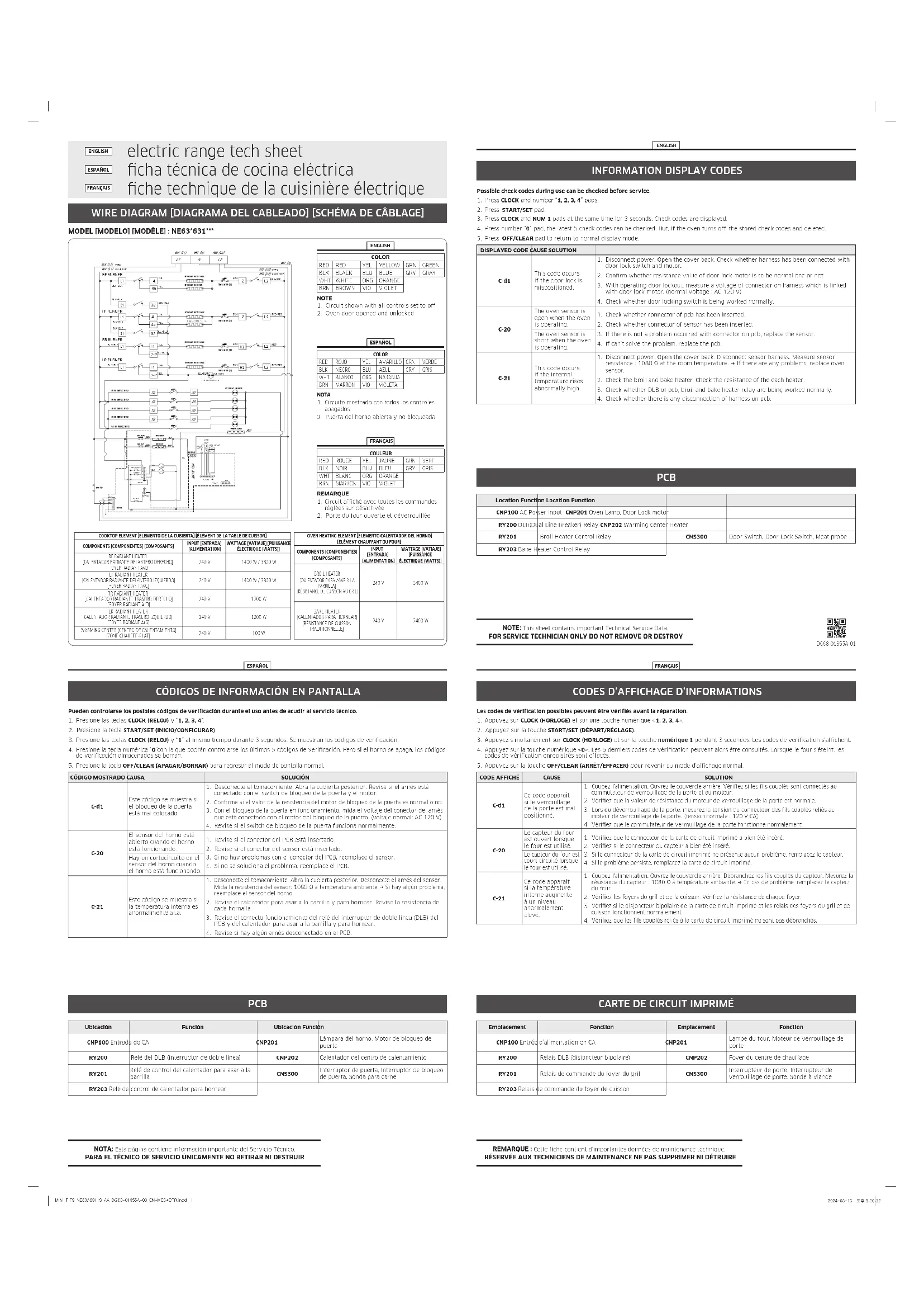Résistance du gril Résistance du gril• Mesurez les valeurs ohmiques des bornes de la résistance après en avoir retiré les ls couplés.• Mesurez la tension des bornes de la résistance après avoir fait fonctionner le four en actionnant la touche du gril.• Environ: 13 à 16Ω (à température ambiante)• Tension aux bornes de la résistance du gril: 240VCA• Remplacez ou réparez les ls couplés.• Remplacez ou réparez la carte de circuit imprimé principale Résistance de cuisson Résistance de cuisson• Mesurez les valeurs ohmiques des bornes de la résistance après en avoir retiré les ls couplés.• Mesurez la tension des bornes de la résistance après avoir fait fonctionner le four en actionnant la touche de cuisson. (Assurez-vous que la tension est mesurée pendant plus d'une minute car la résistance s'éteint et s'allume régulièrement durant son fonctionnement.)• Environ: 18 à 21Ω (à température ambiante)• Tension aux bornes de la résistance de cuisson: 240VCA• Remplacez ou réparez les ls couplés.• Remplacez ou réparez la carte de circuit imprimé principale Verrouillage de la porte Verrouillage de la porte• Mesurez l'état du microcontact et du moteur après avoir retiré les ls couplés de la résistance.• Vériez que le verrouillage fonctionne normalement en appuyant simultanément sur le bouton de réglage du temps de cuisson et la touche de départ différé pendant 3secondes.• Moteur de verrouillage Résistance électrique: 1830 à 2050Ω (à température ambiante) Tension: 120 V• Microcontact COM-NO, COM-NC• Remplacez ou réparez si les ls couplés sont mal connectés ou débranchés. Capteur du four Capteur du four