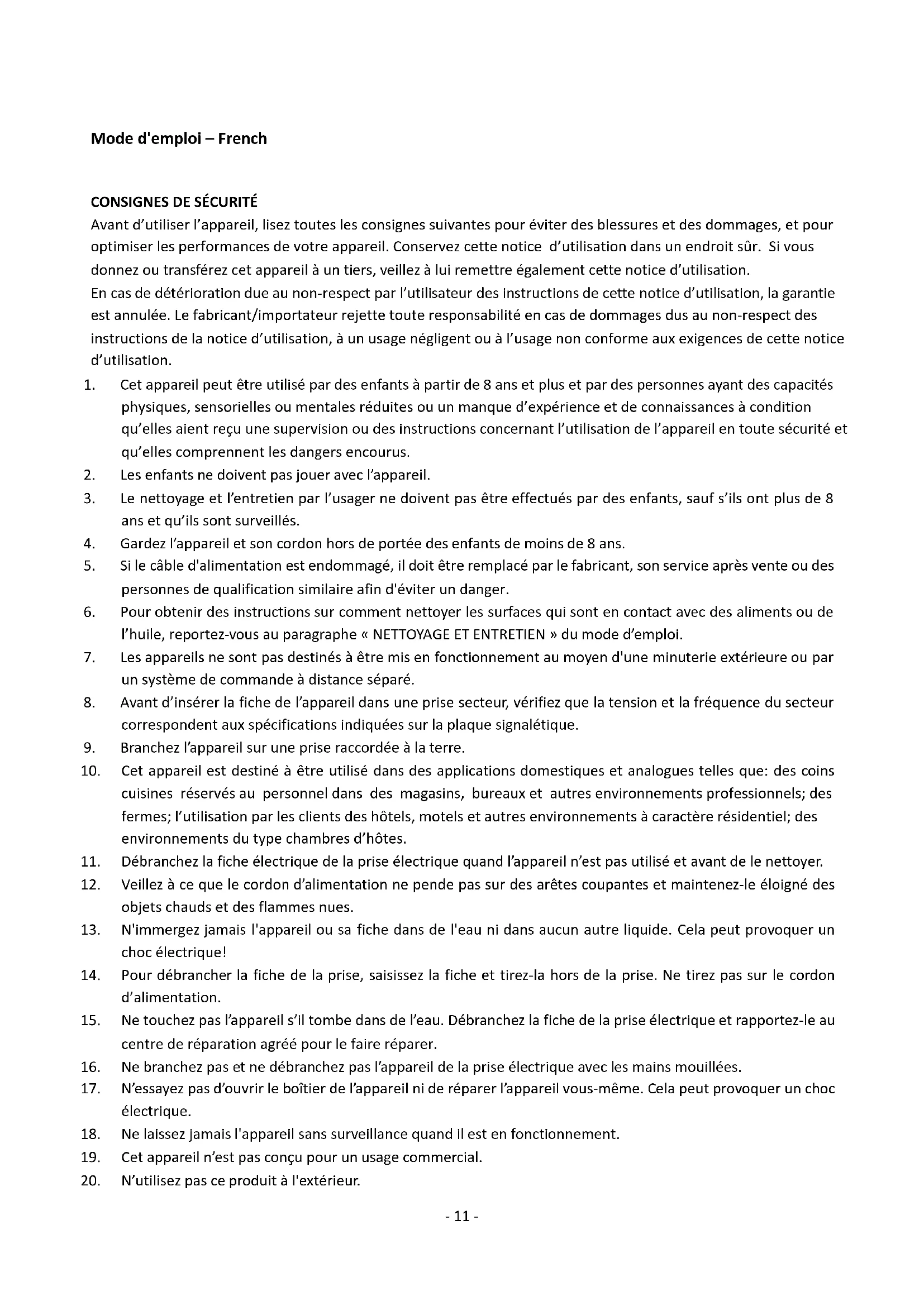 Avant d’utiliser l’appareil, lisez toutes les consignes suivantes pour éviter des blessures et des dommages, et pour optimiser les performances de votre appareil. Conservez cette notice d’utilisation dans un endroit sûr. Si vous donnez ou transférez cet appareil à un tiers, veillez à lui remettre également cette notice d’utilisation. En cas de détérioration due au non-respect par l’utilisateur des instructions de cette notice d’utilisation, la garantie est annulée. Le fabricant/importateur rejette toute responsabilité en cas de dommages dus au non-respect des instructions de la notice d’utilisation, à un usage négligent ou à l’usage non conforme aux exigences de cette notice d’utilisation.