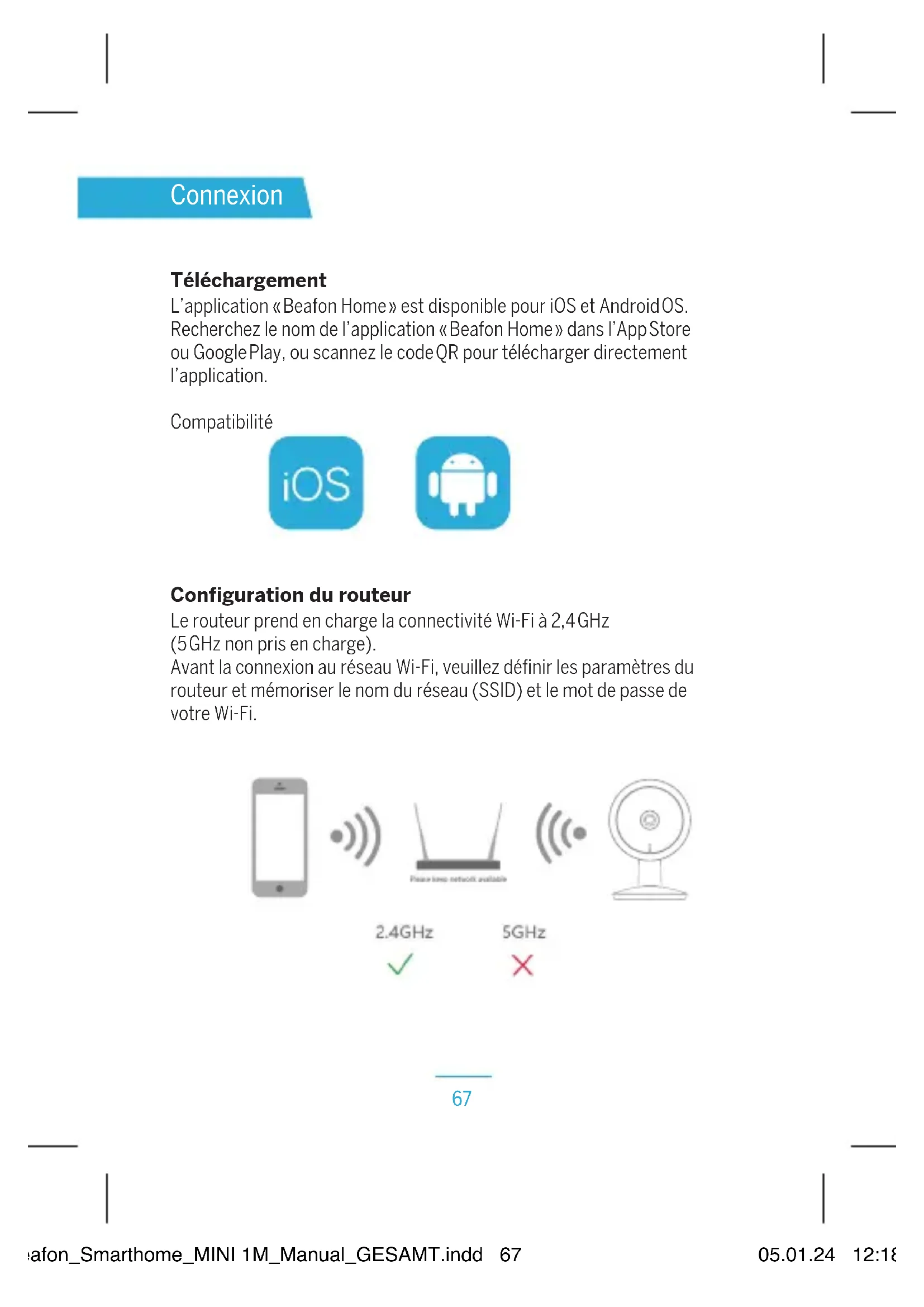 beafon_Smarthome_MINI 1M_Manual_GESAMT.indd 66beafon_Smarthome_MINI 1M_Manual_GESAMT.indd 66 05.01.24 12:1805.01.24 12:1867 Connexion Téléchargement L’application «Beafon Home» est disponible pour iOS et AndroidOS. Recherchez le nom de l’application «Beafon Home» dans l’AppStore ou GooglePlay, ou scannez le codeQR pour télécharger directement l’application. Compatibilité Configuration du routeur Le routeur prend en charge la connectivité Wi-Fi à 2,4GHz (5GHz non pris en charge). Avant la connexion au réseau Wi-Fi, veuillez définir les paramètres du routeur et mémoriser le nom du réseau (SSID) et le mot de passe de votre Wi-Fi. beafon_Smarthome_MINI 1M_Manual_GESAMT.indd 67beafon_Smarthome_MINI 1M_Manual_GESAMT.indd 67 05.01.24 12:1805.01.24 12:1868 Enregistrement Étape1 Ouvrez l’application BeafonHome, puis cliquez sur «Enregistrer». Lisez la «Politique de confidentialité», puis cliquez sur «D’accord». Étape2 Saisissez un numéro de téléphone mobile légal et valide ou une adresse e-mail, puis cliquez sur «Suivant». Saisissez le code de vérification, puis connectez-vous dans l’application. beafon_Smarthome_MINI 1M_Manual_GESAMT.indd 68beafon_Smarthome_MINI 1M_Manual_GESAMT.indd 68 05.01.24 12:1805.01.24 12:1869 Configuration du codeQR Étape1 Ouvrez l’application BeafonHome, puis cliquez sur «Ajouter une Maison». Vous pouvez personnaliser le nom de la famille et les paramètres associés. Étape2 Poursuivez en cliquant sur «Vidéosurveillance» >> «Caméra de sécurité», puis choisissez «Ajouter» ou «+» dès que vous êtes prêt à ajouter la caméra. beafon_Smarthome_MINI 1M_Manual_GESAMT.indd 69beafon_Smarthome_MINI 1M_Manual_GESAMT.indd 69 05.01.24 12:1805.01.24 12:1870 Étape3 Dans l’interface «Ajouter», poursuivez en cliquant sur «Suivant», puis vous devrez saisir les informations de mot de passe du Wi-Fi. Remarque: