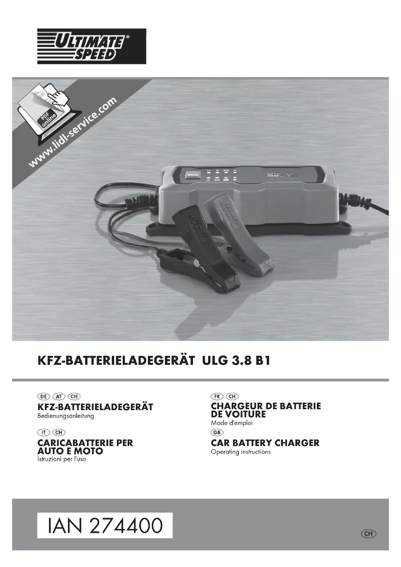Introduction Félicitations pour l'achat de votre nouvel appareil. Vous venez ainsi d'opter pour un produit de grande qualité. Le mode d'emploi fait partie de ce produit. Il contient des remarques importantes concernant la sécurité, l'usage et la mise au rebut. Avant d'utiliser le produit, veuillez vous familiariser avec toutes les consignes d'utilisation et de sécurité. N'utilisez le produit que conformément aux consignes et pour les domaines d'utilisation prévus. Si vous cédez le produit à un tiers, remettez-lui également tous les documents. Utilisation conforme à l'usage prévu L'Ultimate Speed ULG 3.8 B1 est un chargeur de batterie automobile multi-étapes servant à recharger les accumulateurs au plomb de 6 et 12 V (batteries) et à électrolyte (WET), à nattes absorbant l'électro- lyte (AGM) ou à gel électrolytique (GEL), et à effectuer des recharges de compensation. L'appareil ne convient pas pour recharger les batte- ries lithium-ions. L'appareil n'est pas destiné à un usage professionnel et ne doit servir qu'à l'intérieur. Le fabricant n'assume aucune responsabilité pour les dommages résultant d'une utilisation non conforme à l'usage prévu. Matériel livré Chargeur de batterie de voiture ULG 3.8 B1 Ce mode d'emploi Description des pièces Voir la figure A : Affichage LED "Mode 1" Affichage LED "Mode 2" Affichage LED "Mode 3" Affichage LED "Mode 4" Affichage LED "Défaut" Affichage LED "Entièrement rechargé" Affichage LED "Recharge en cours" Affichage LED "Mode Standby" Touche de sélection "MODE" Voir la figure B : Chargeur Trous de fixation Câble d'alimentation Borne de raccordement de pôle positif Borne de raccordement de pôle négatif Caractéristiques techniques Tension de mesure : 220 - 240 V ∼ 50/60 Hz (courant alternatif) Réception de mesure : 60 W Tension de sortie à courant continu de mesure : 6 V / 12 V (courant continu) Courant continu de sortie de mesure : 0,8 A / 3,8 A Fusible (interne): 2 A T2A Température ambiante : 0°C à 40°C Indice de protection: IP 65 Classe de protection: II / (double isolation) Types de batterie : batterie plomb et acide 6 V 1,2 Ah - 14 Ah Batterie plomb et acide 12 V 1,2 Ah - 120 AhFR